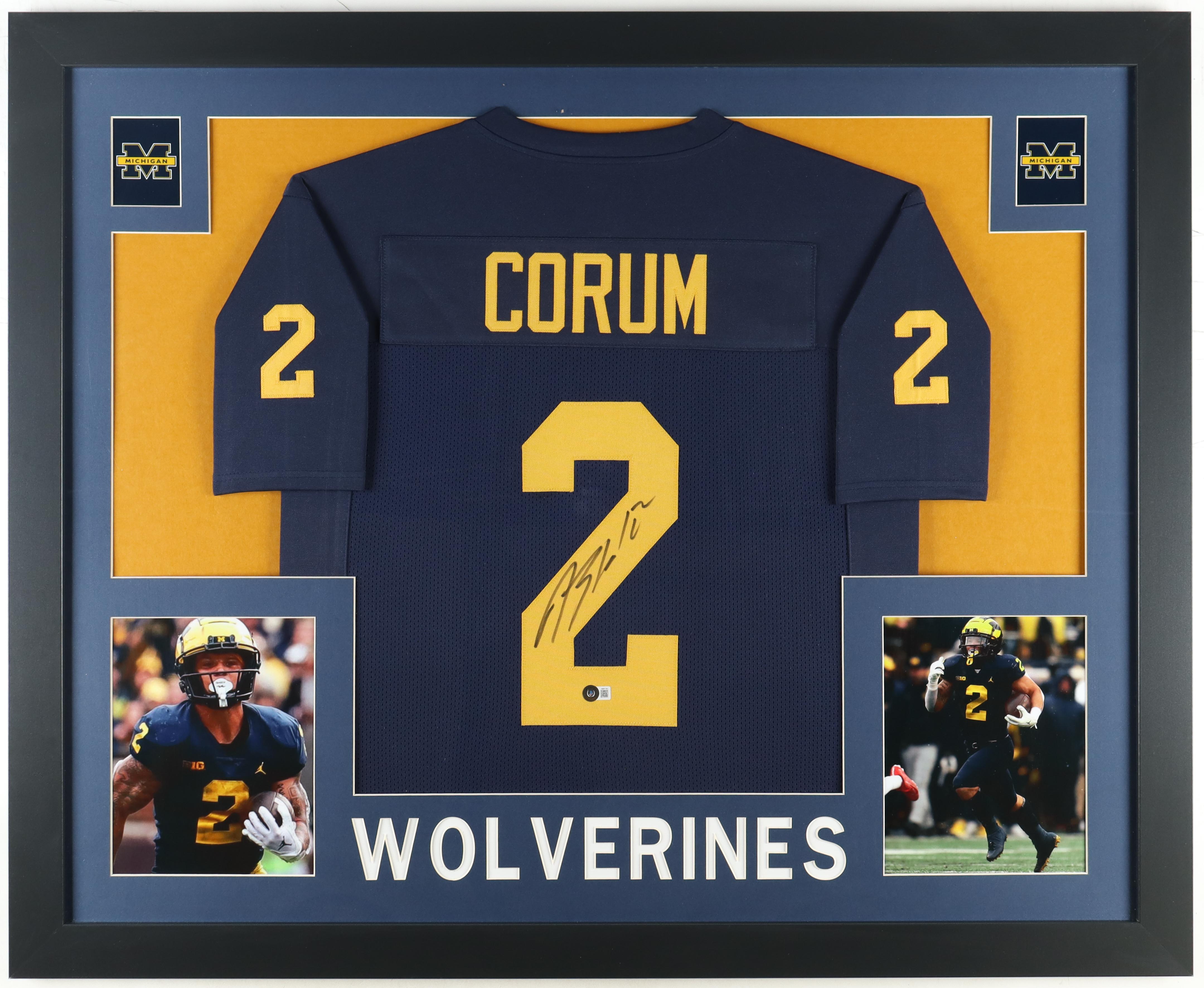 Custom frame measures approximately 34" x 42" in size and features a jersey hand-signed by Blake Corum. The display also includes (2) 8" x 10" photos. Please note that the 8" x 10" photos may be in different order.