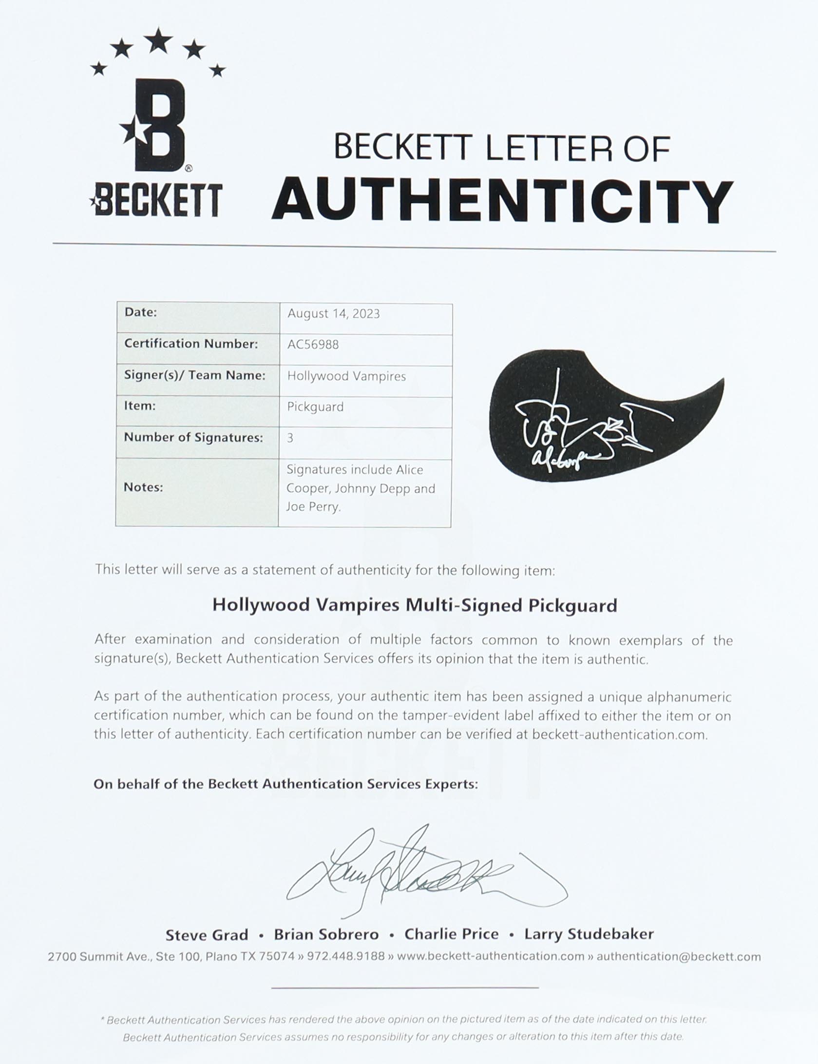 Customized full-size guitar measures approximately 39" in length and is hand-signed on the pick guard by Alice Cooper, Johnny Depp and Joe Perry.