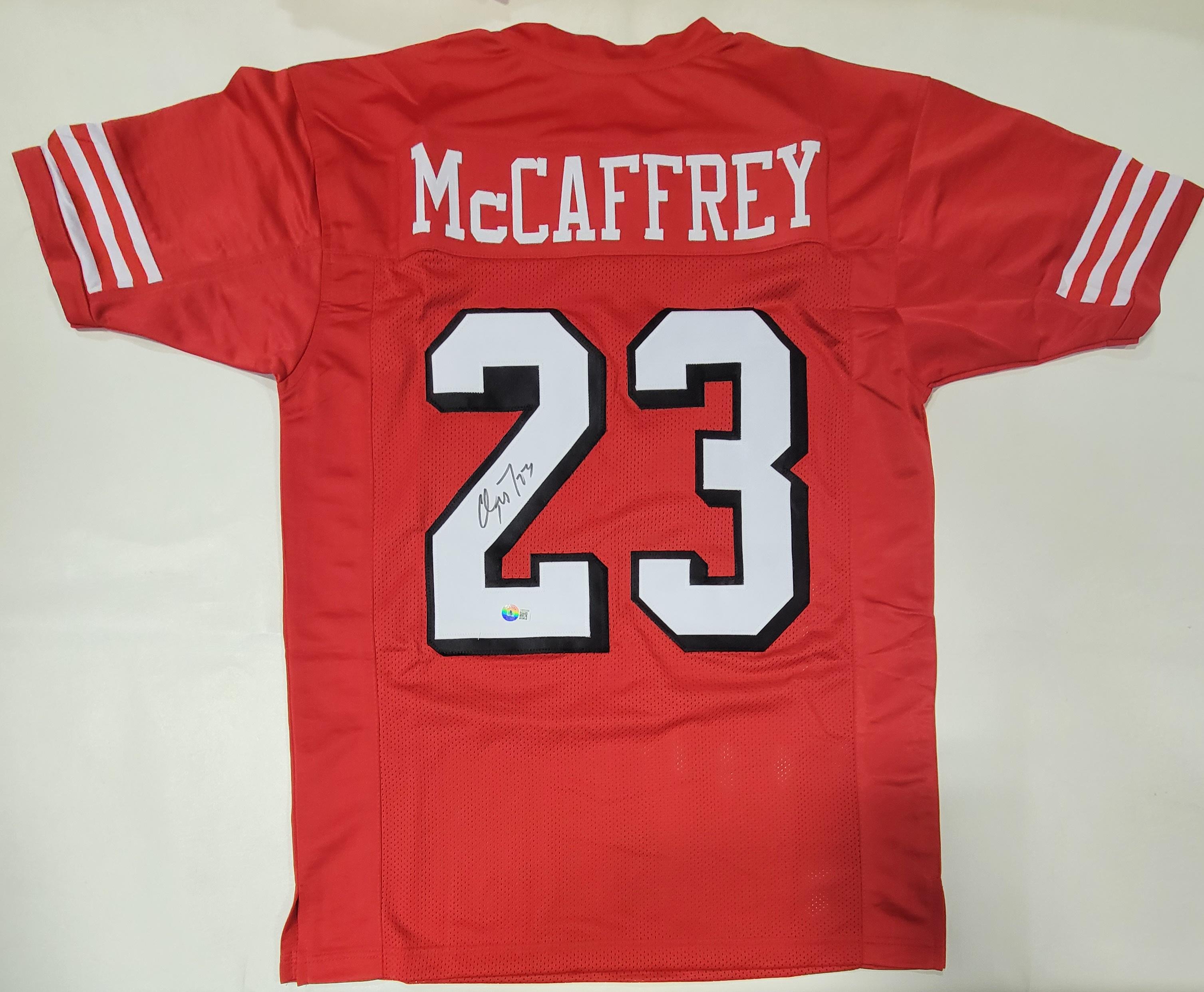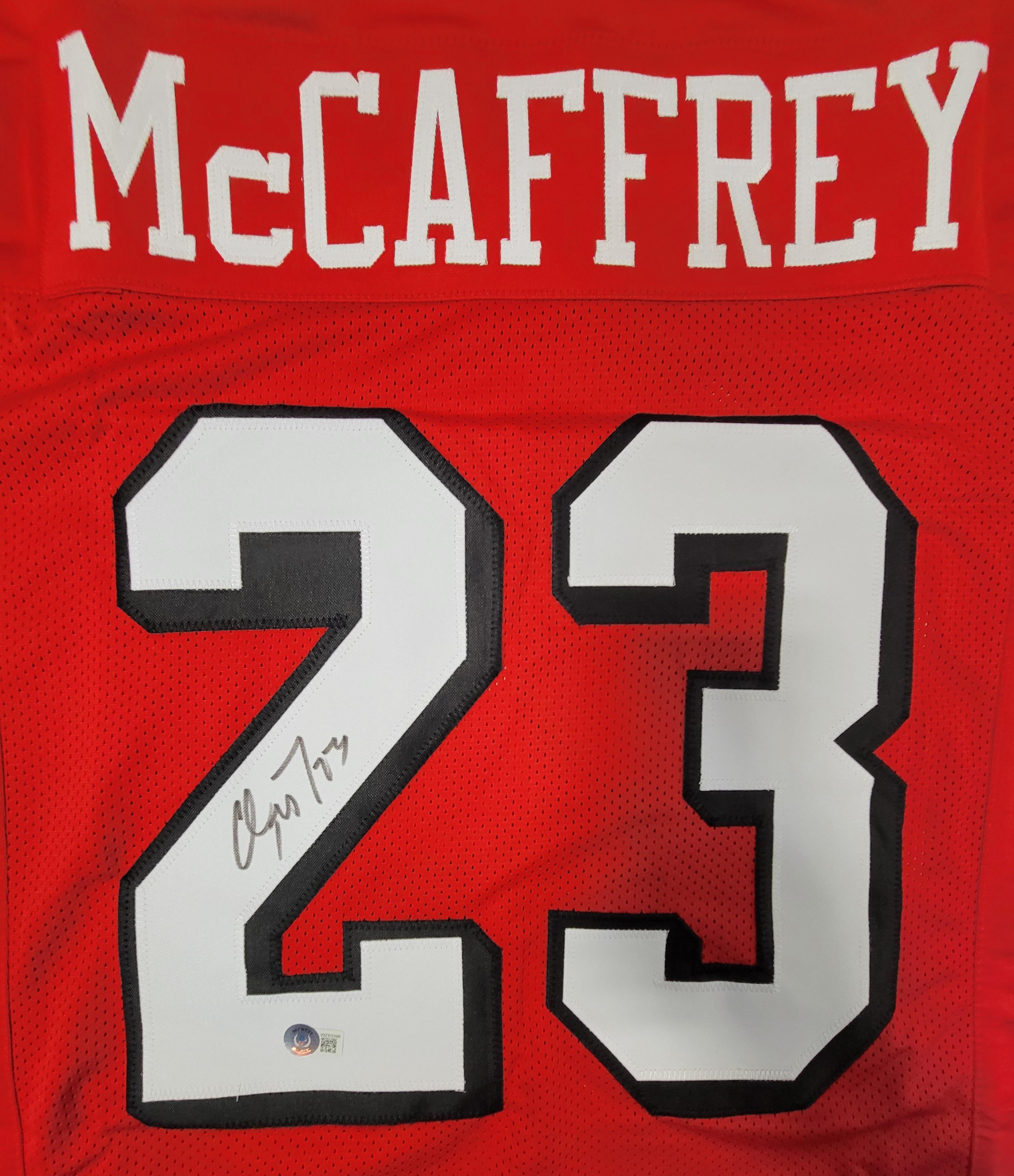 Jersey with everything sewn on, size XL. Hand-signed by Christian McCaffrey.
