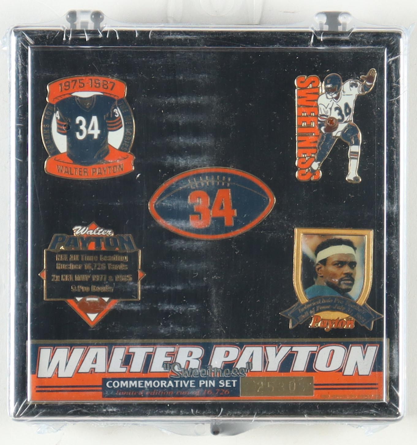 Walter Payton Chicago Bears "Sweetness" commemorative pin set includes (5) pins. Includes display case as shown. Pin set is limited edition and has been numbered #2,530/16,726. Factory sealed.