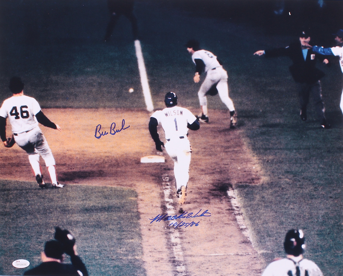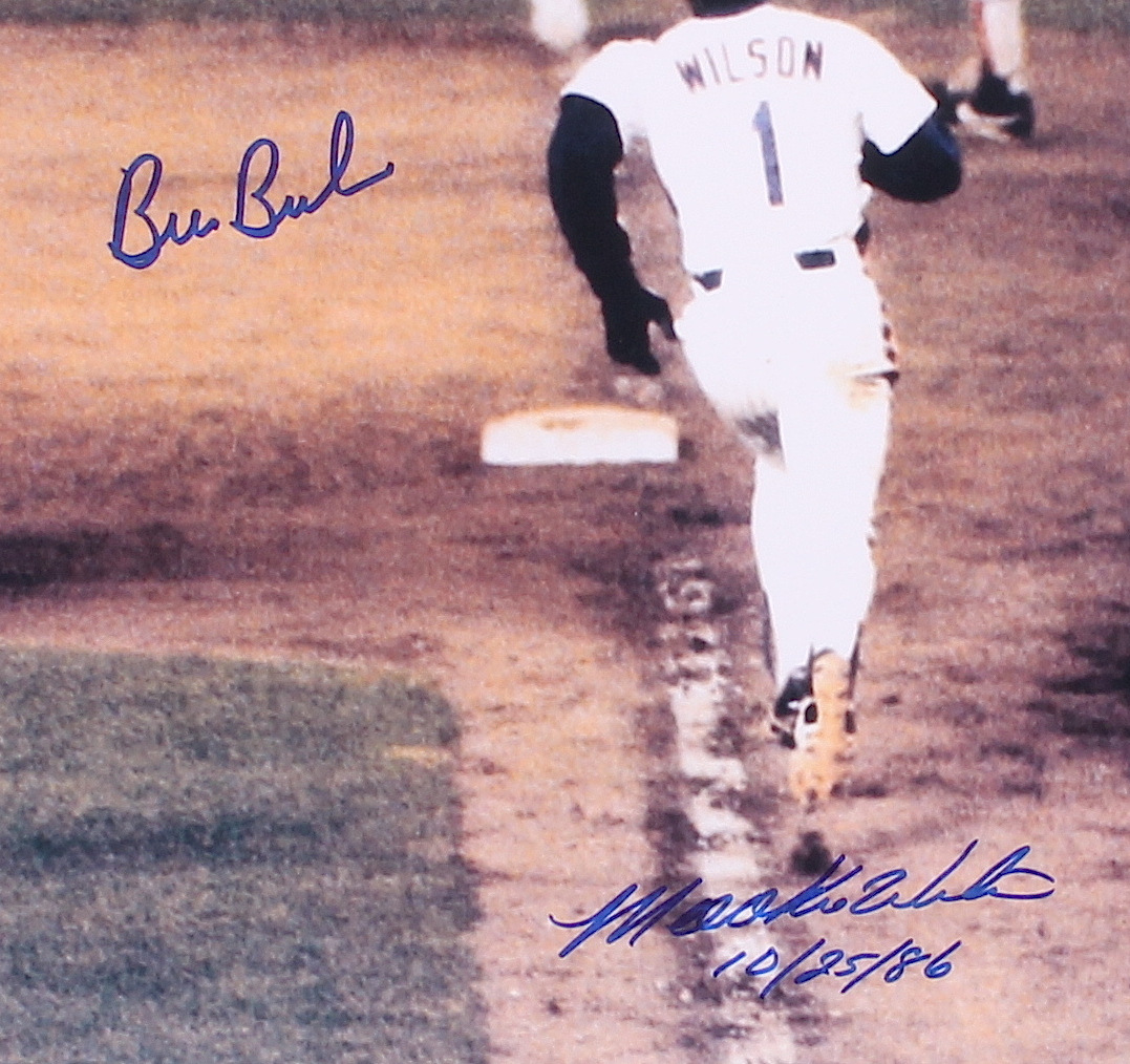 Photo measures 16" x 20" and has been hand-signed in blue felt-tip pen by Bill Buckner (Red Sox) & Mookie Wilson (Mets).