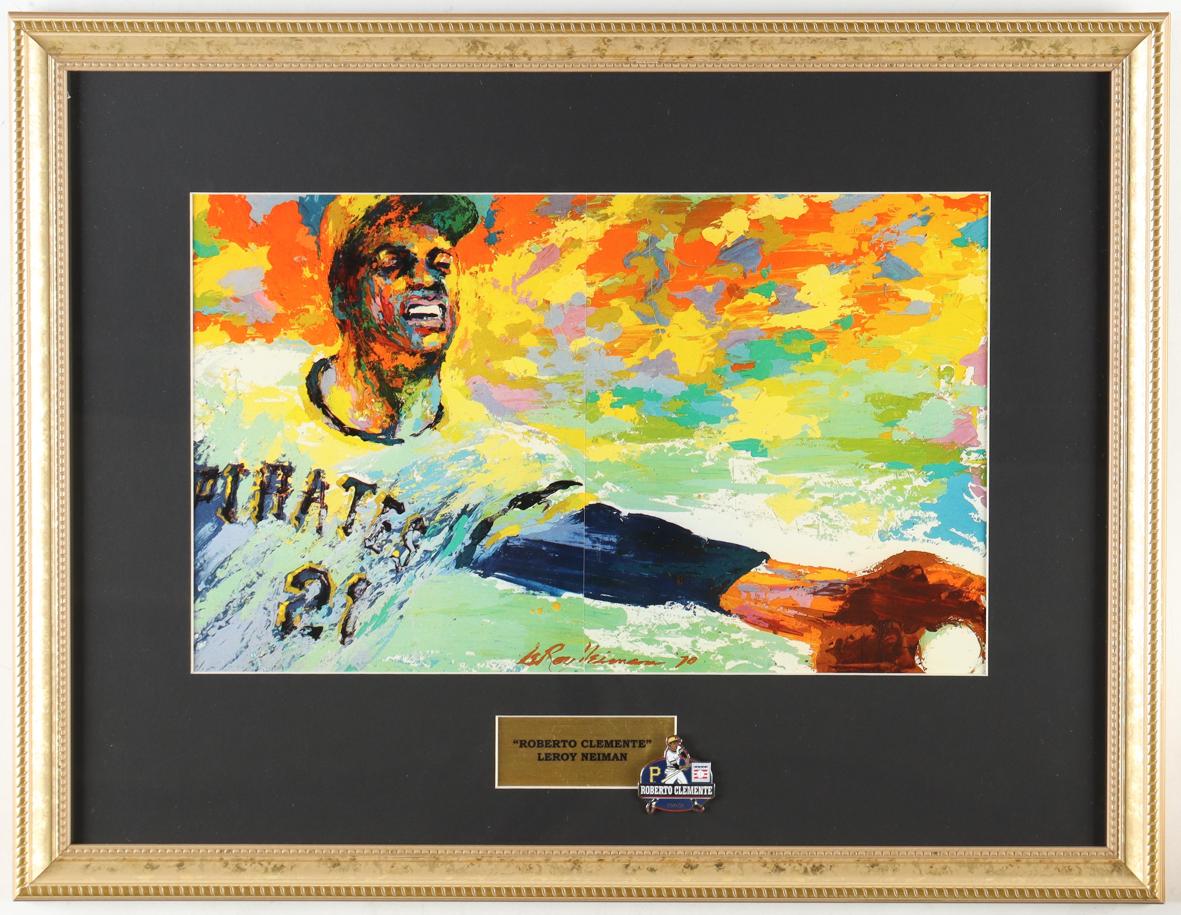 Leroy Neiman Custom Framed "Roberto Clemente" Print Display With Official 1973 Hall Of Fame Induction Pin