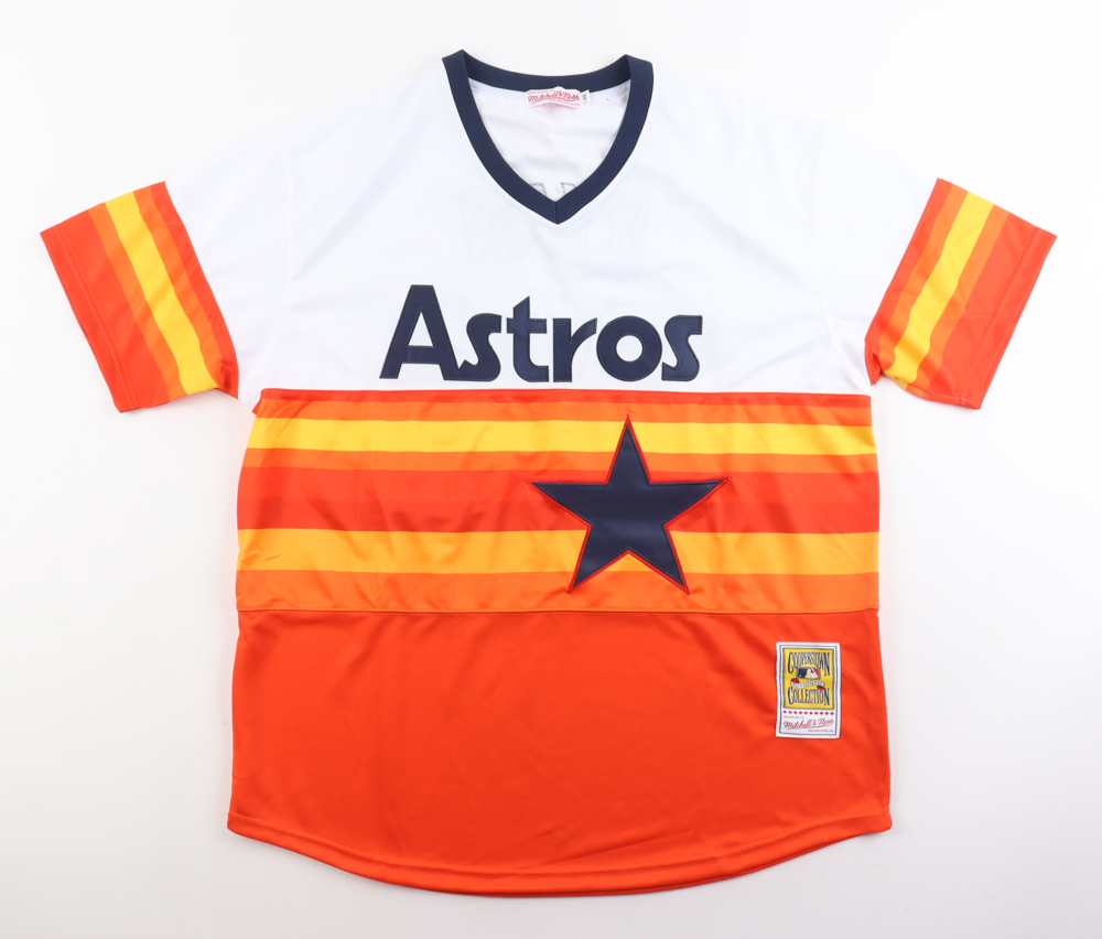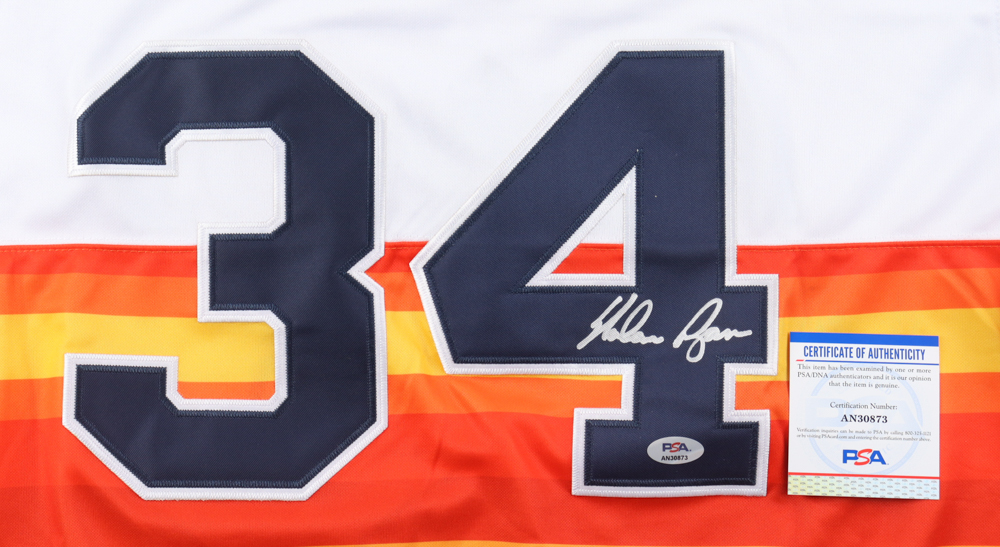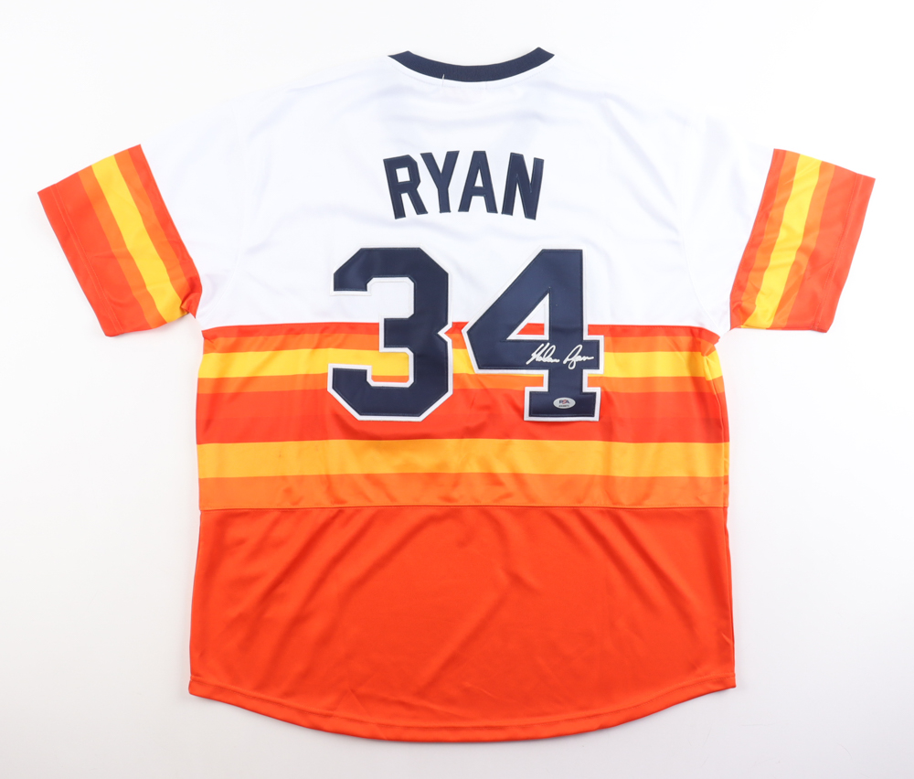 Custom jersey. Everything is sewn on, size 48. Hand-signed by Nolan Ryan (HOF). Please note, there are stray ink marks on the back of the jersey.