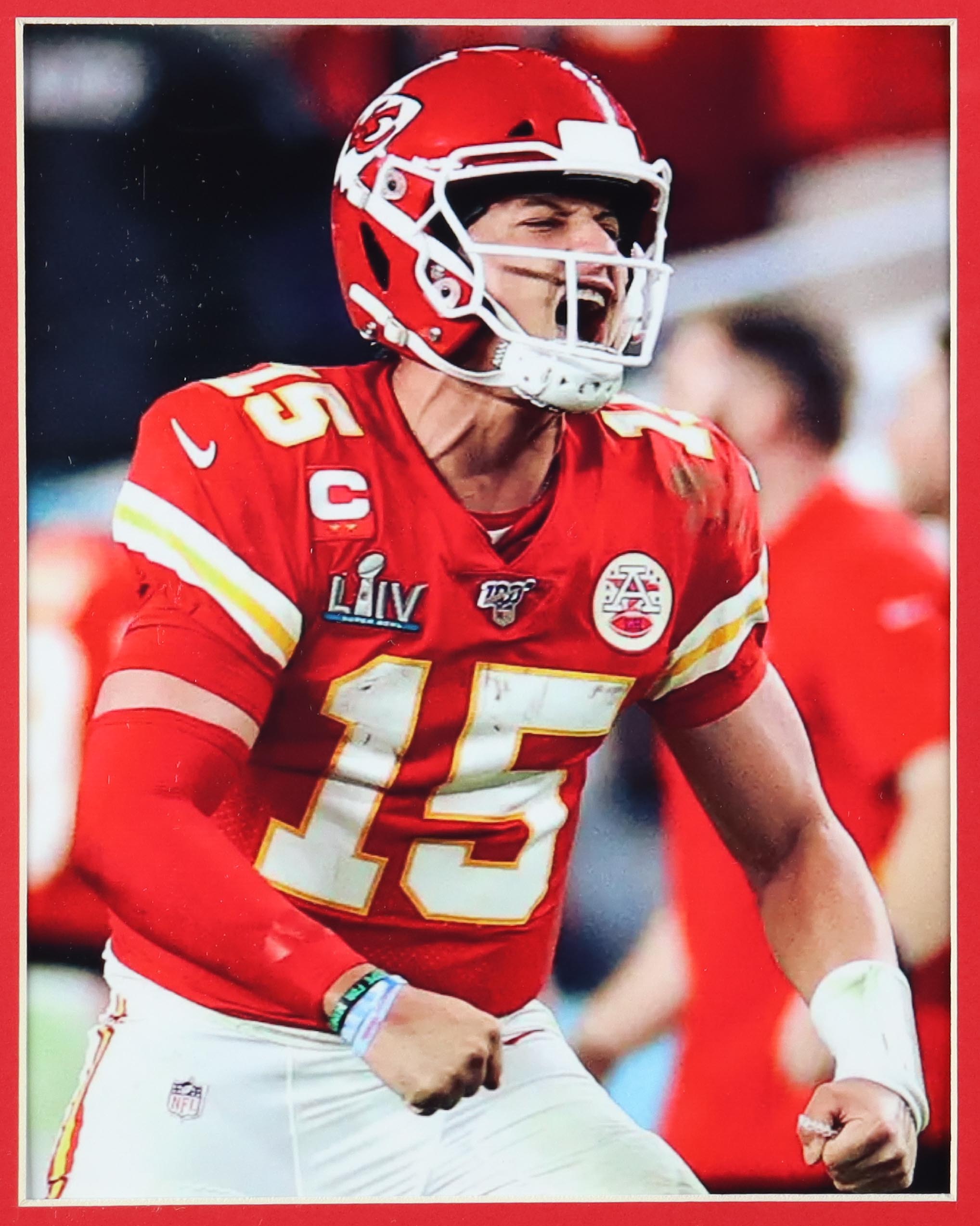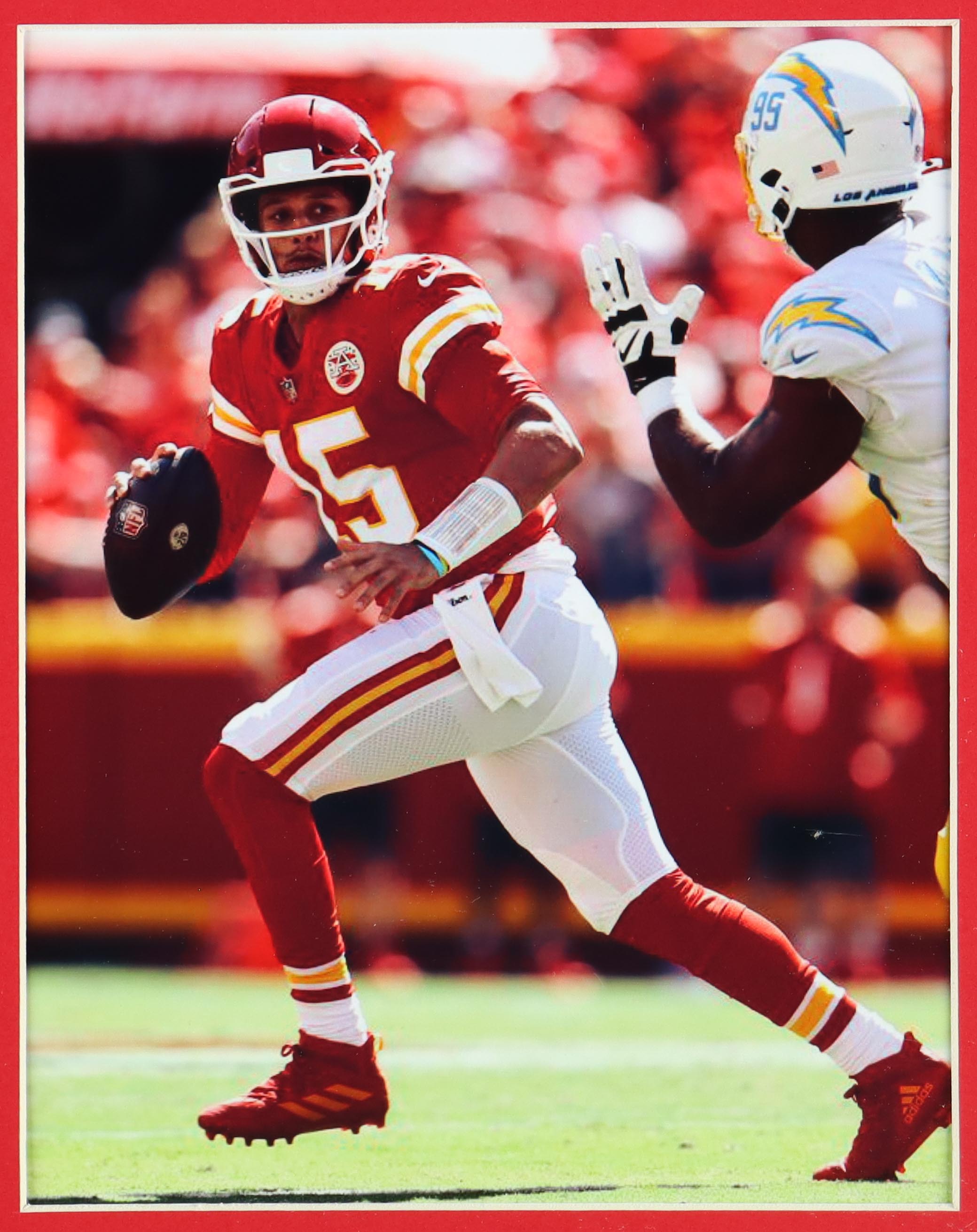 Custom frame measures 35.5" x 43.5" in size and features an authentic Nike jersey that has been hand-signed by Kansas City Chiefs superstar, Patrick Mahomes! This jersey has everything pressed on, not sewn on, and features (2) unsigned photos of Patrick Mahomes.