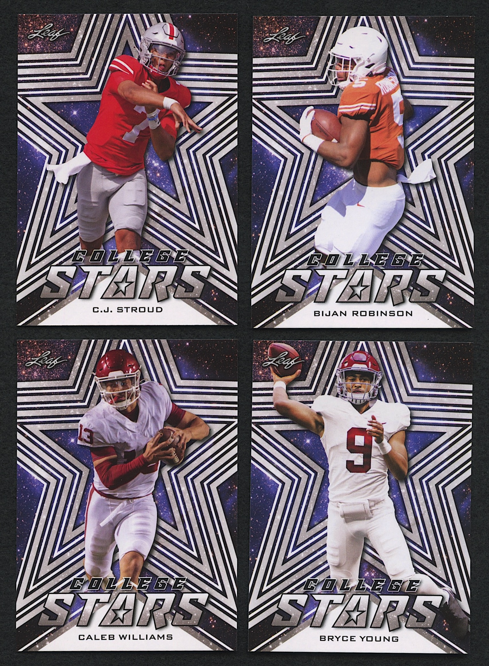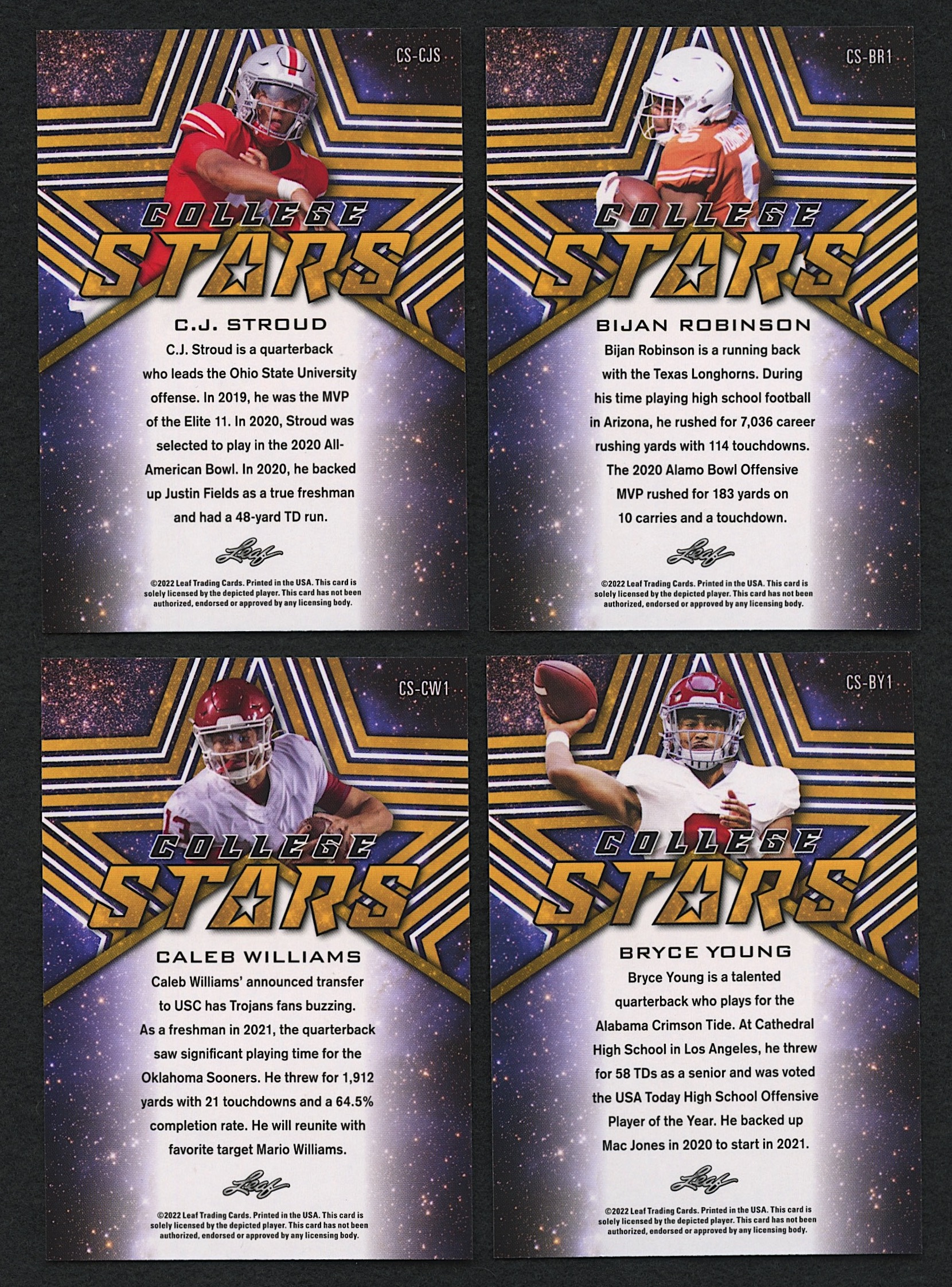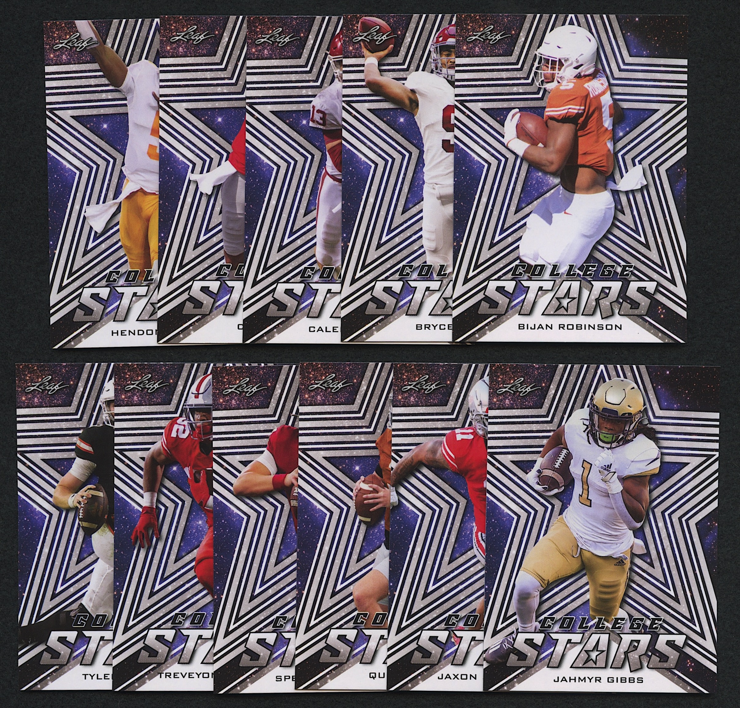 2022 Leaf College Stars White Complete Set of (11) Cards with Bijan Robinson RC, C.J. Strout RC, Caleb Williams RC, Bryce Young RC