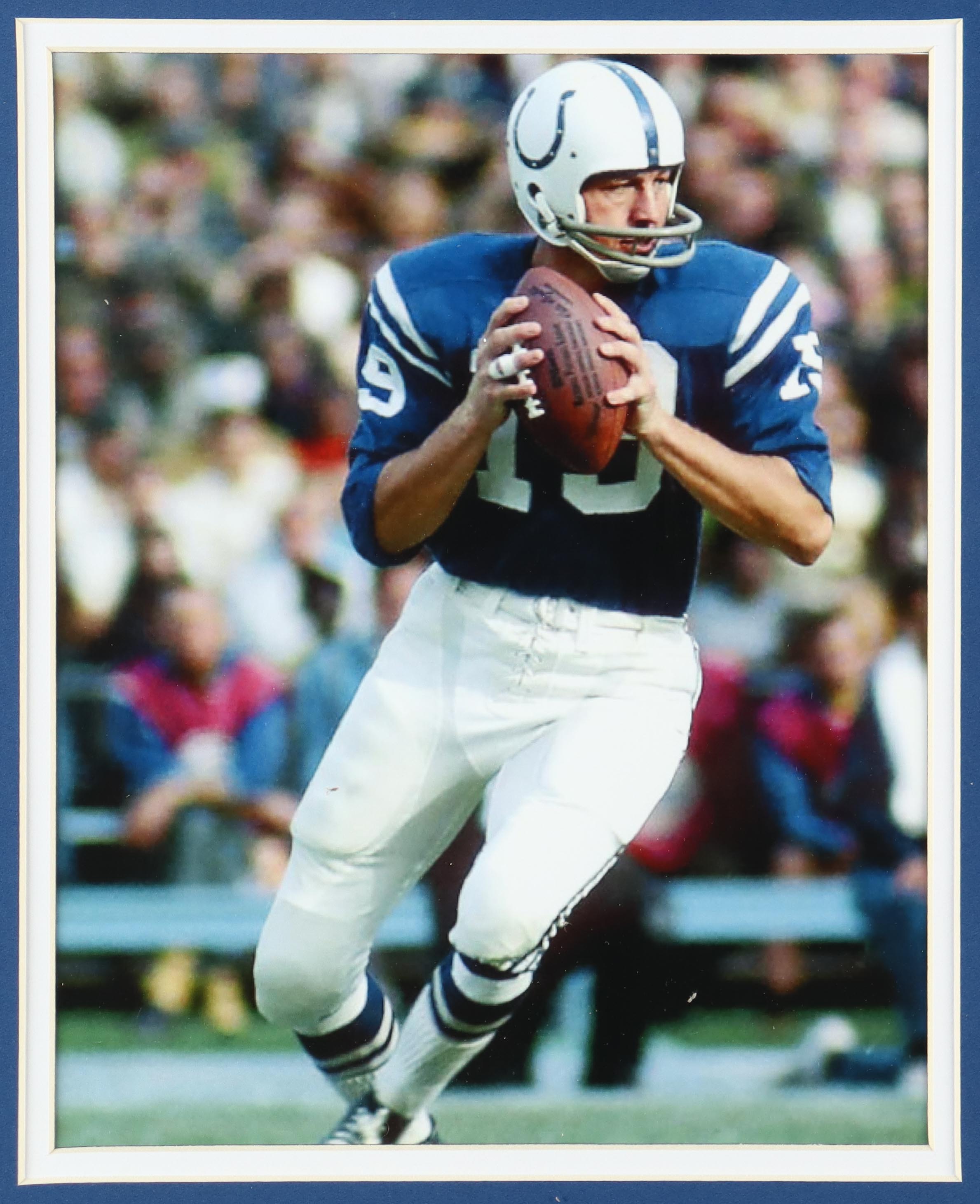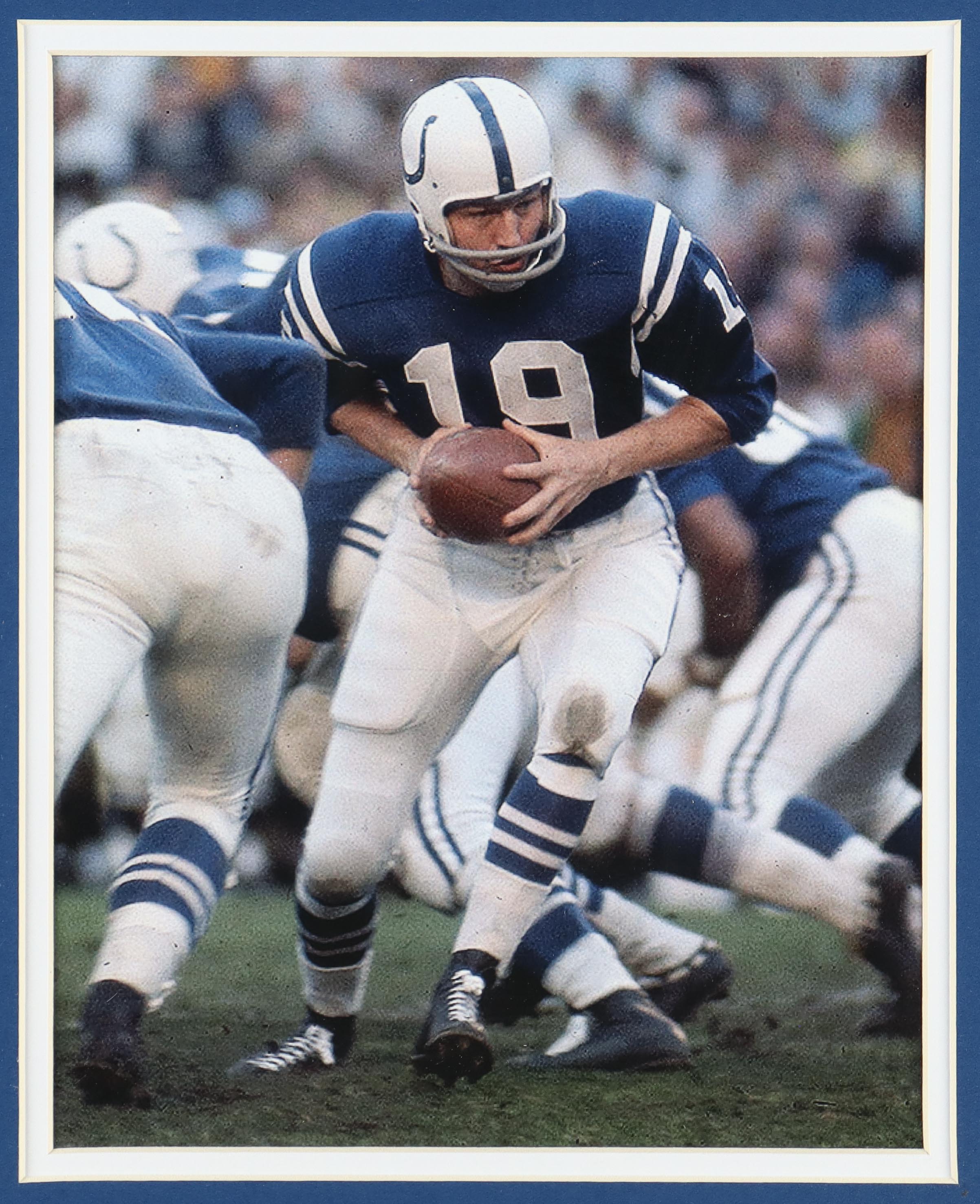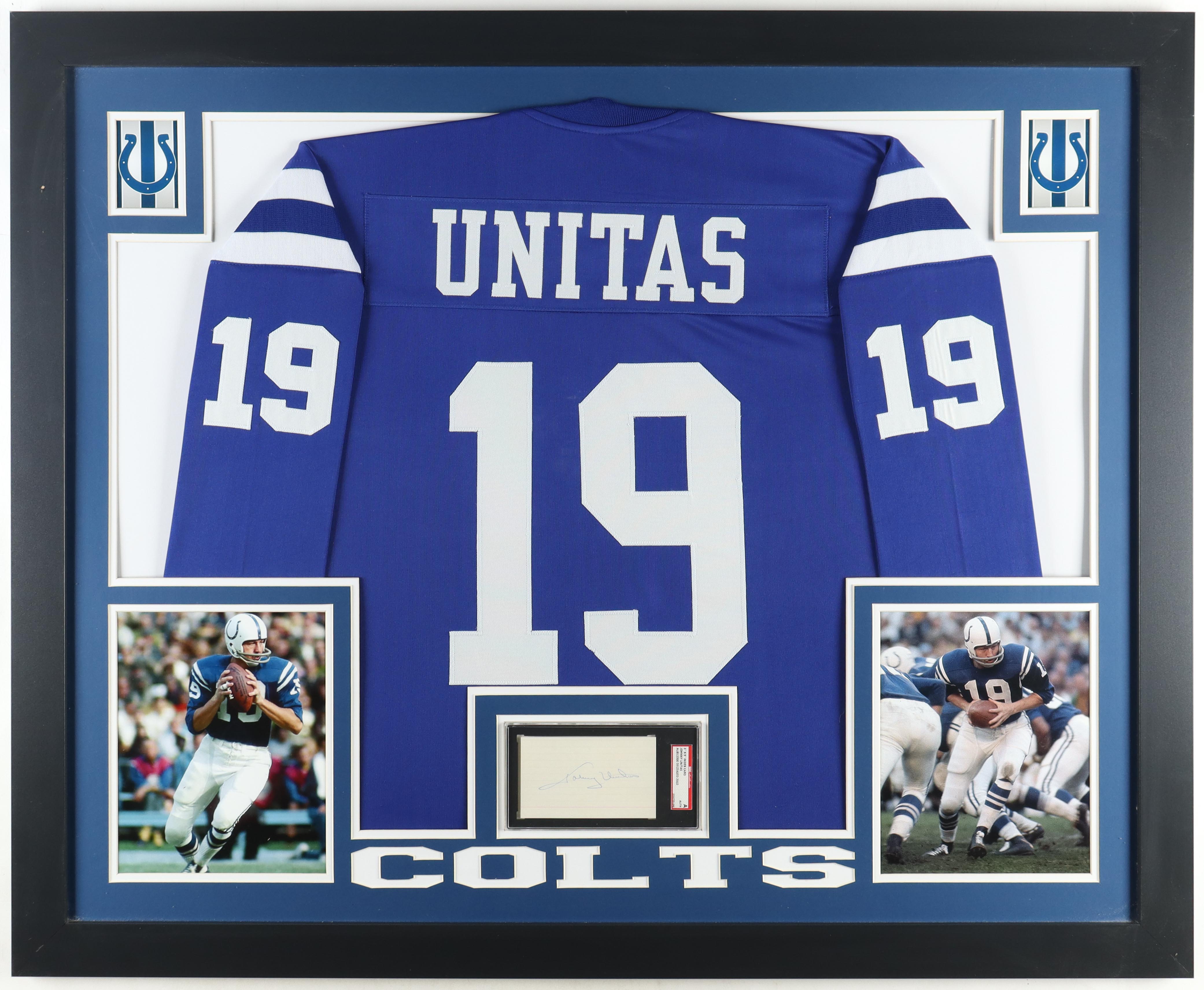 Custom frame measures approximately 35" x 43" in size. Features a cut that has been hand-signed by Johnny Unitas (D. 2002, HOF). The frame also features an unsigned jersey.
