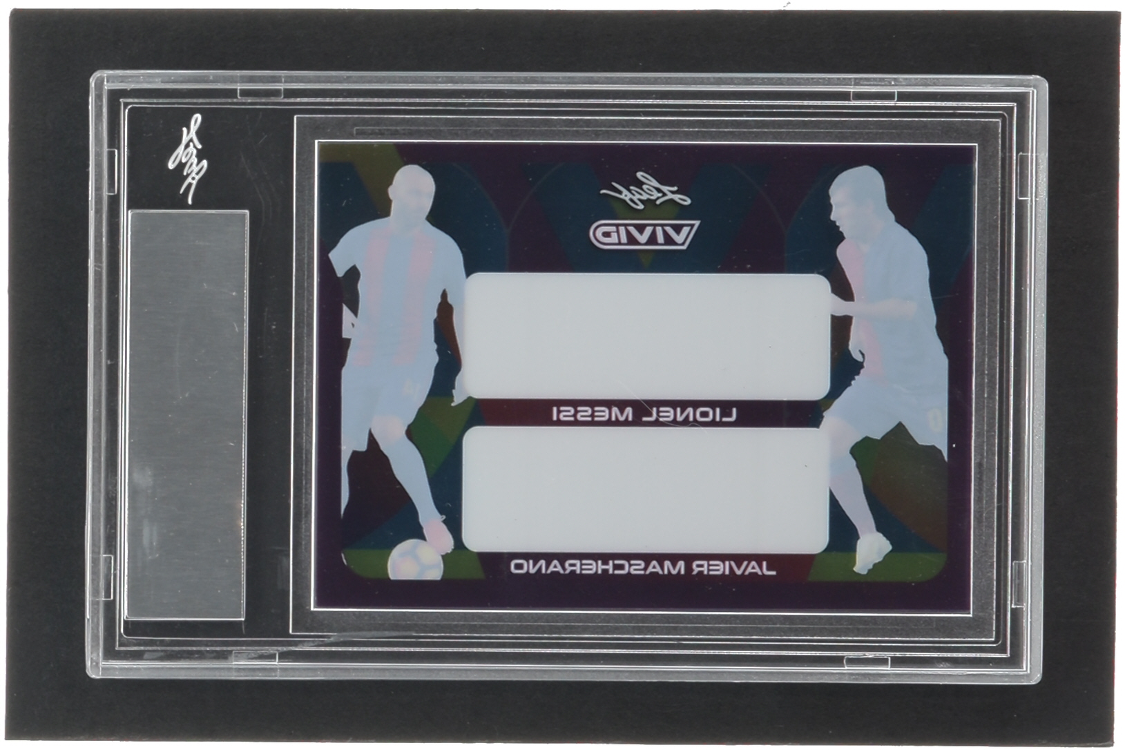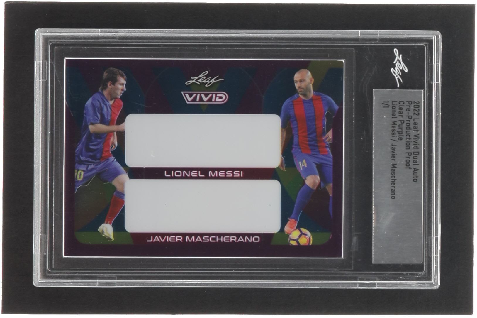 Lionel Messi / Javier Mascherano 2022 Leaf Vivid Dual Auto Pre-Production Proof Clear Purple #1/1 (Leaf)