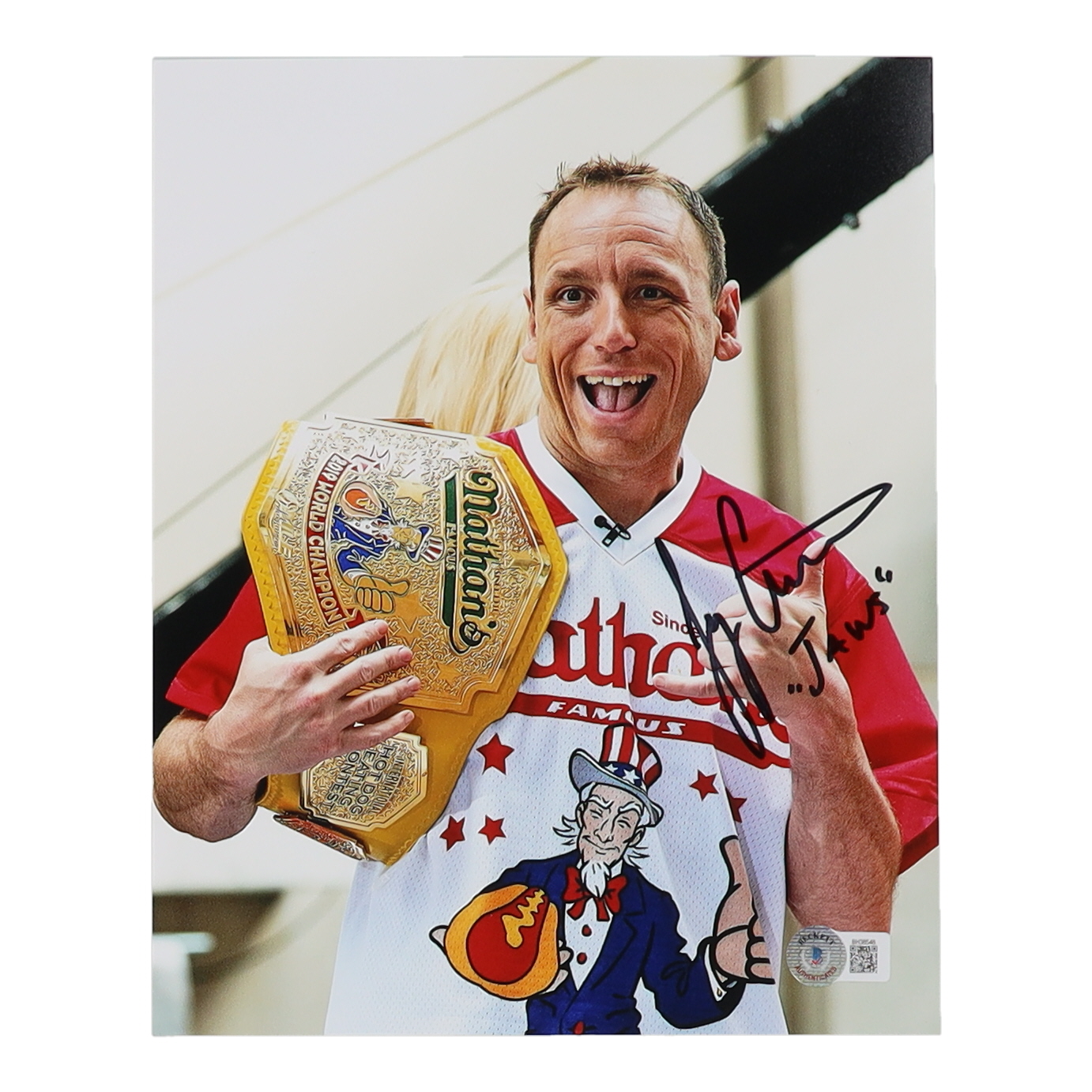 Photo measures 8" x 10" in size and has been hand-signed and inscribed by Joey Chestnut.