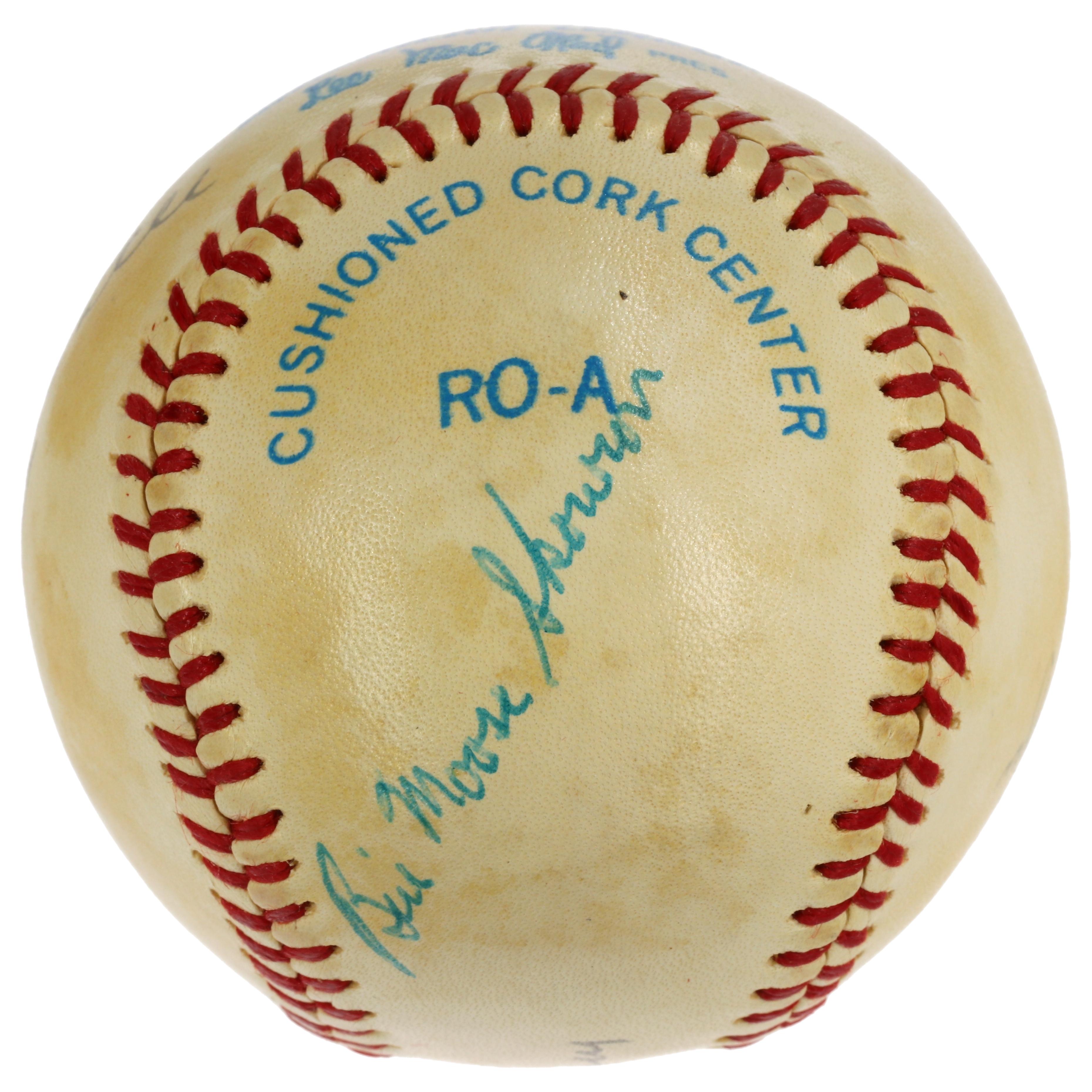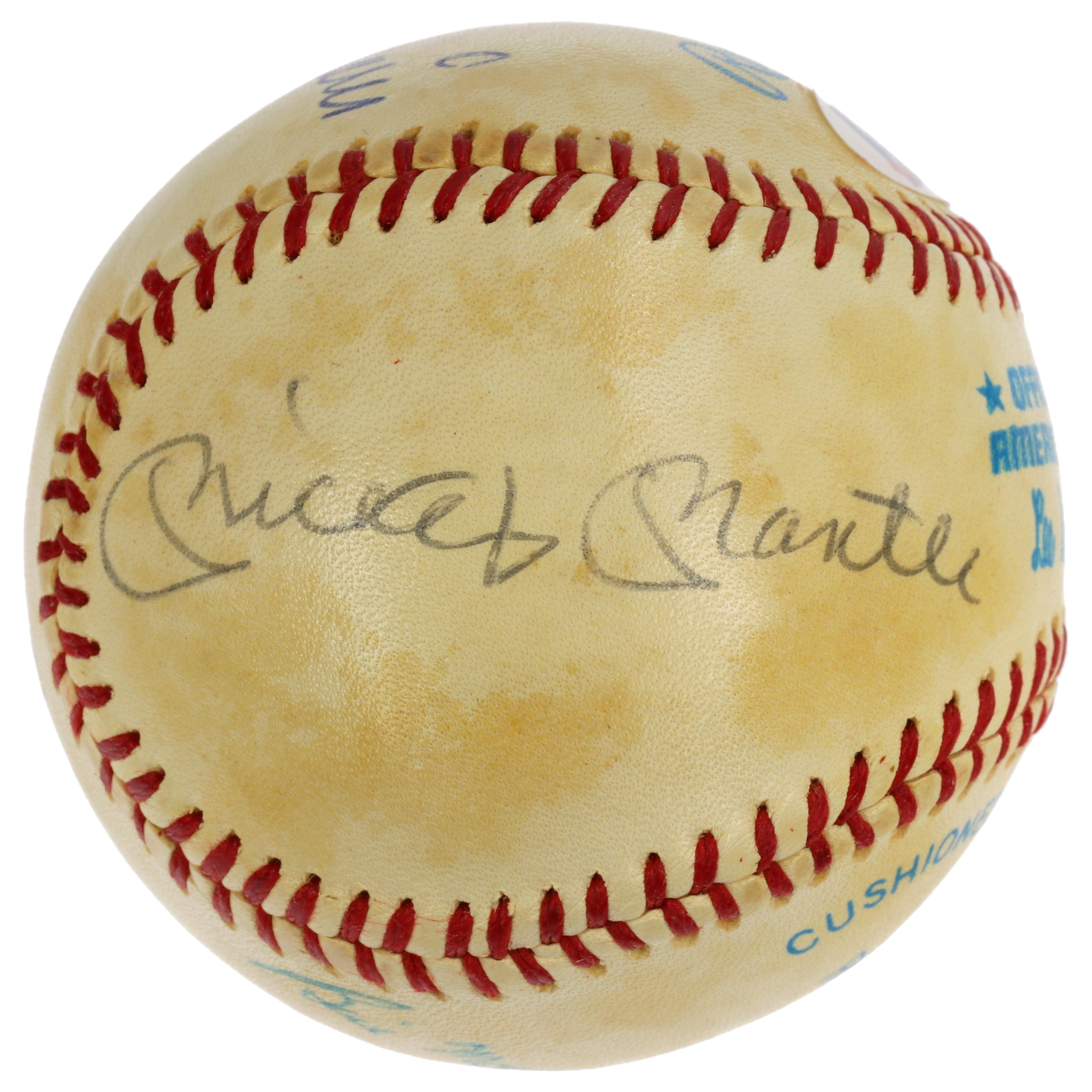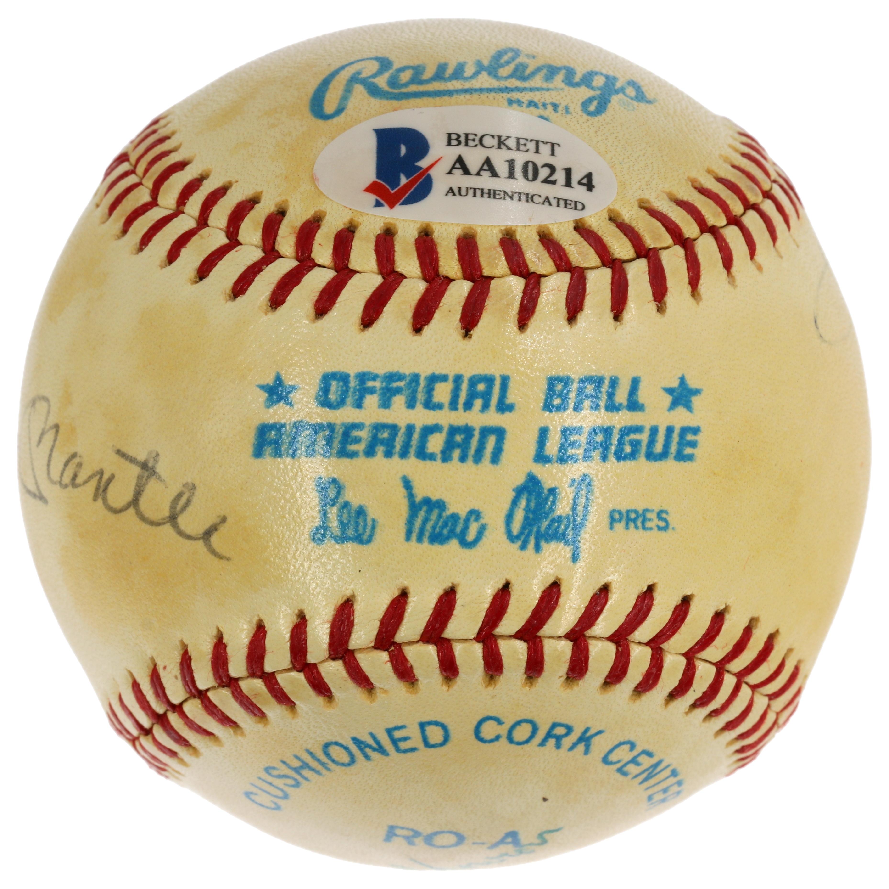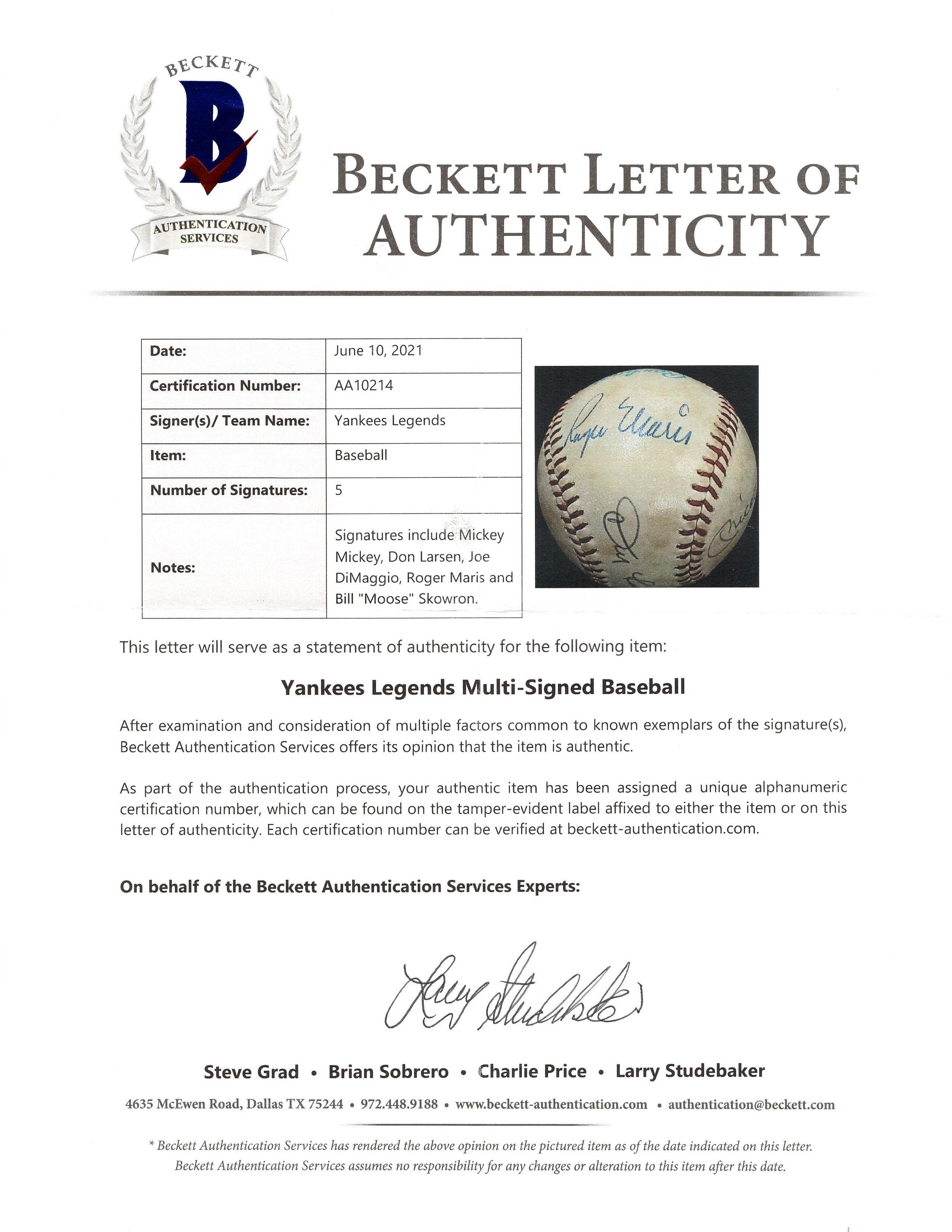 Rawlings Official American League baseball has been hand-signed by (5) New York Yankees legends! Signers on the baseball include Roger Maris (D. 1985), Mickey Mantle (D. 1995, HOF), Joe DiMaggio (D. 1999, HOF), Bill "Moose" Skowron (D. 2012) and Don Larsen (D. 2020).