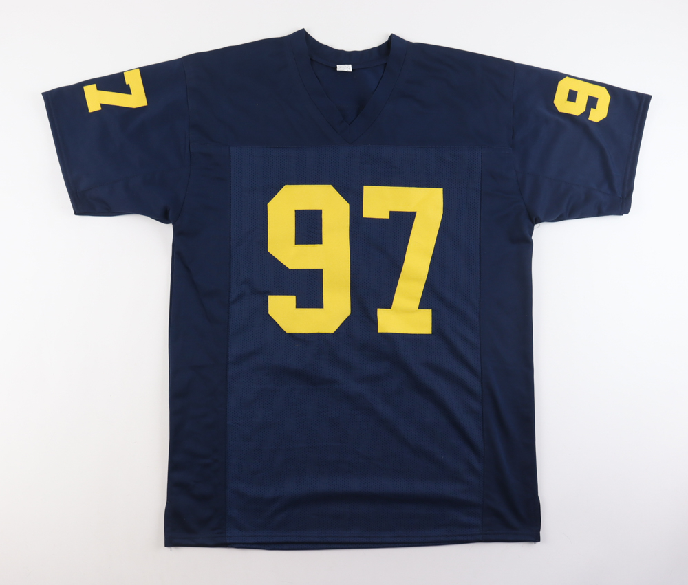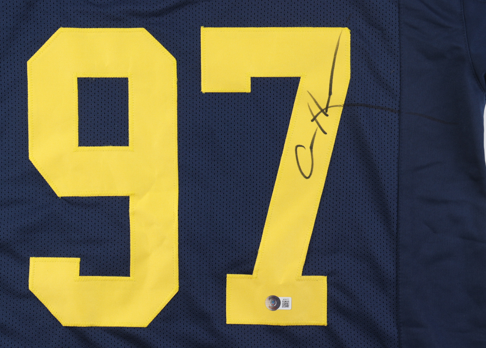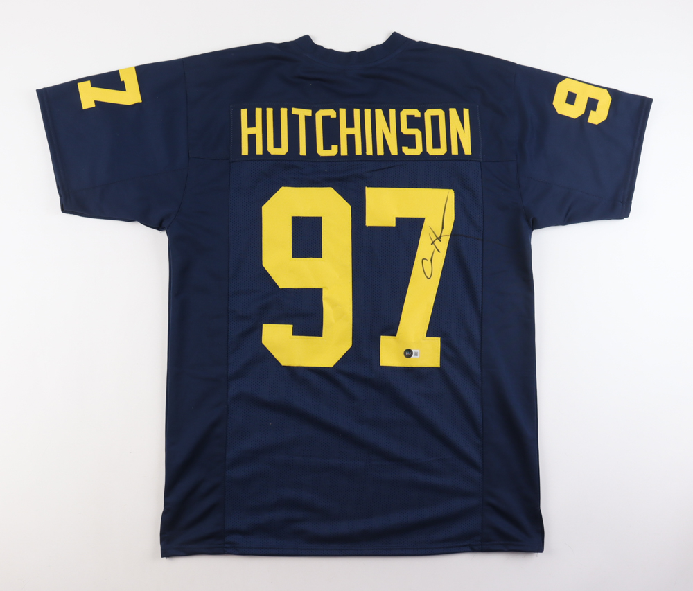 Custom jersey. Everything sewn on, size XL. Hand-signed by Aidan Hutchinson (Michigan Wolverines). Please note, there is a stain on and near the front number.