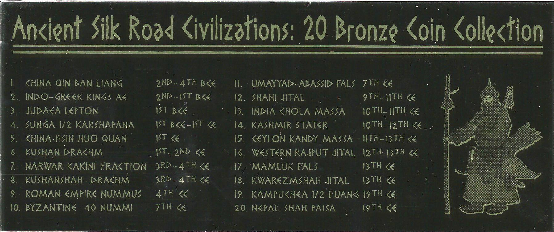 A unique collection of 20 different ancient bronze coins minted by the mighty kingdoms that rose and fell over the centuries along the famed Silk Road.