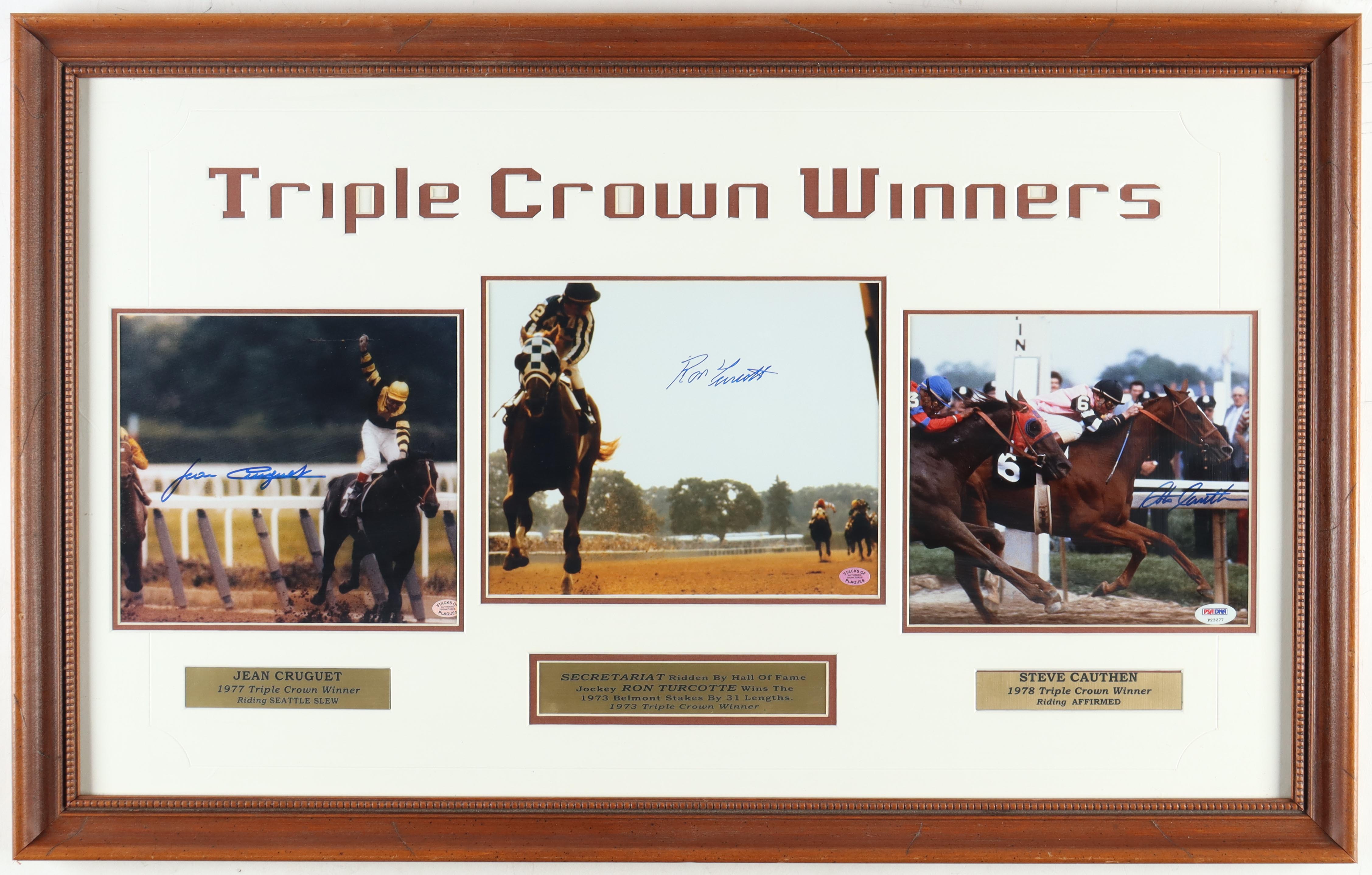 Jean Cruguet, Ron Turcotte & Steve Cauthen Signed "Triple Crown Winners" Custom Framed Matted Photo Display (SOP & PSA)