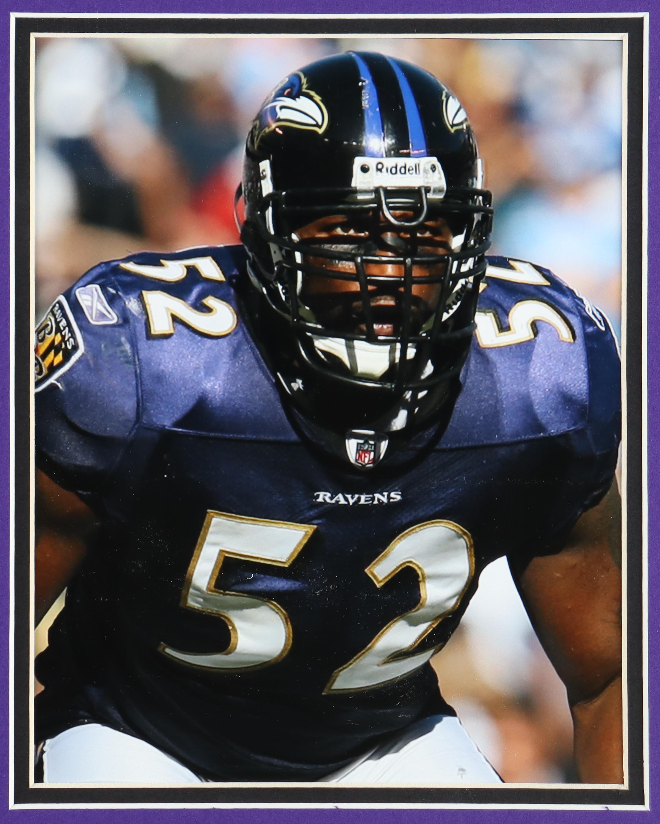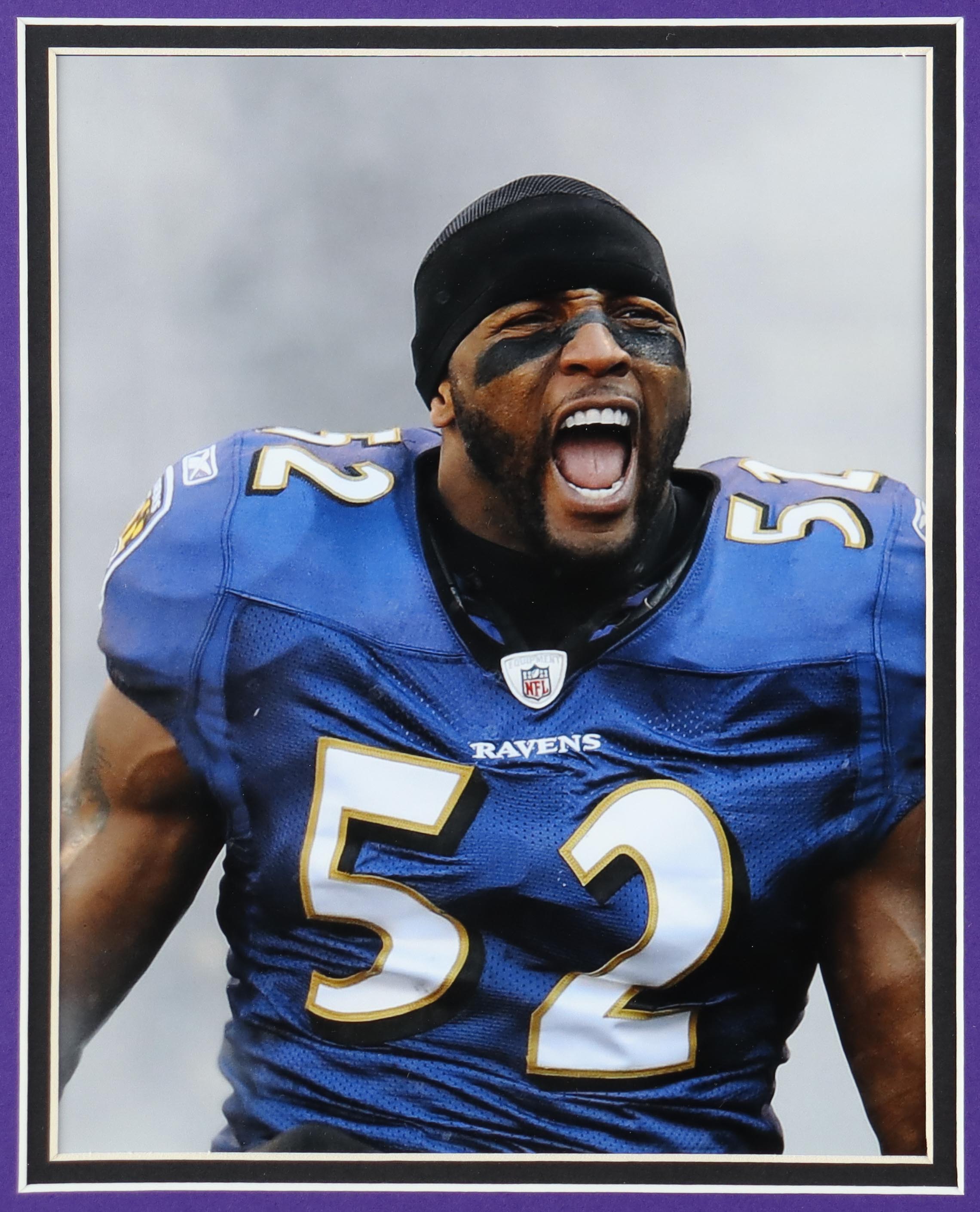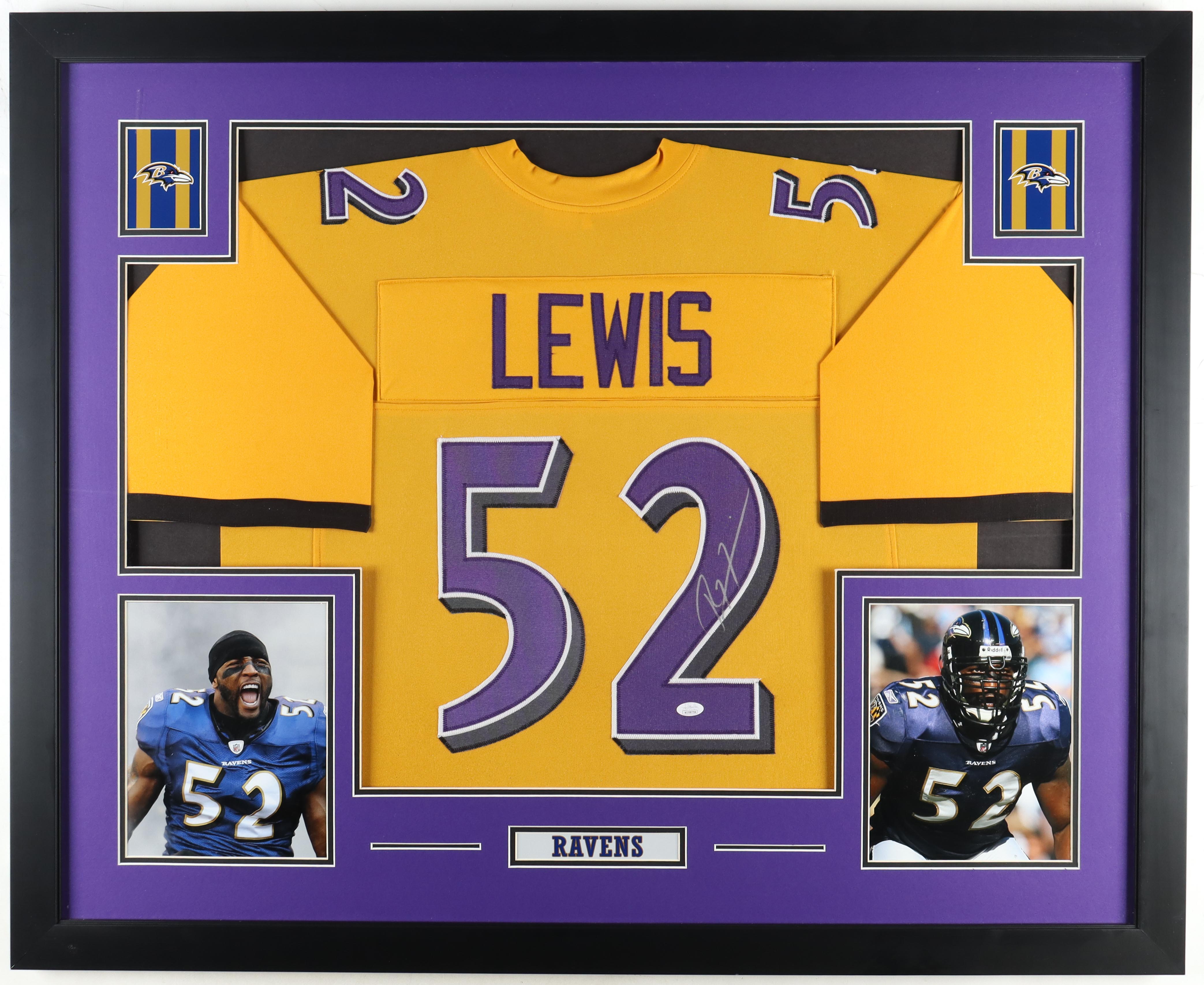 Custom framed display measures 35" x 43" in size and features a custom on-field style jersey that has been hand-signed by Ray Lewis (HOF).