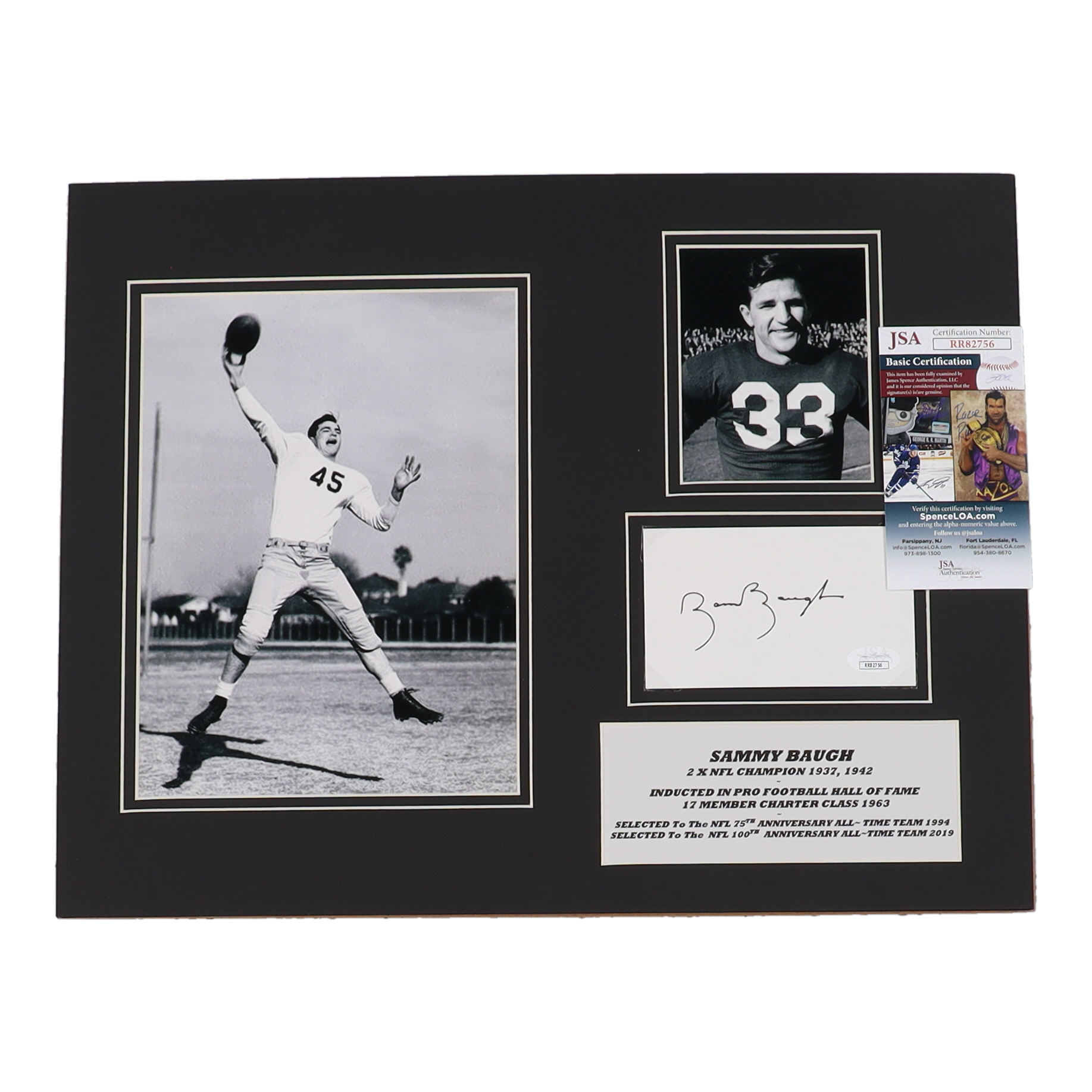 Custom matted display measures 14" x 18" in size and features a cut that has been hand-signed by Sammy Baugh (D. 2008, Washington Redskins, HOF).