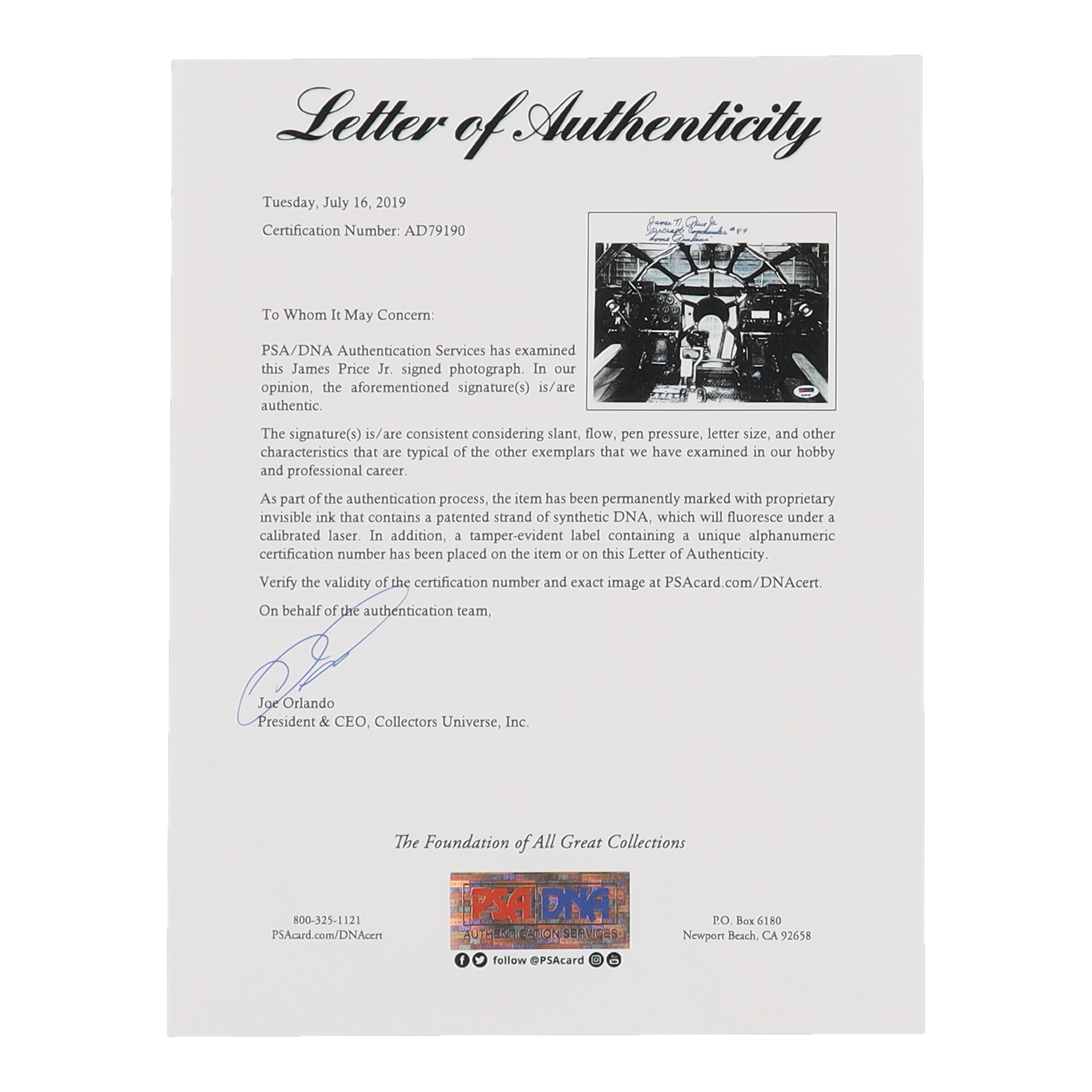 Photo measures 8" x 10" in size and has been hand-signed and inscribed by James N. Price Jr.