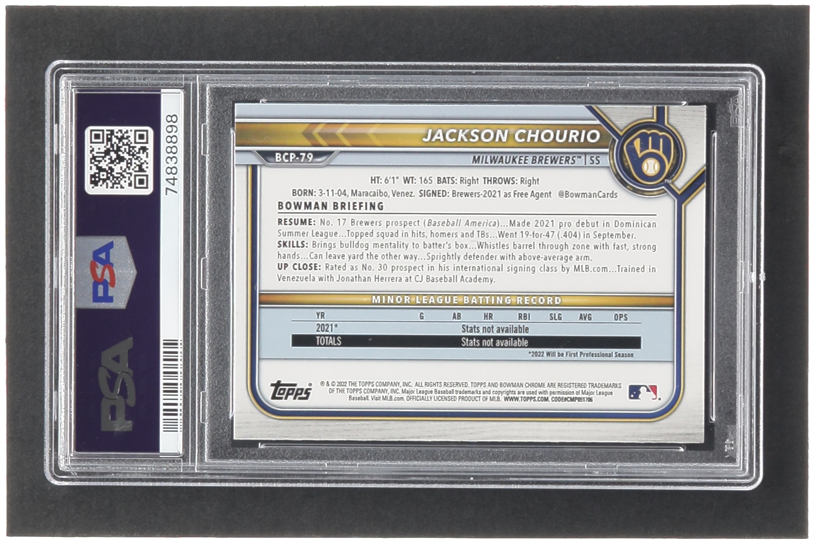 Jackson Chourio Signed 2022 Bowman Chrome Prospects #BCP79 (PSA)