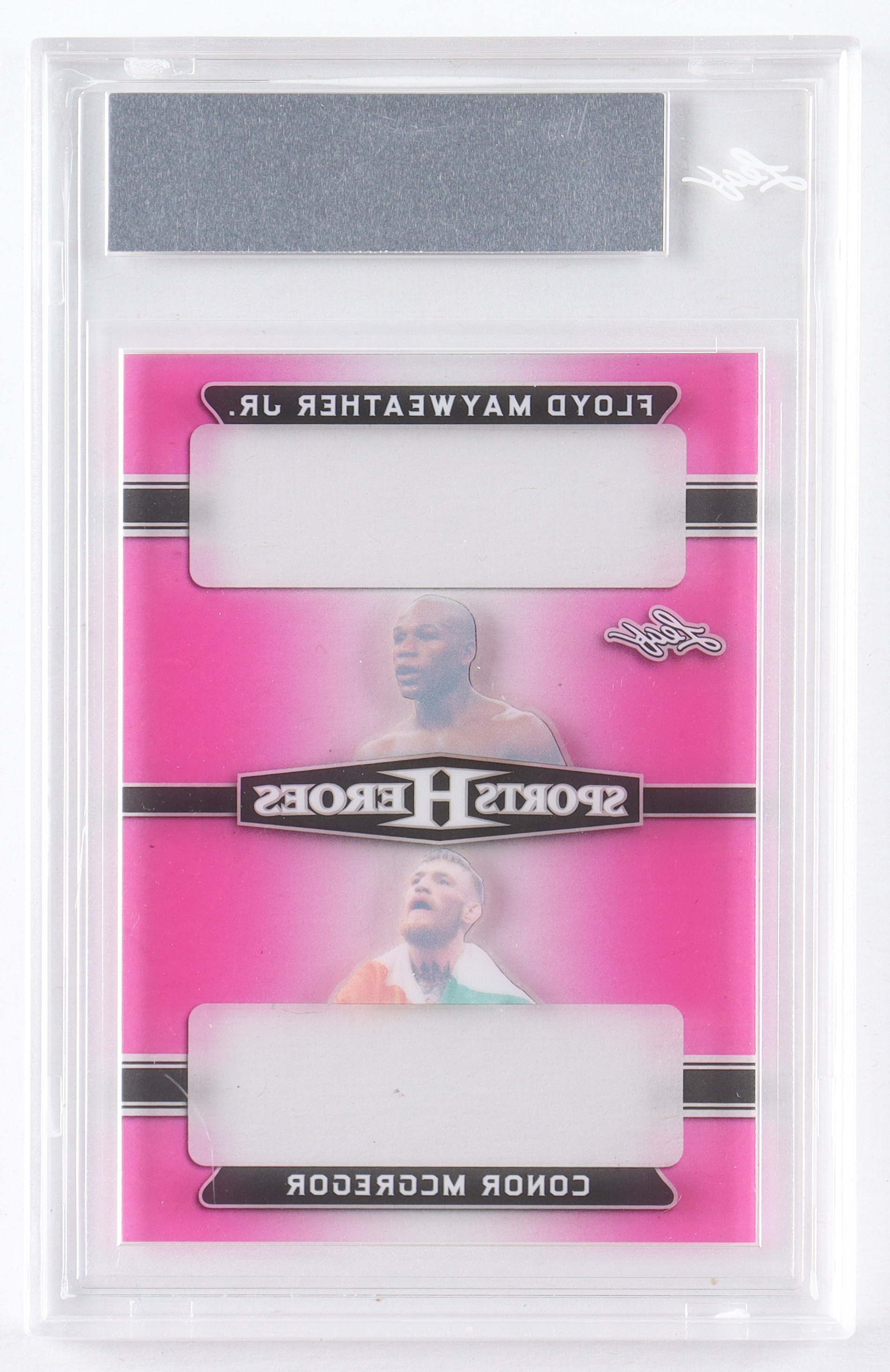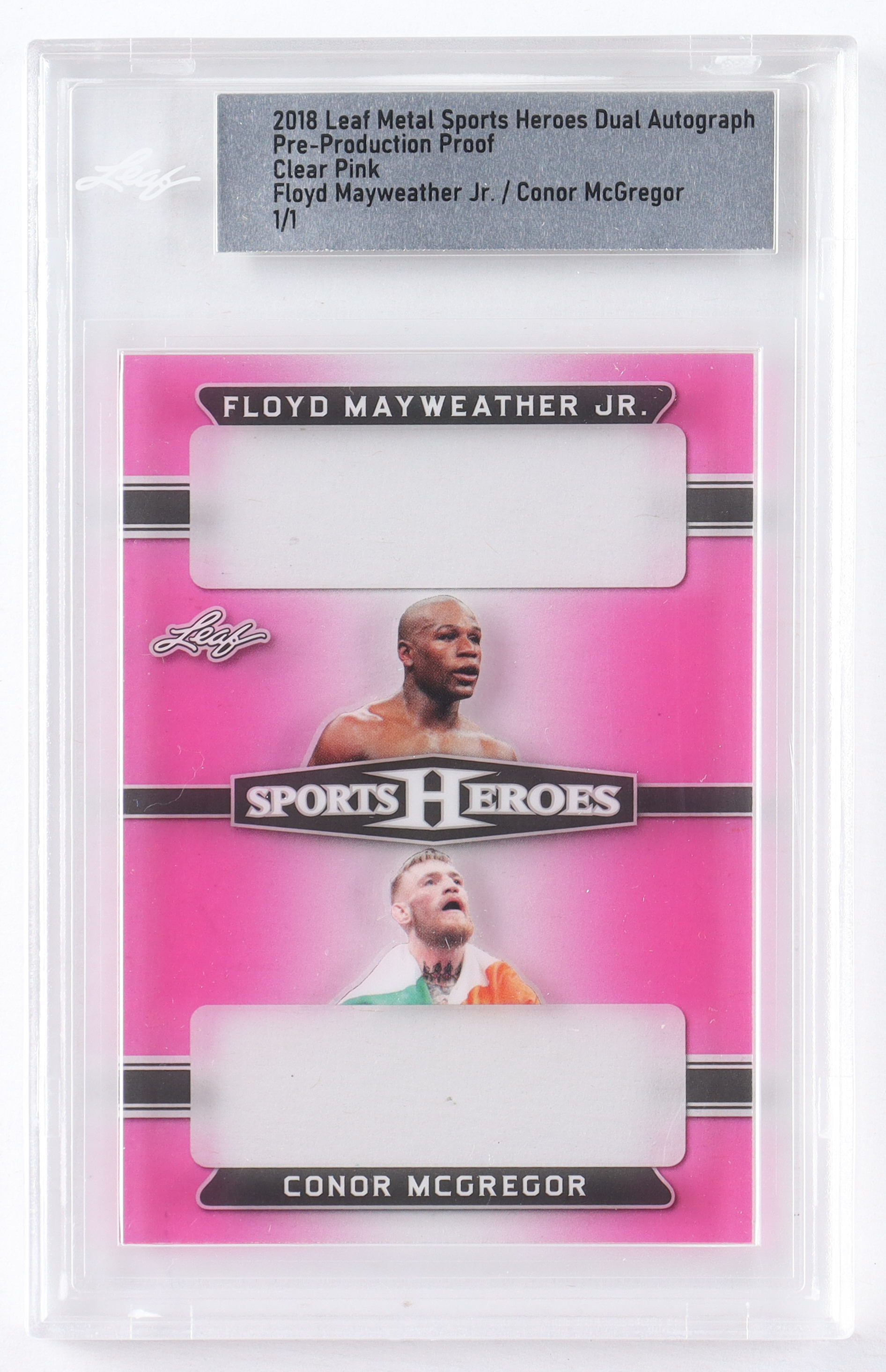 Floyd Mayweather Jr. / Conor McGregor 2018 Leaf Metal Sports Heroes Dual Autograph Pre-Production Proof Clear Pink #1/1 (Leaf)