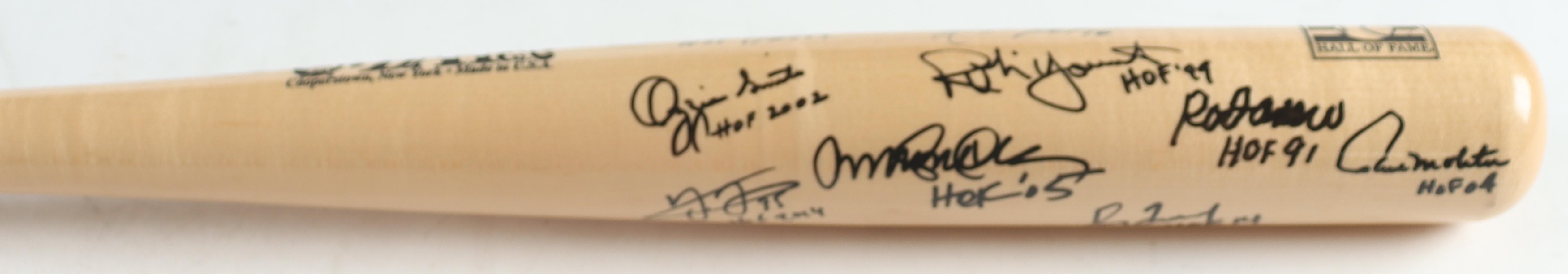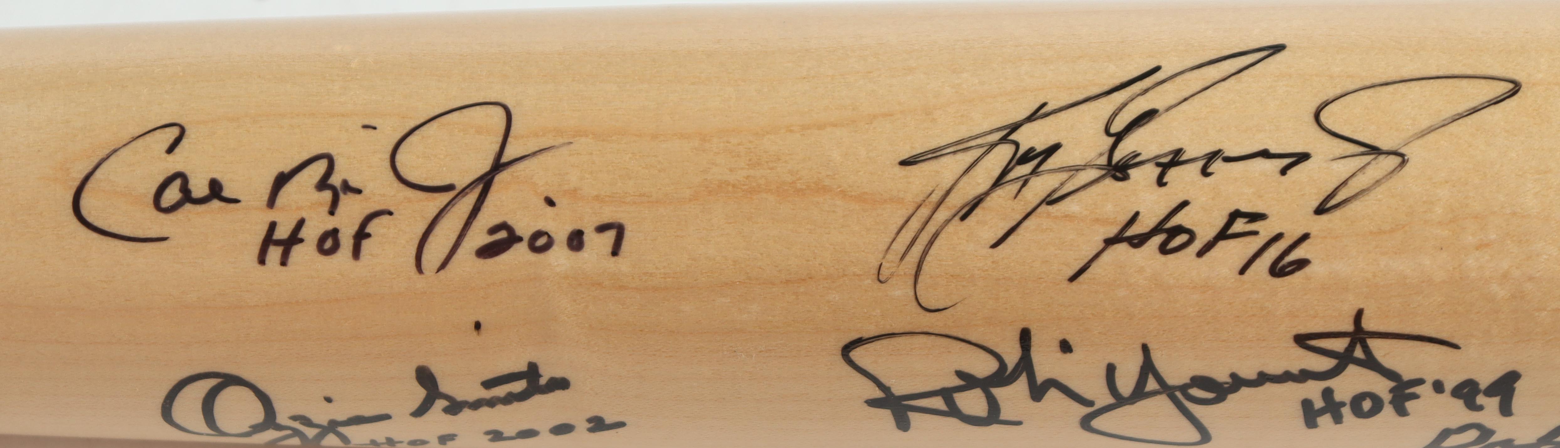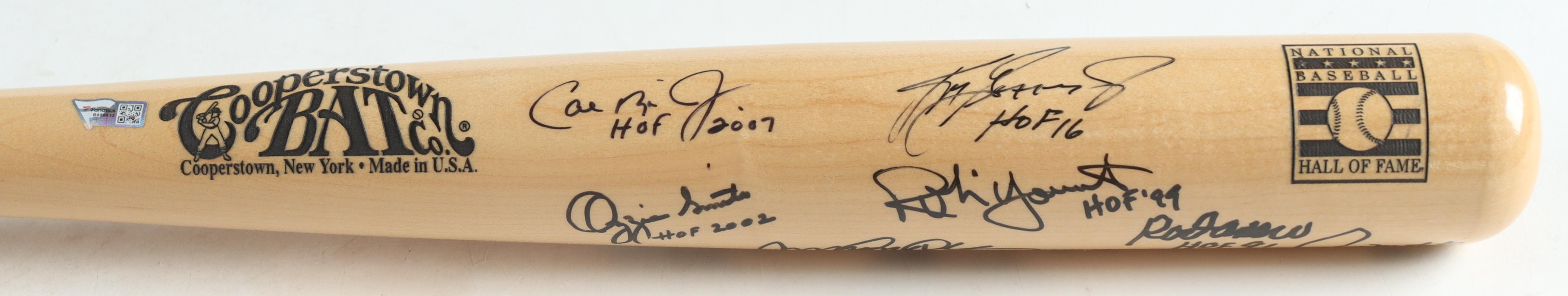 Baseball Hall of Famers Cooperstown Etched Baseball Bat Signed & Inscribed by (9) with Ken Griffey Jr., Cal Ripken Jr., Ozzie Smith, Rod Carew, Greg Maddux (Beckett, Fanatics & PSA)