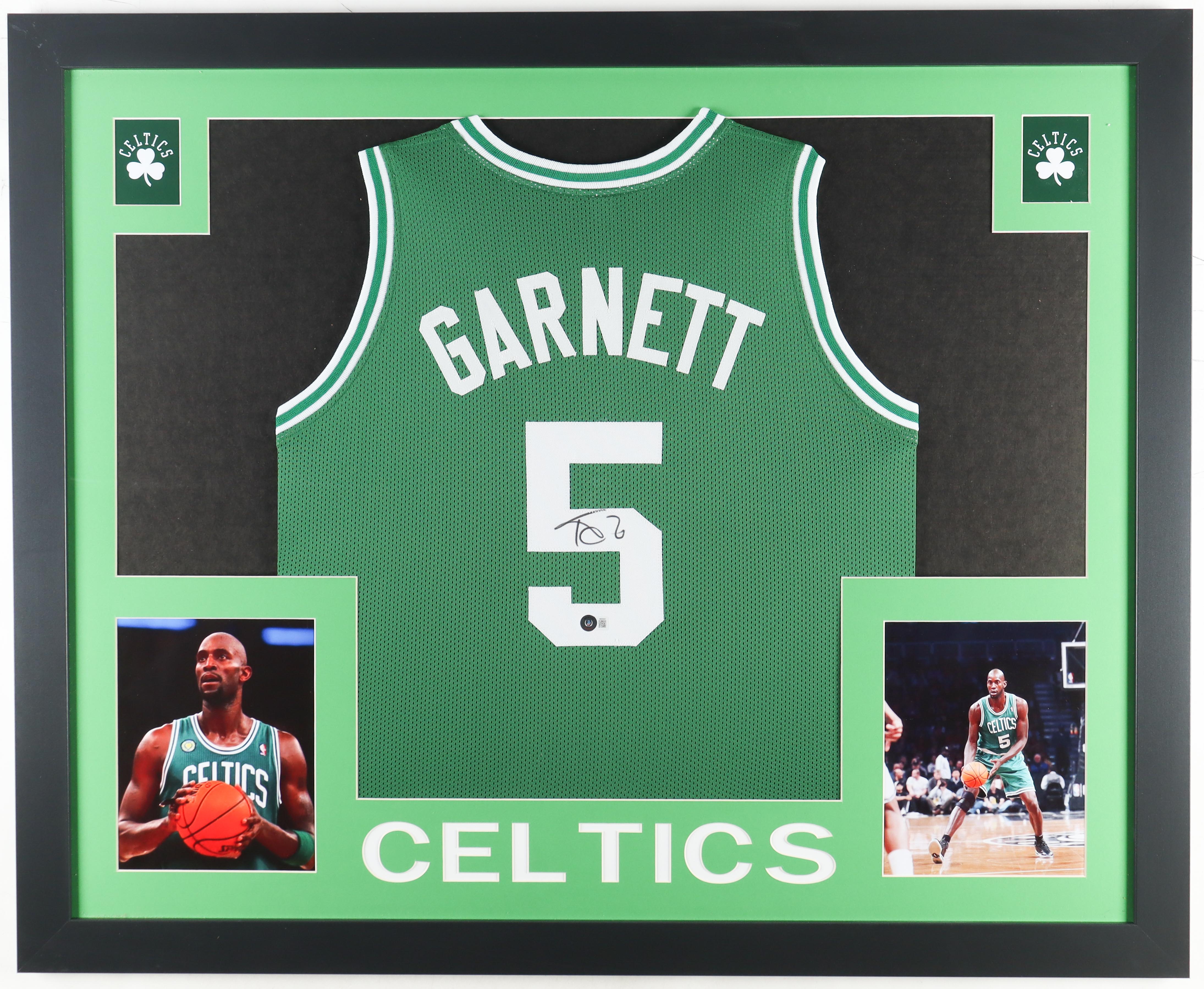 Custom framed jersey display measures 35" x 43' in size and features a jersey that has been hand-signed by Kevin Garnett (Boston Celtics, HOF). Please note, the 8x10 photos may be in opposite corners.