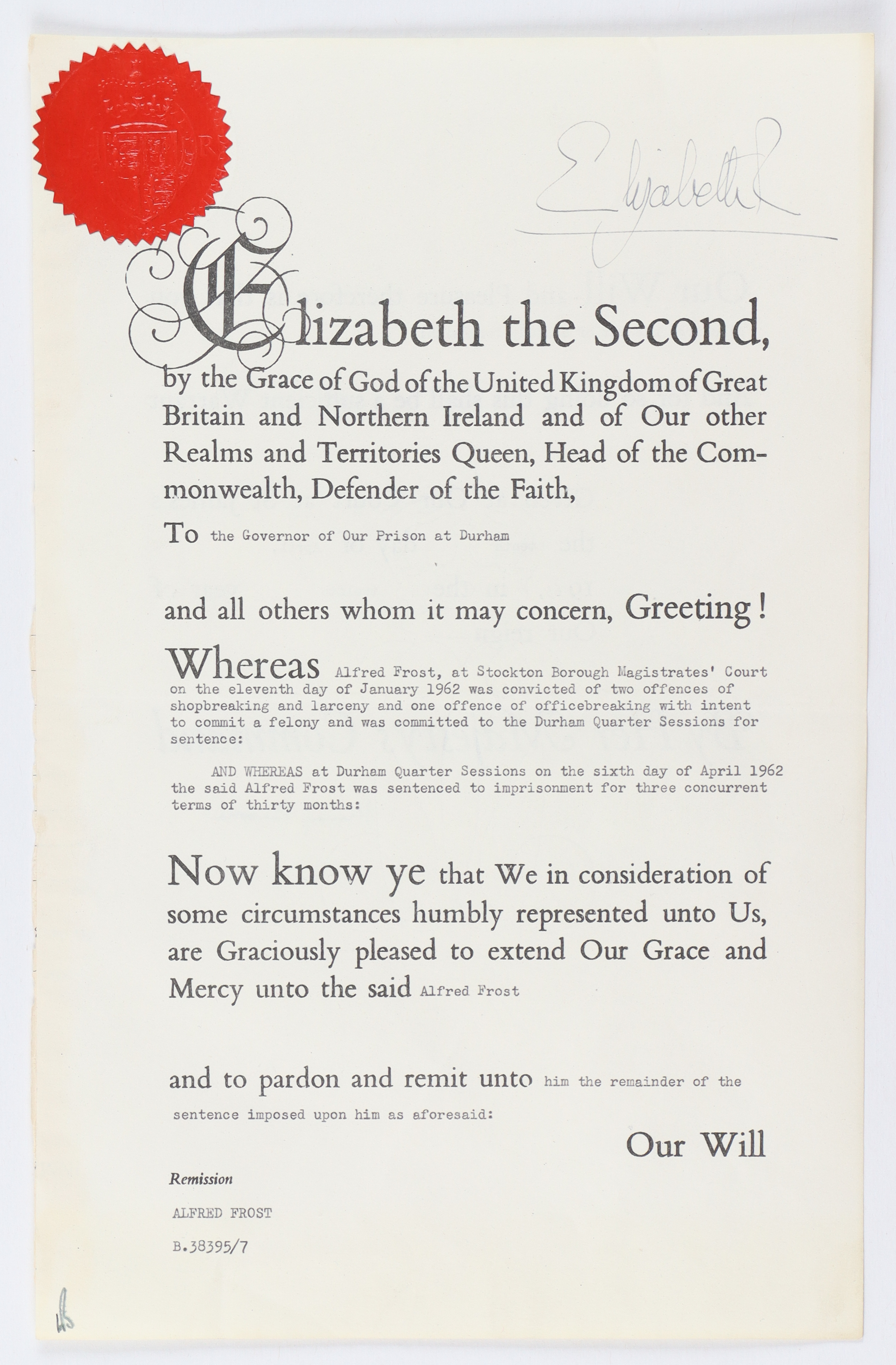 Royal Pardon Letter is dated in the early 1960's and has been hand-signed on the top right corner by the longest reigning monarch, Queen Elizabeth II. The contents of the Royal pardon is mentioning that the Queen is asking that the Governor of their prison in Durham shall release a prisoner by the name of Alfred Frost. Frost was arrested and sentenced to (3) consecutive terms of (30) months in prison. The Queen's letter mentions that they shall release him and that all chargers are to be dropped.