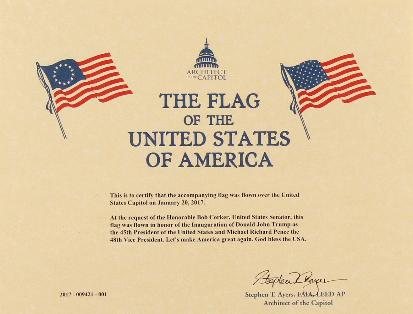 This flag was flown over the United States Capitol at the request of the Honorable Bob Corker, United States Senator, in honor of the Inauguration of Donald John Trump as the 45th President of the United States and Michael Richard Pence the 48th Vice President.