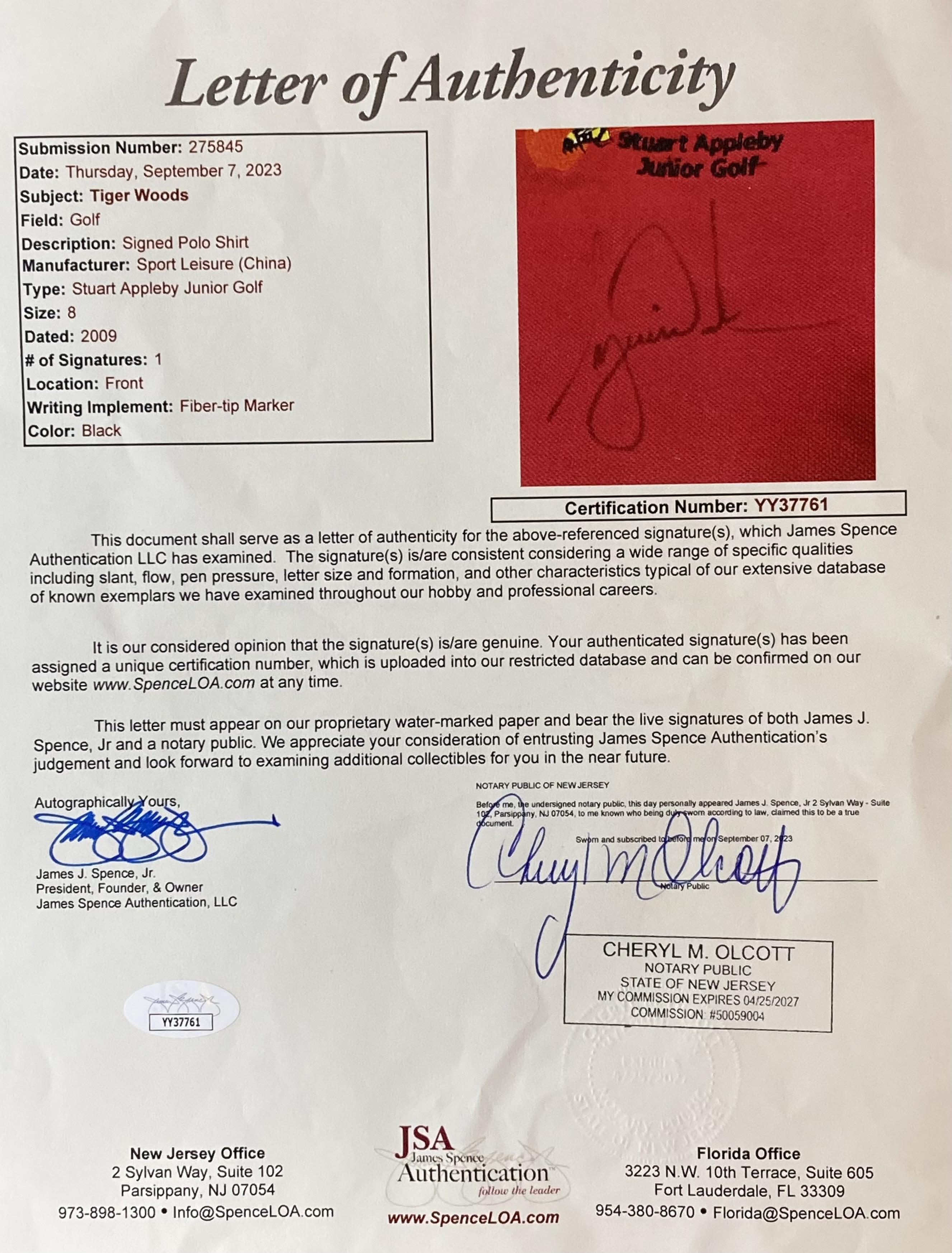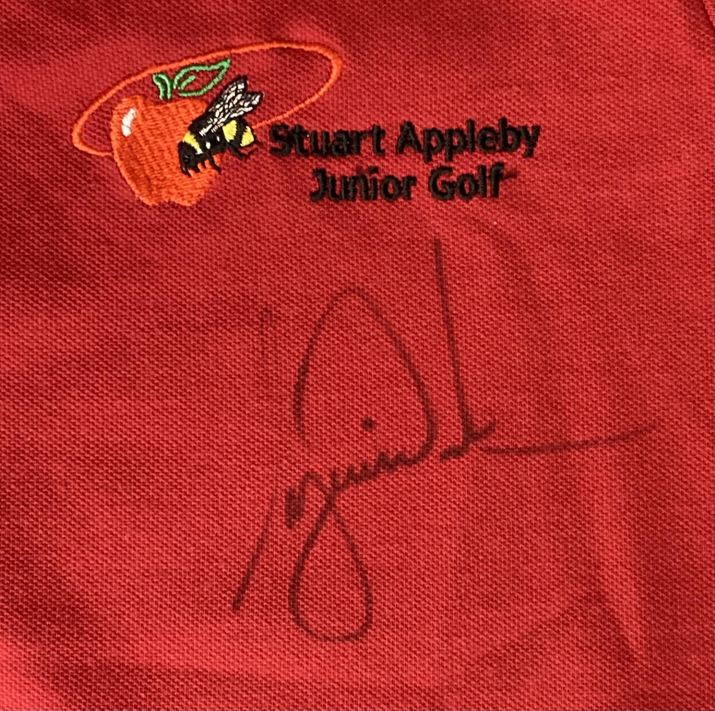 Stuart Appleby Junior Golf polo, size Youth 8. Hand-signed by Tiger Woods (HOF).