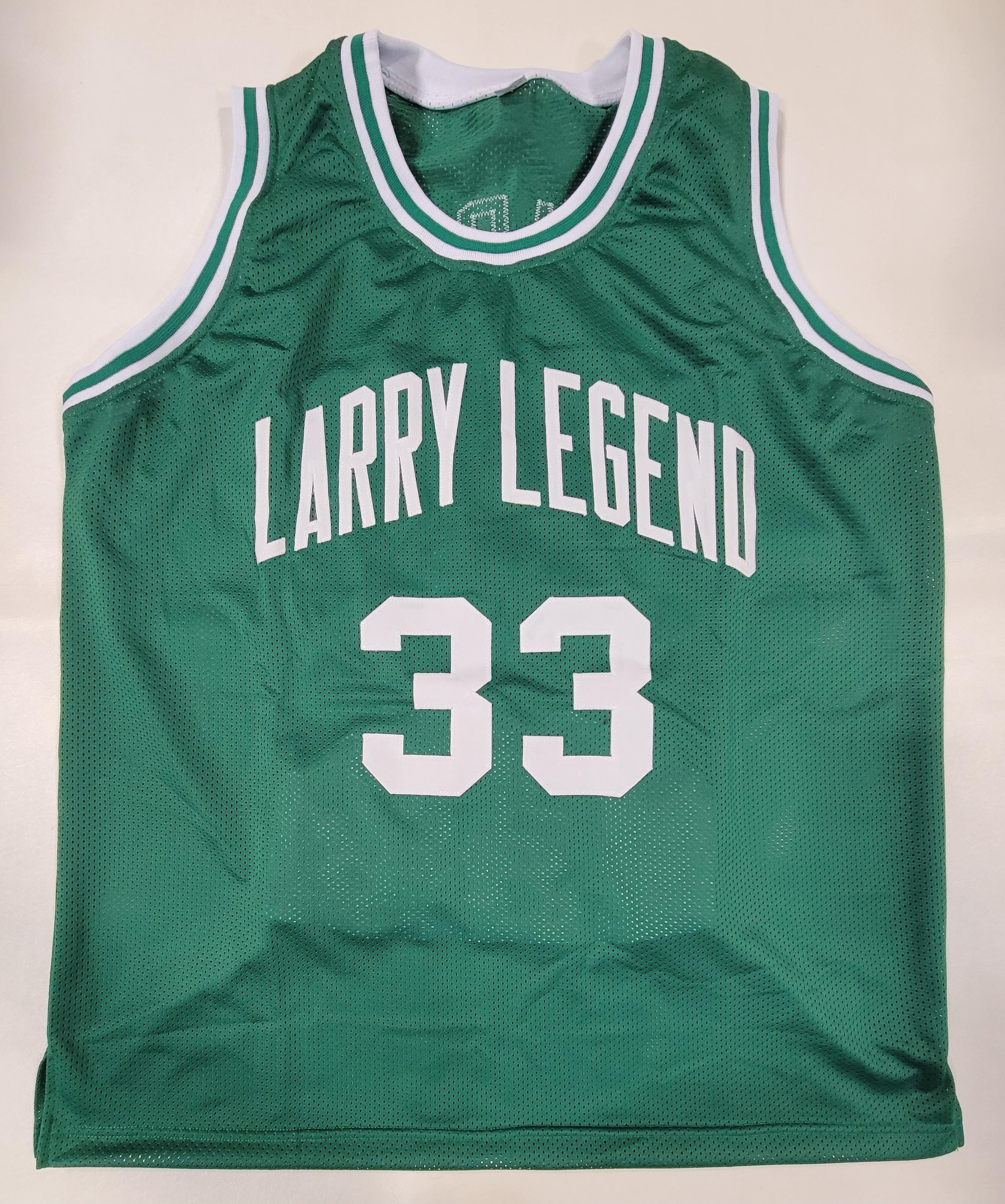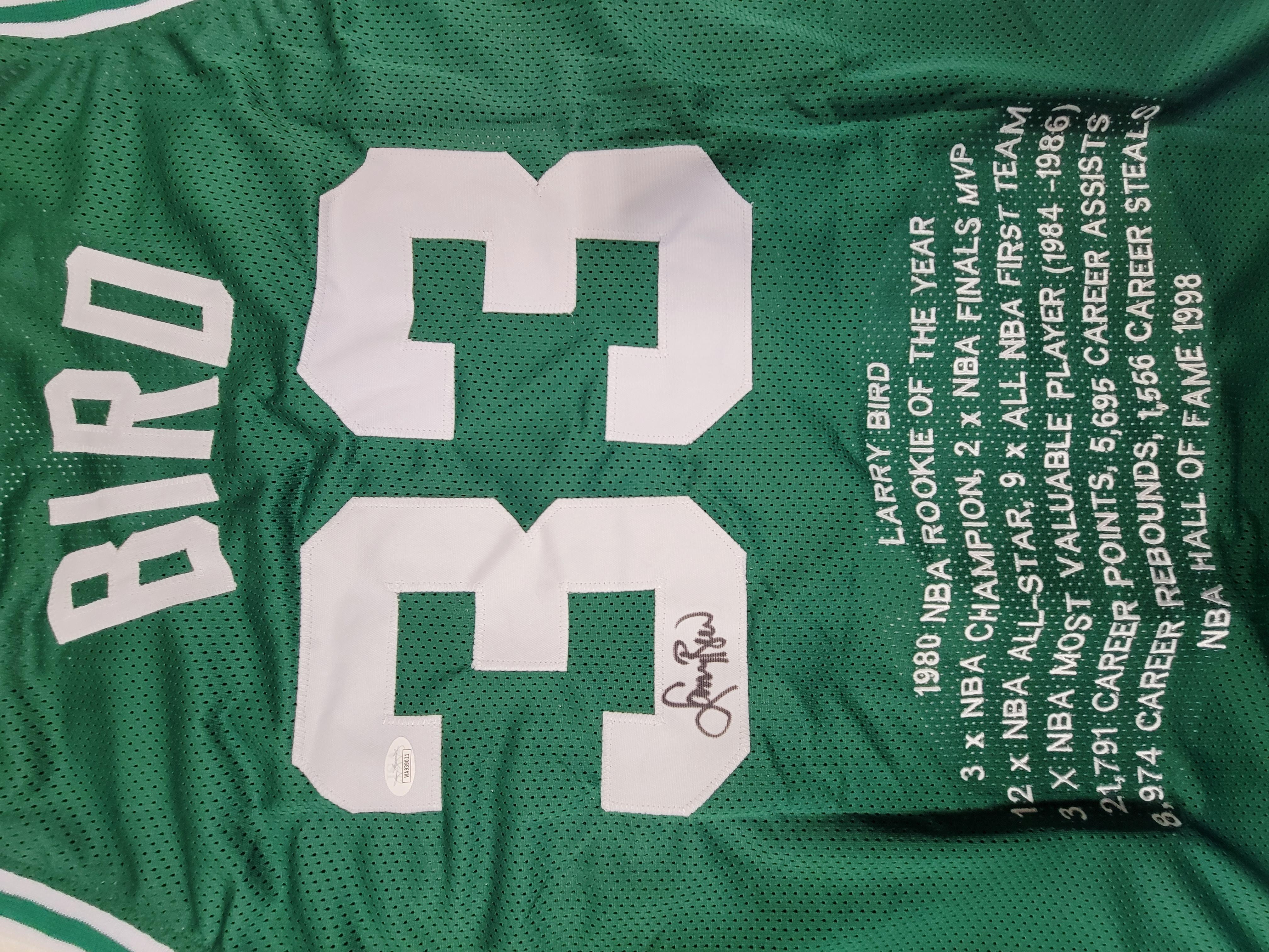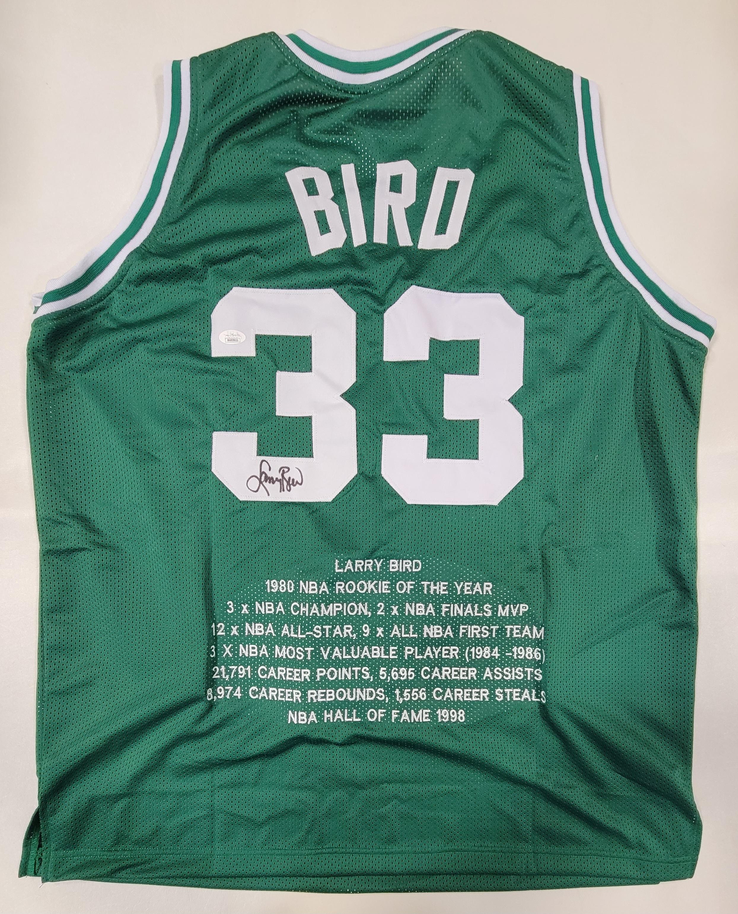 Jersey with everything sewn on, size XL. Hand-signed by Larry Bird (HOF). Bird's career highlights have been custom stitched onto the back of the jersey below the reverse numbers.