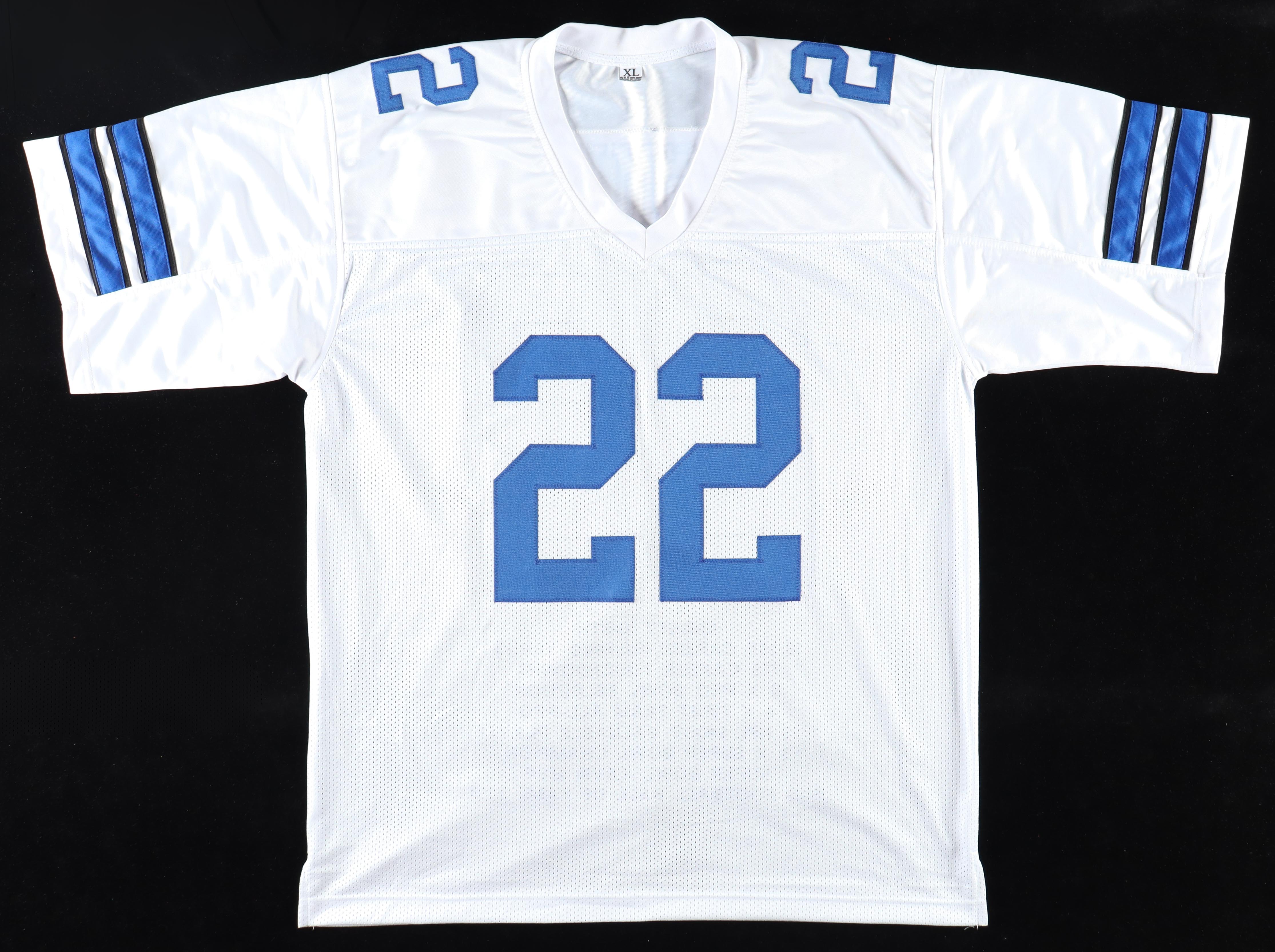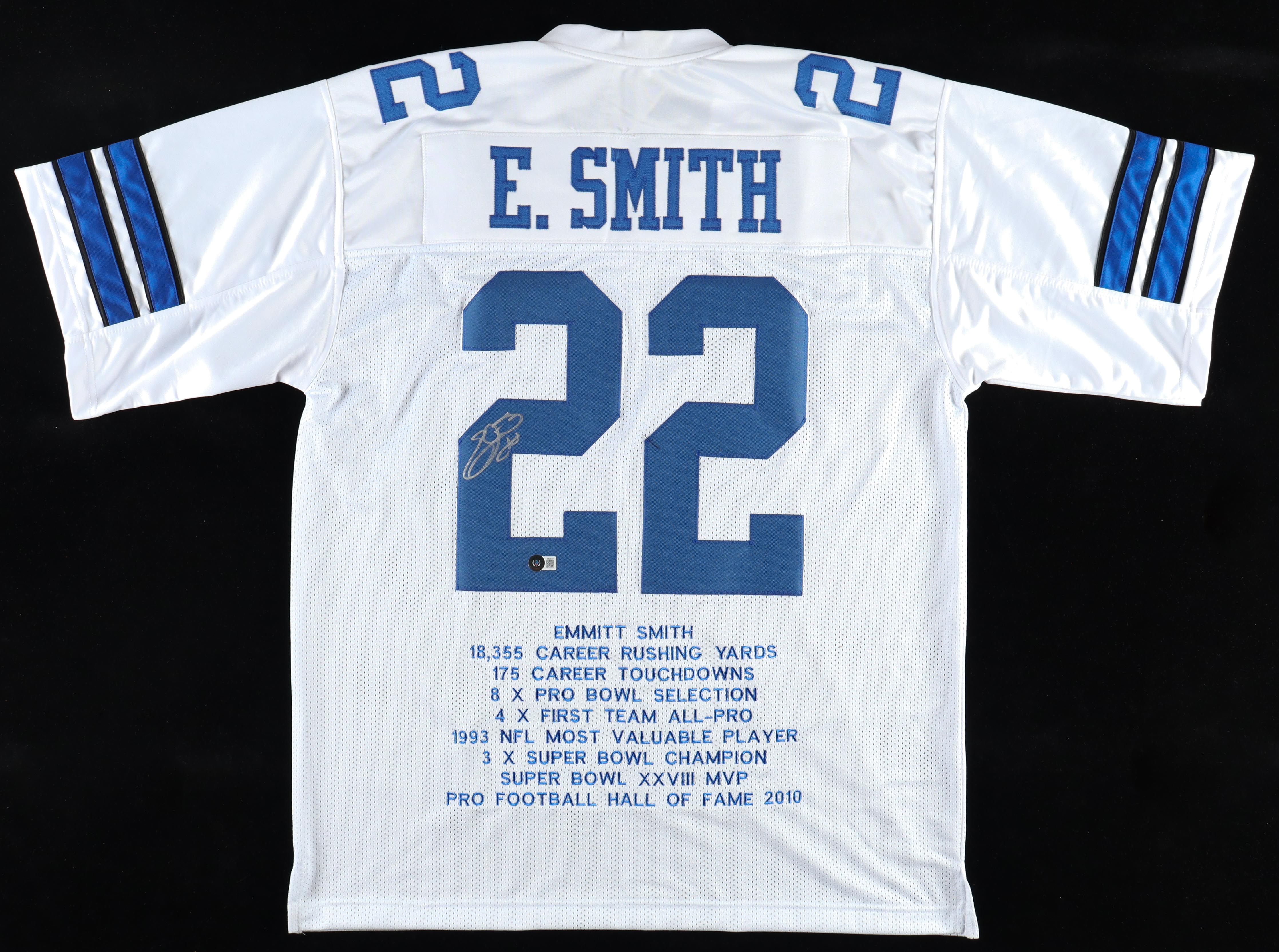 Custom jersey. Everything sewn on, size XL. Hand-signed by Emmitt Smith (HOF). Smith's career highlights have been custom stitched onto the back of the jersey below the reverse numbers.