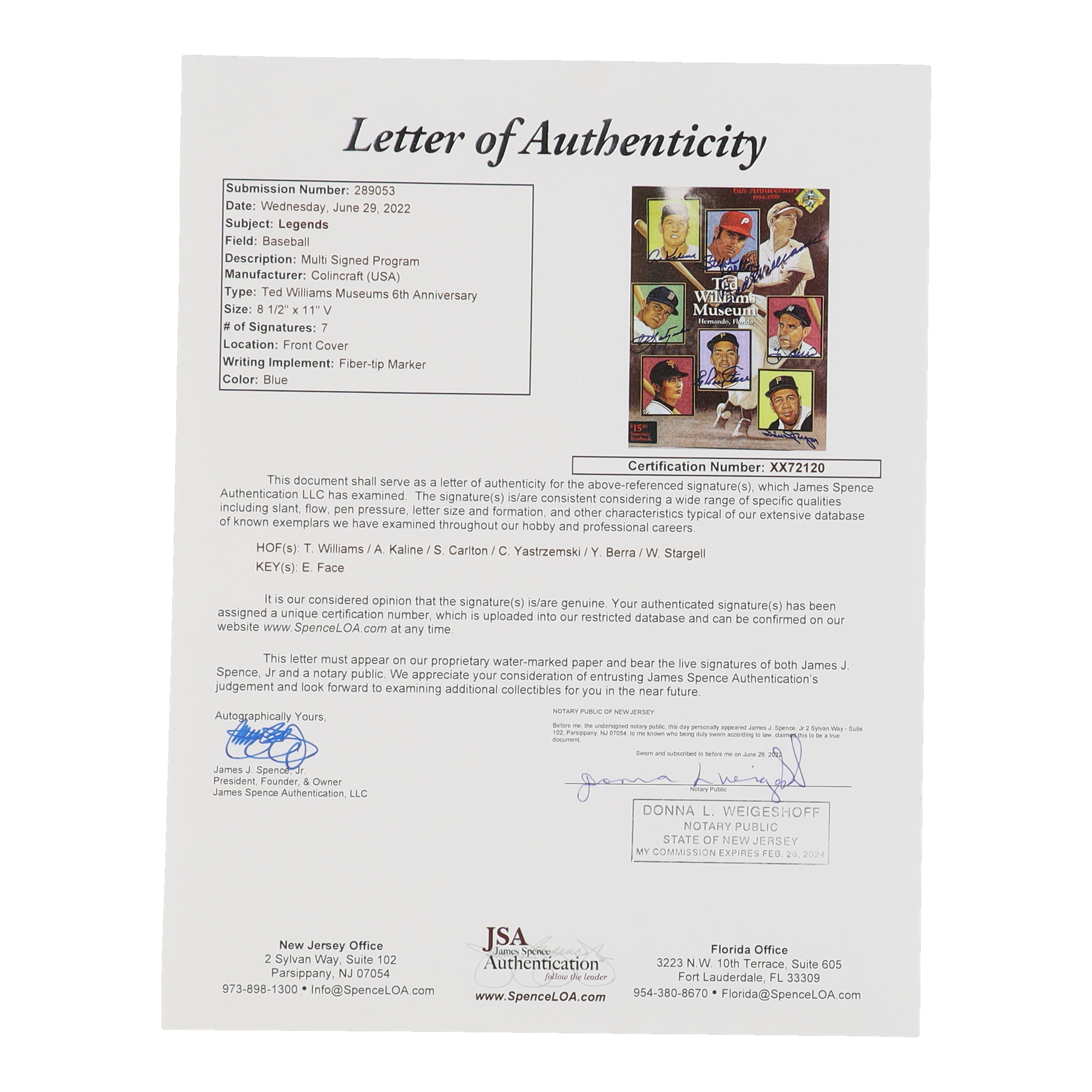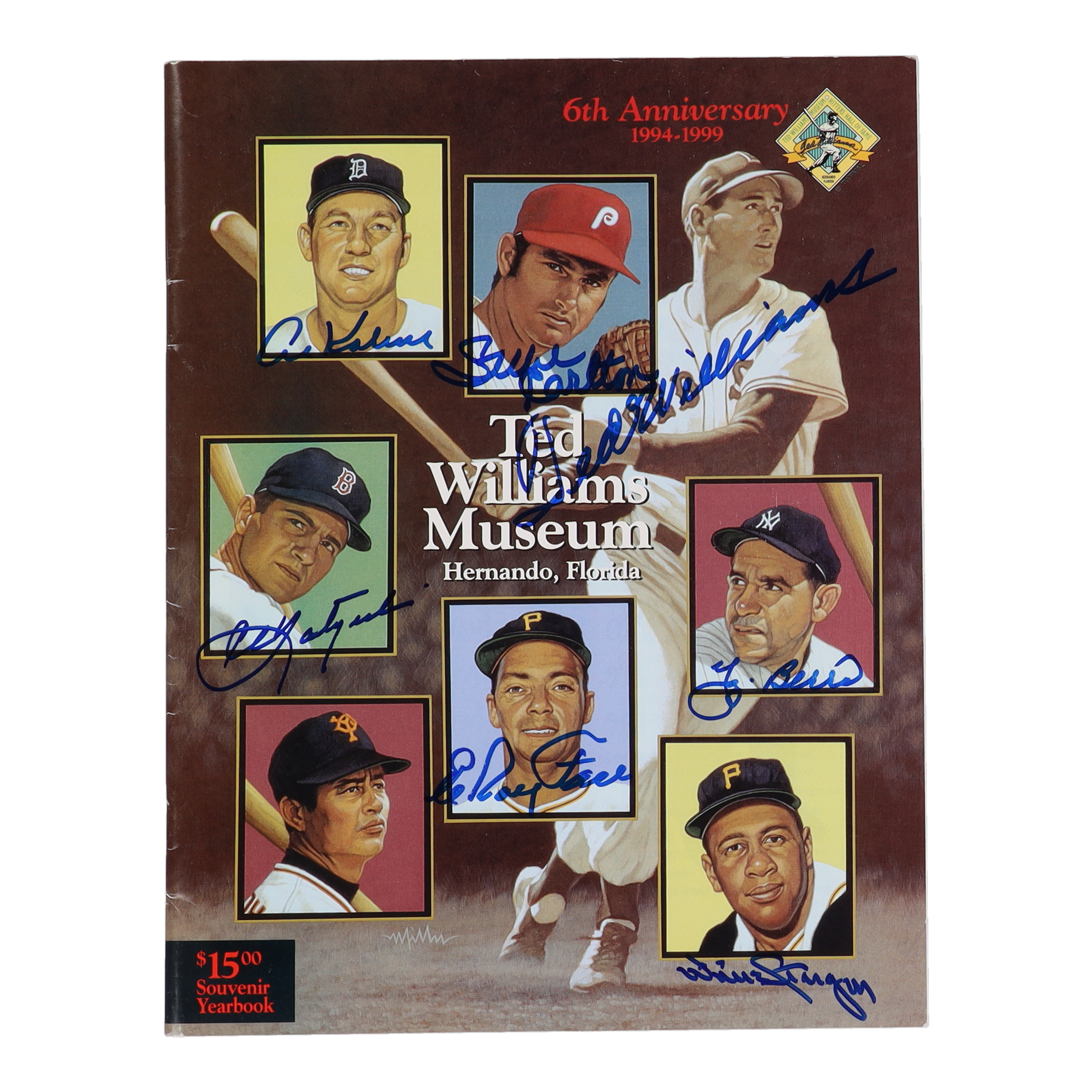 Ted Williams Museum souvenir yearbook has been hand-signed on the front cover by (7), with Ted Williams (D. 2002, Boston Red Sox, HOF), Al Kaline (D. 2020, Detroit Tigers, HOF), Steve Carlton (Philadelphia Phillies, HOF), Carl Yastrzemski (Boston Red Sox, HOF), Yogi Berra (D. 2015, New York Yankees, HOF), Willie Stargell (D. 2001, Pittsburgh Pirates, HOF), and Roy Face (Pittsburgh Pirates).