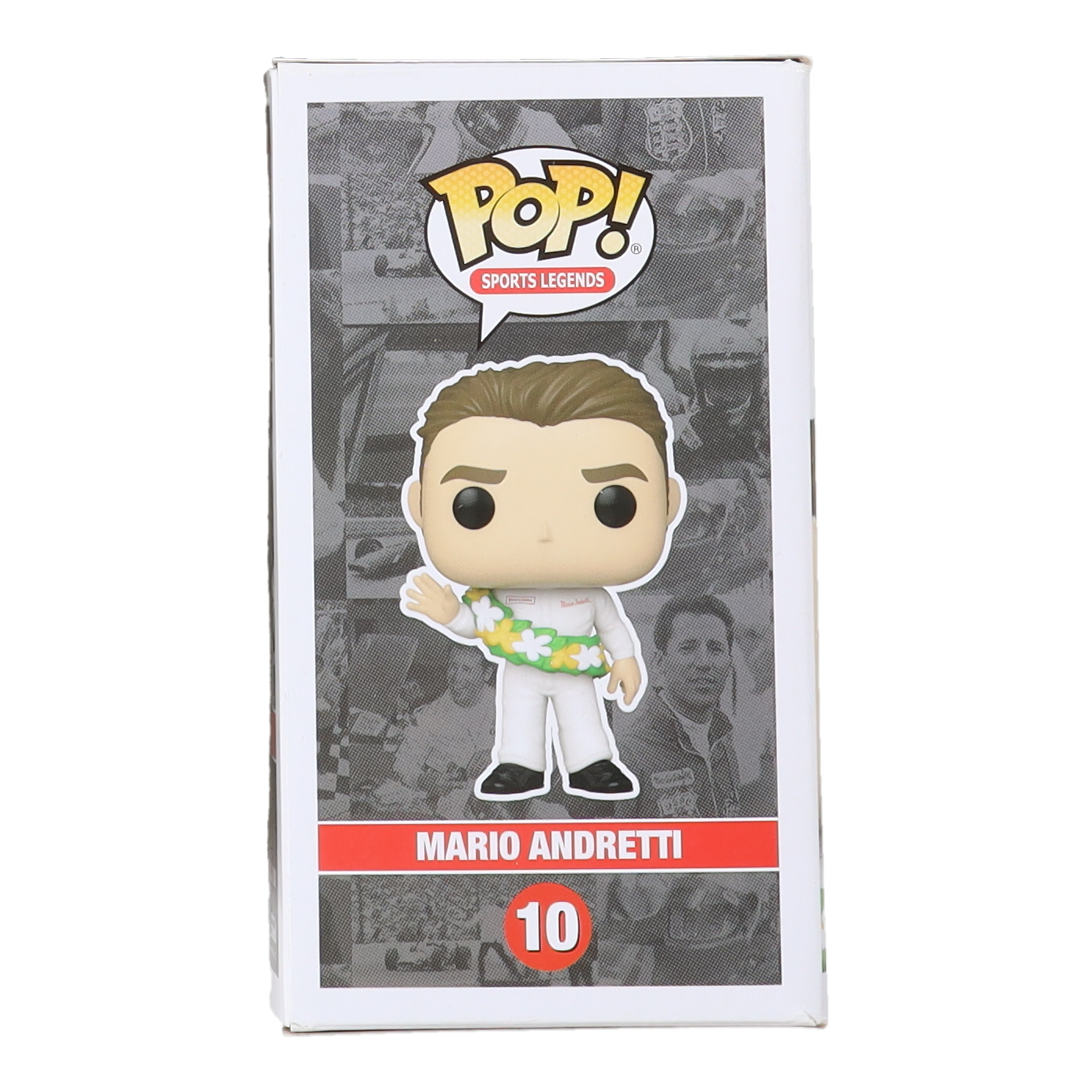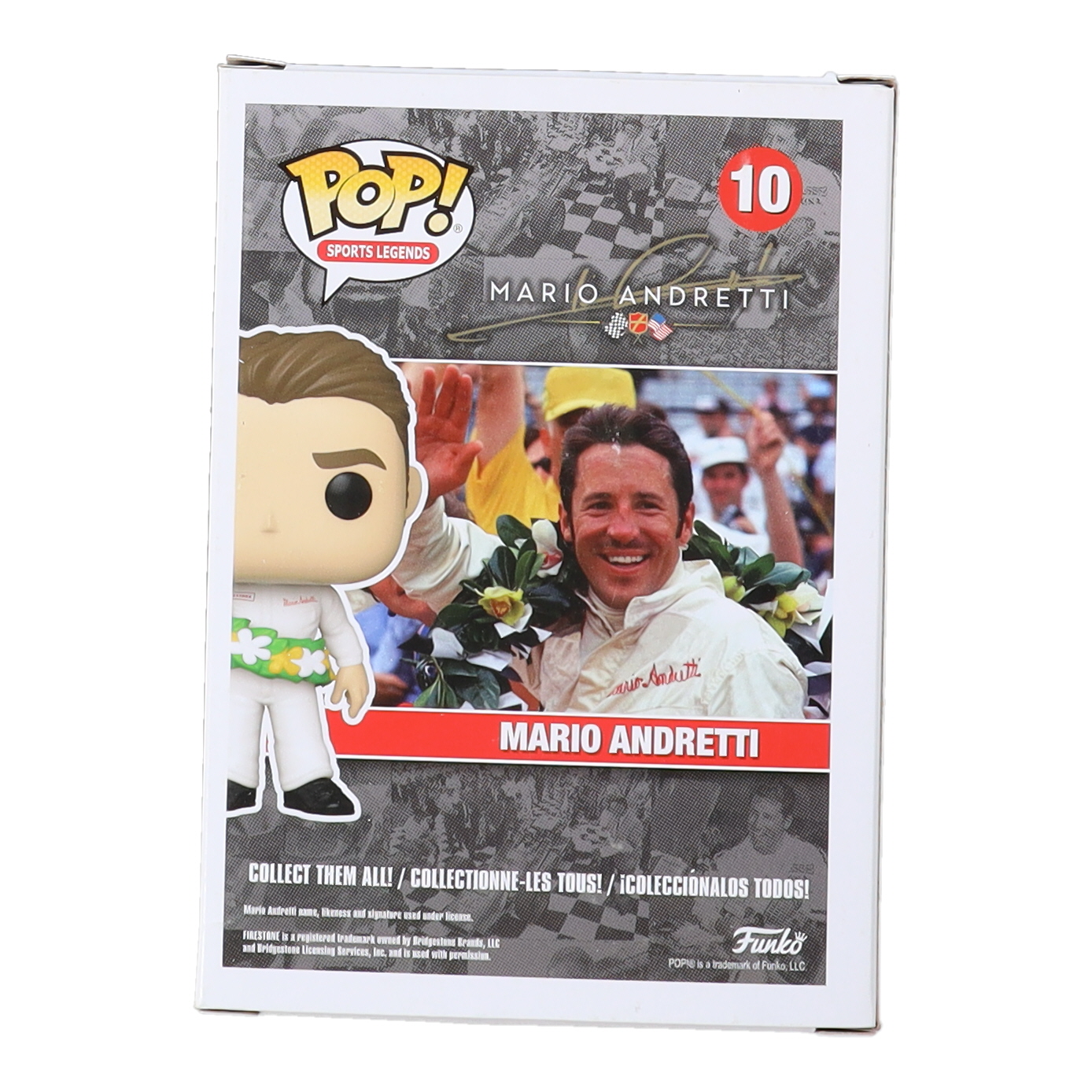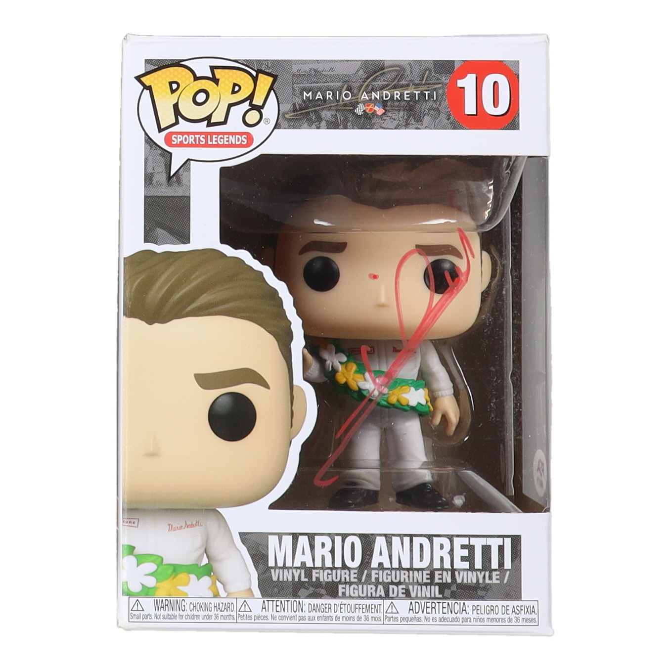 Funko Pop! Vinyl figure measures approximately 4"and has been hand-signed on the packaging by Mario Andretti (HOF).