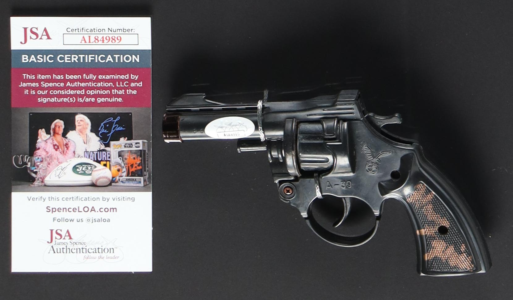 Custom frame measures approximately 17" x 30" in size and features a prop gun that has been hand-signed by Henry Hill (D. 2012). Display also features a movie poster print.