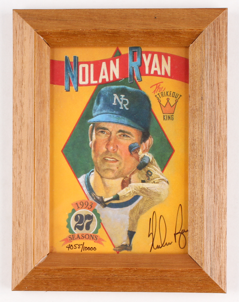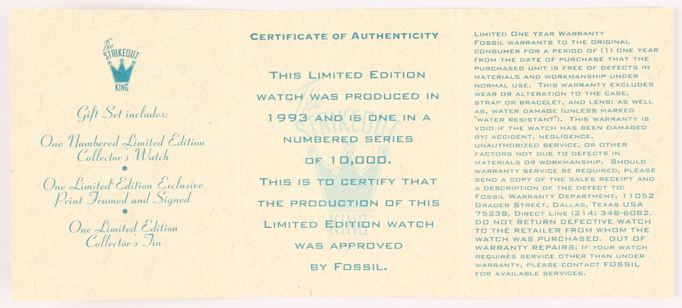 Fossil Commemorative Collectors Watch Set measures 6.5" x 11.5" in size and features a 4.75" x 6.5" custom framed lithograph that has been hand signed in black felt tip pen by Nolan Ryan (Astros HOF). The set also includes a Nolan Ryan 1993 27th Season Commemorative Collectors Fossil Watch and protective case. The set is limited edition and is one of the sequentially numbered, randomly distributed series of 10,000 (#4055/10000), See photos for details.