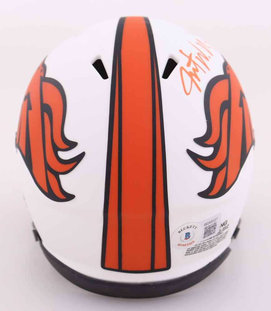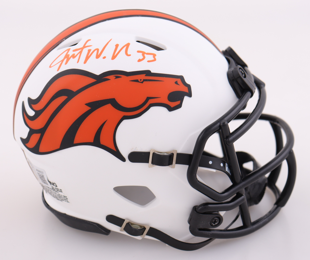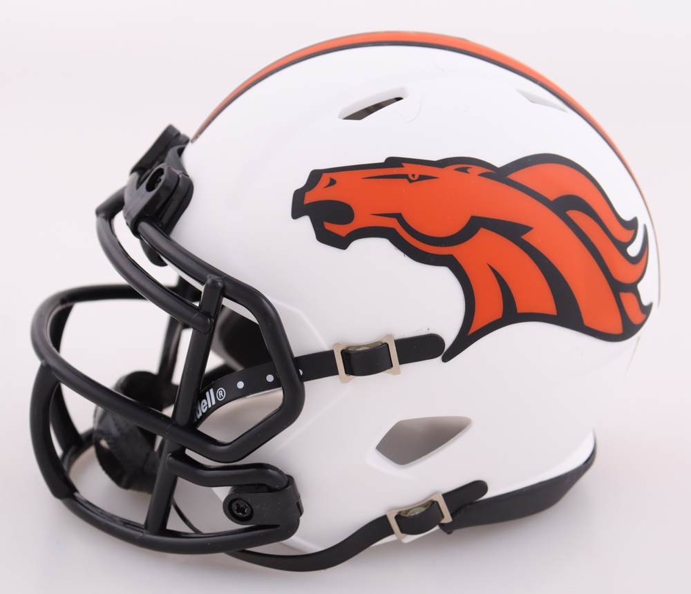 Riddell Denver Broncos lunar eclipse alternate speed mini helmet. Has been hand-signed by Javonte Williams. Please note, there is a scratch on the side opposite the autograph.