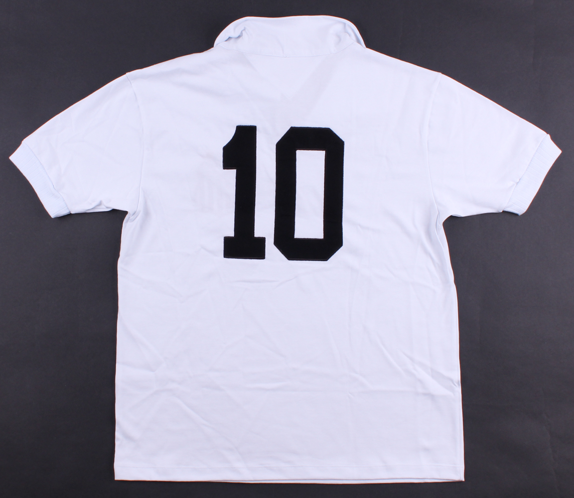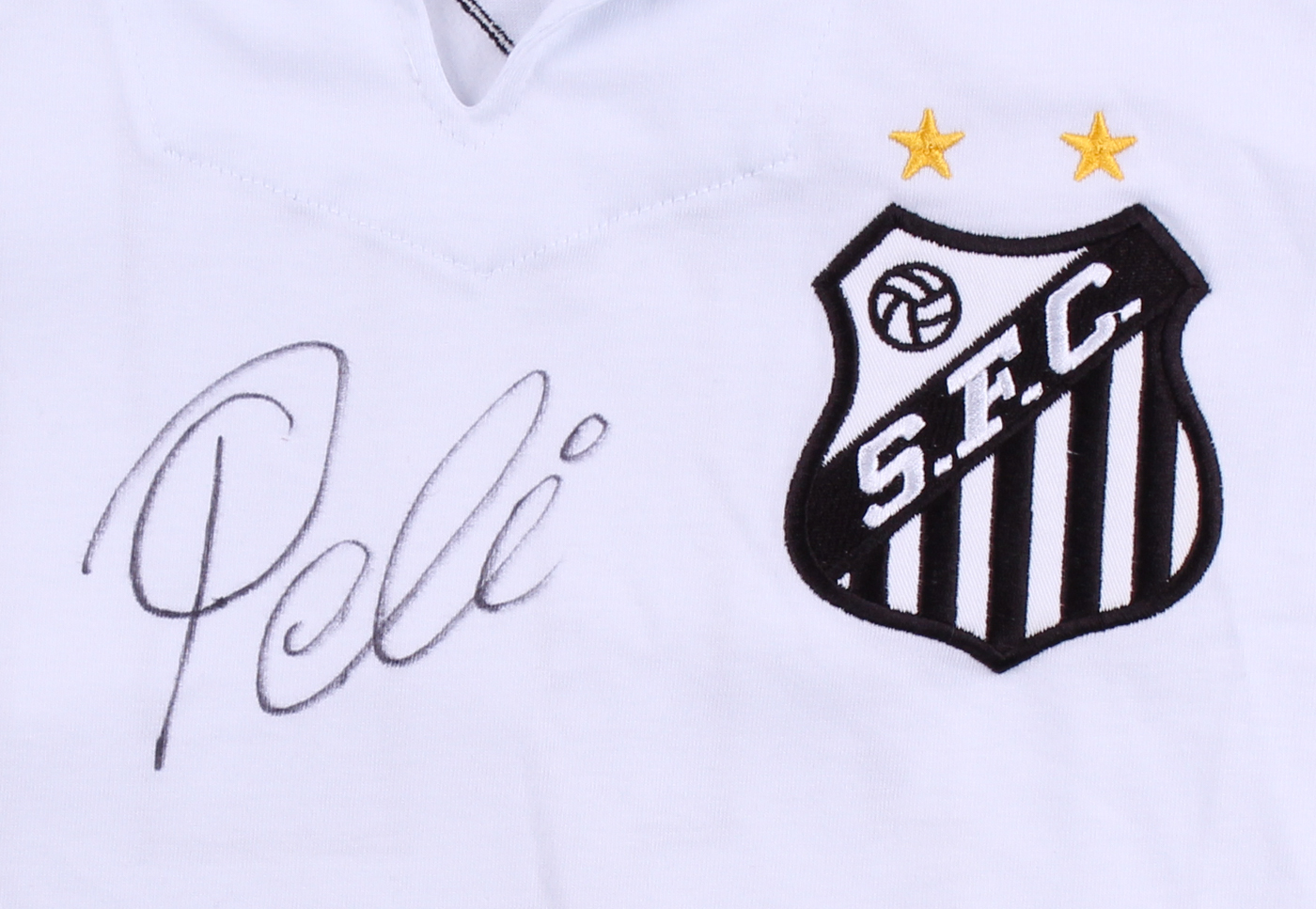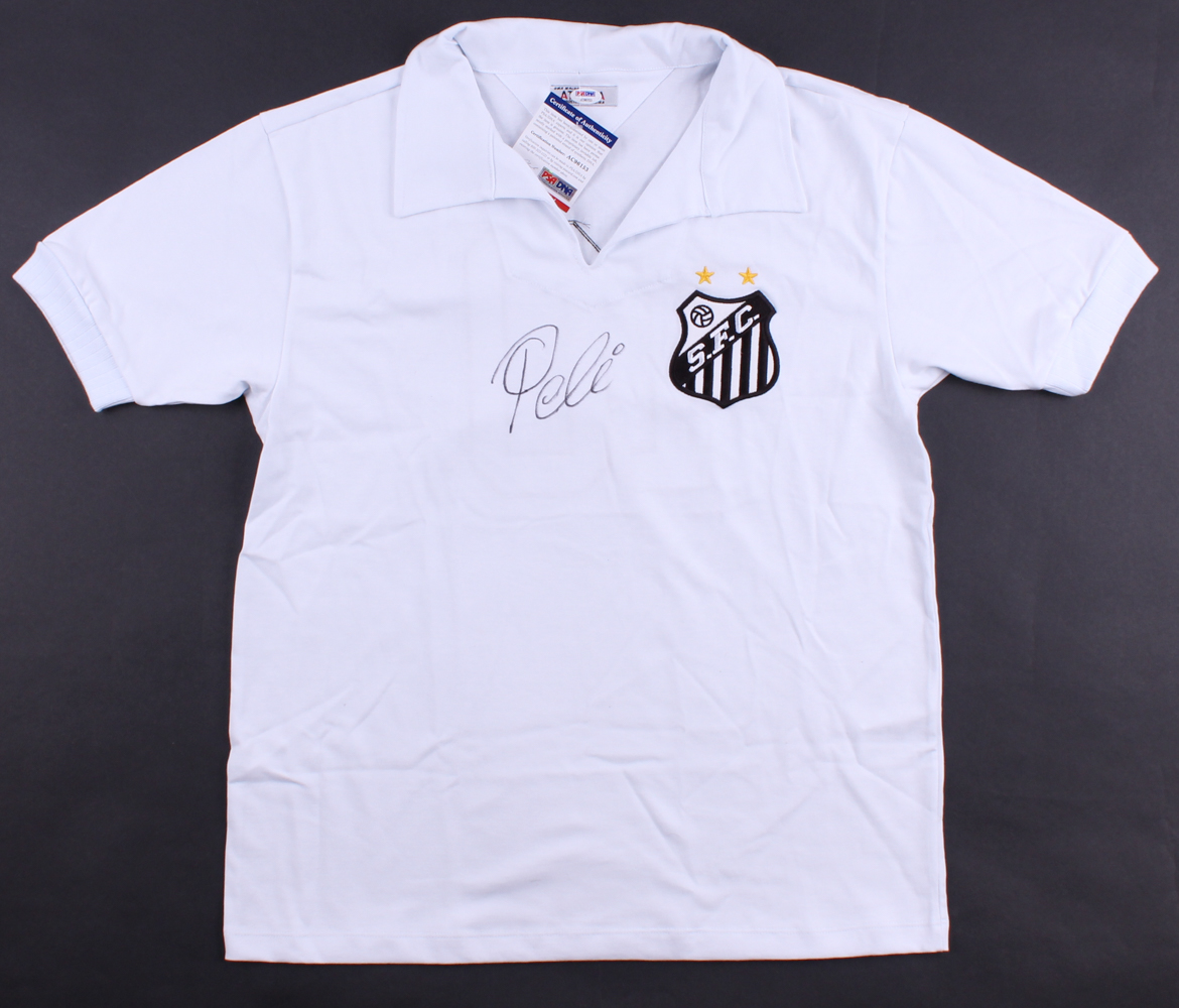 Santos throwback replica jersey hand-signed in black felt tip pen by Pele.
