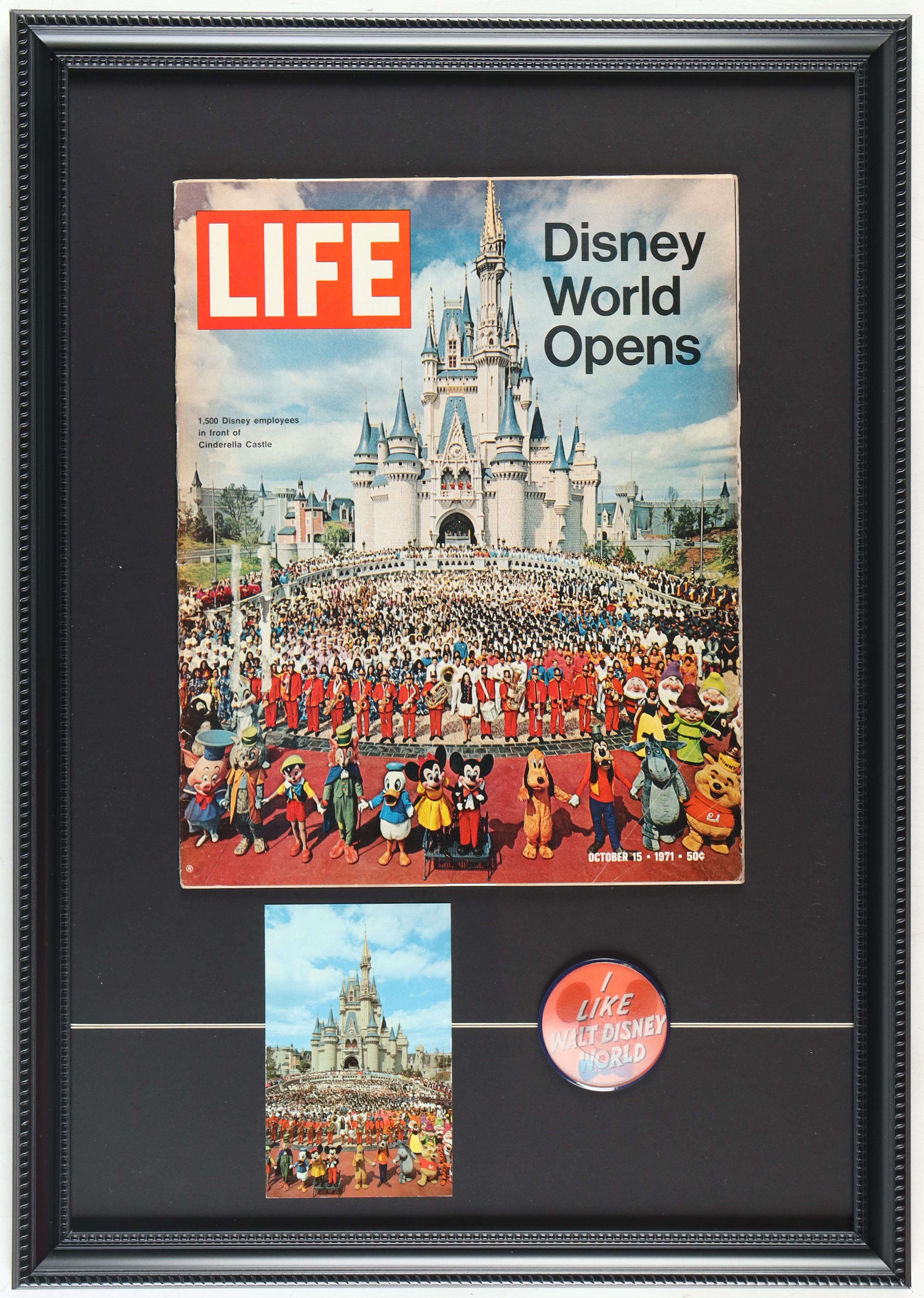 1971 Disney World Opens "Life" Custom Framed Magazine Display with Disney World Opening Day Postcard & Mickey Pin