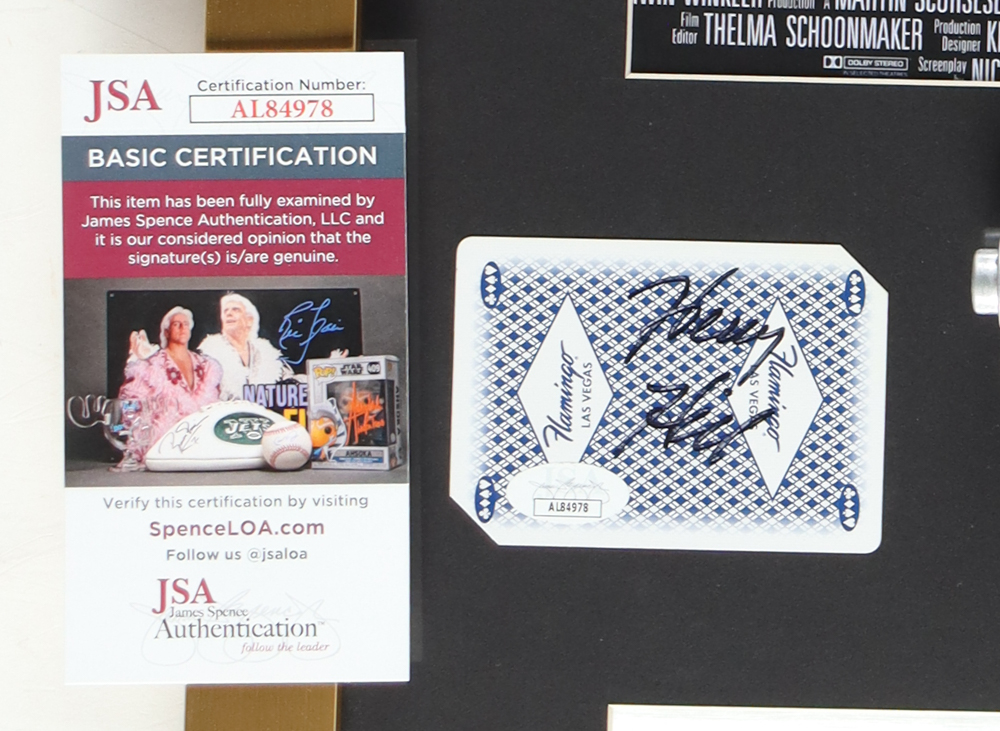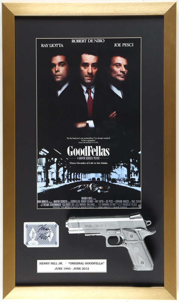 Custom frame measures approximately 18" x 30" in size and features a playing card that has been hand-signed by Henry Hill (D. 2012). Display also features movie poster print and replica prop pistol.