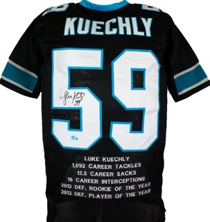 Jersey with everything sewn on, size XL. Hand-signed by Luke Kuechly. Kuechly career highlights have been custom stitched onto the back of the jersey below the reverse numbers.