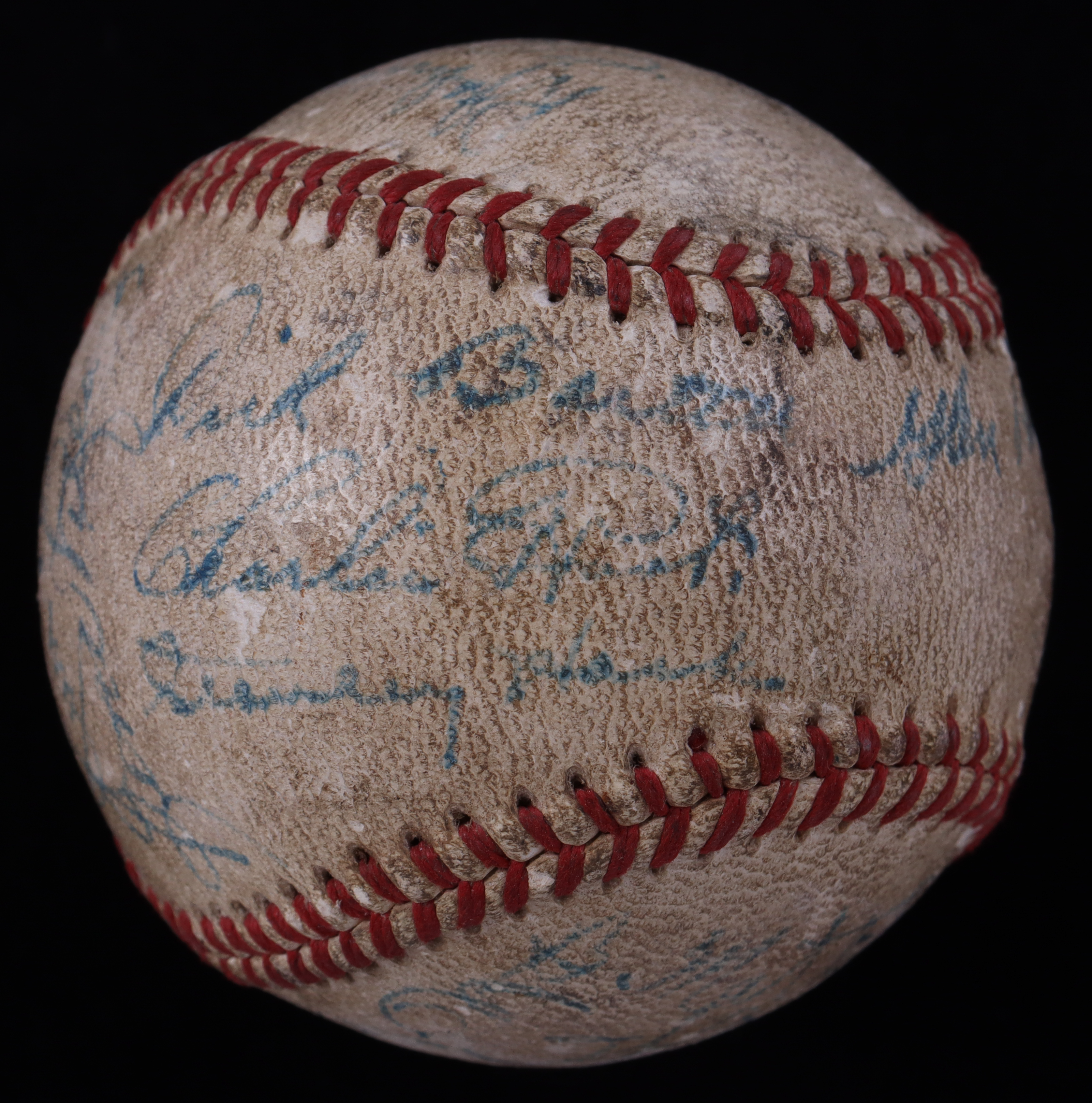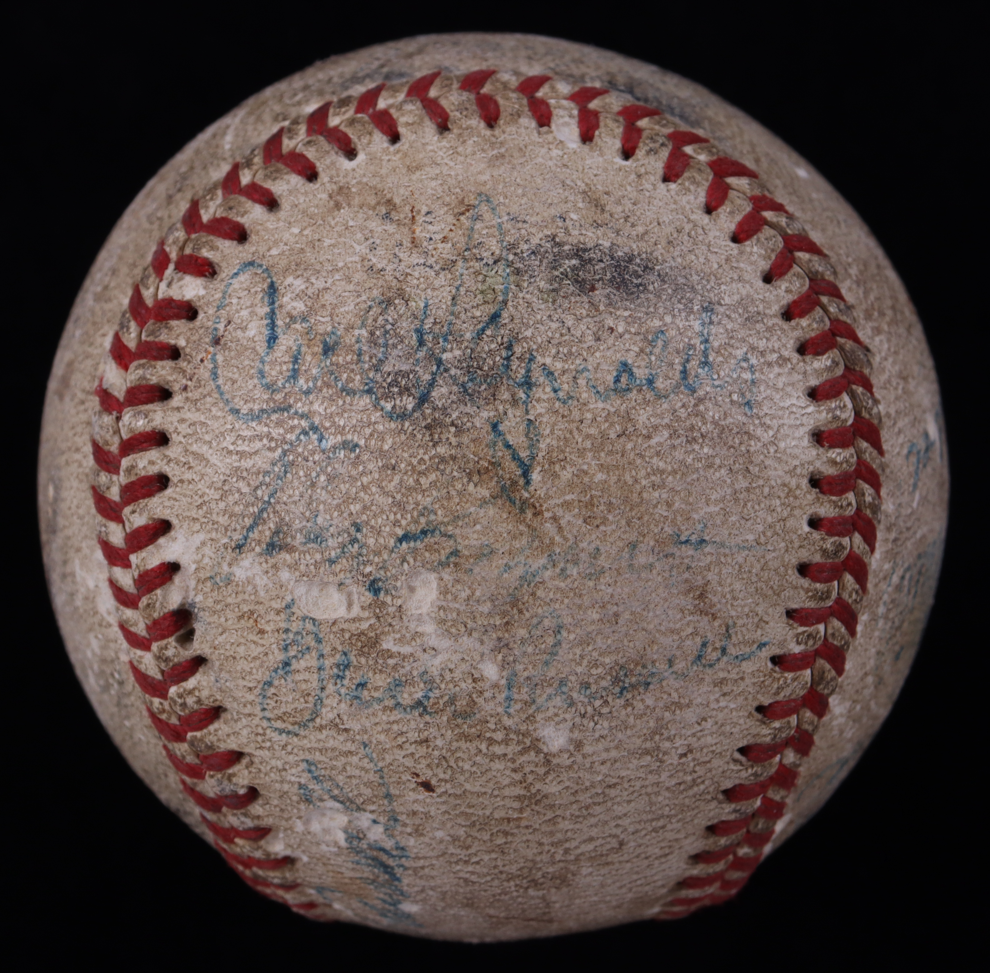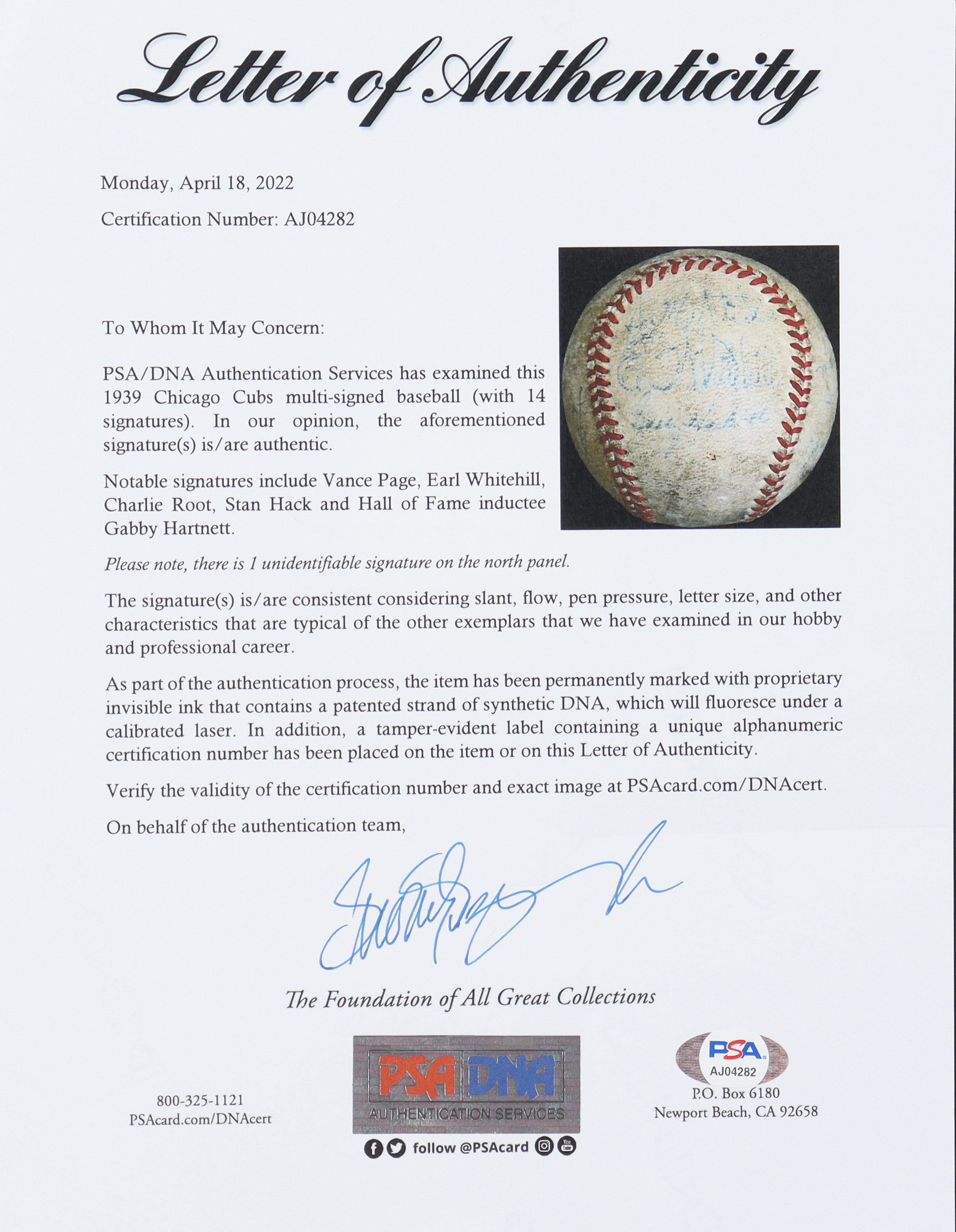 Baseball has been team-signed by (16) members of the 1939 Chicago Cubs team! This ball features many great names such as Gabby Hartnett (HOF) and Stan Hack. The full list of signers on the baseball include Gabby Hartnett, Stan Hack, Dick Bartell, Clay Bryant, Jim Gleeson, Gene Lillard, Bobby Mattick, Vance Page, Carl Reynolds, Charlie Root, Jack Russell, Rip Russell, and Earl Whitehill.