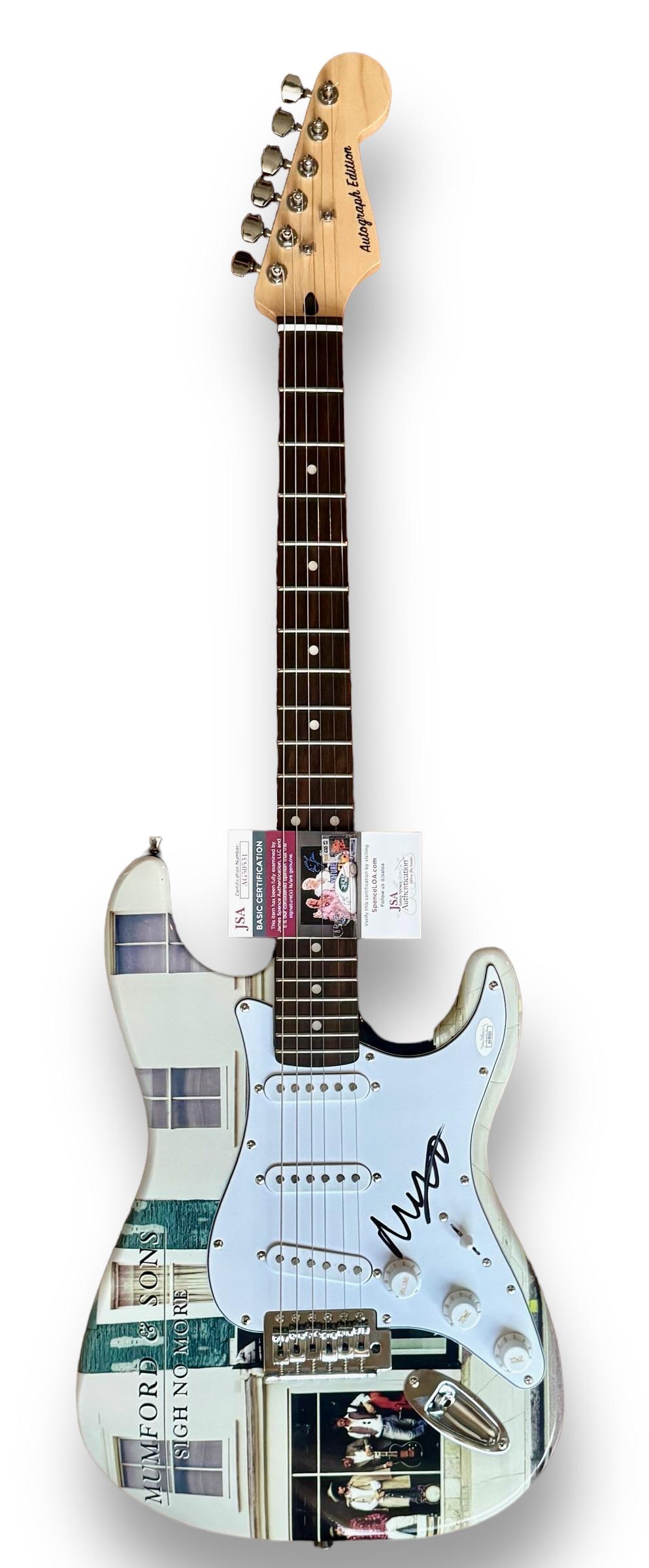 Custom Autograph Edition Stratocaster style electric guitar measures approximately 39" in length and has been hand-signed on the pickguard by Marcus Mumford.