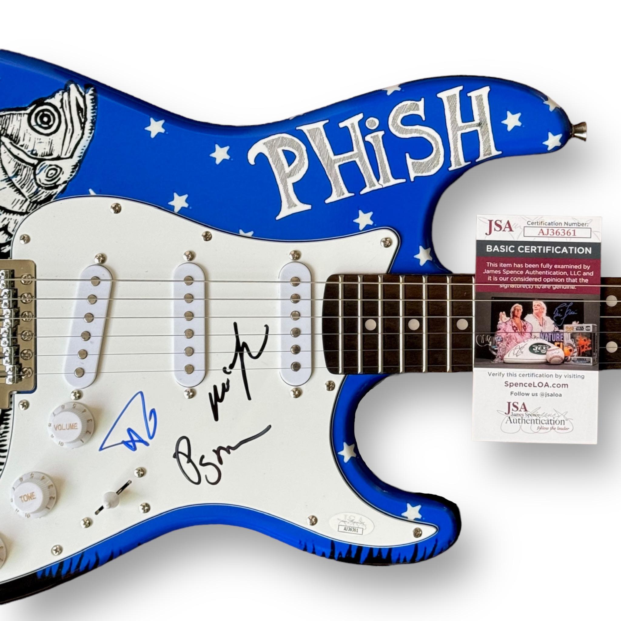 Custom Autograph Edition Stratocaster style electric guitar measures approximately 39" in length and has been hand-signed on the pickguard by Trey Anastasio (lead singer & guitarist), Page McConnell (lead keyboardist), and Mike Gordon (lead bassist).
