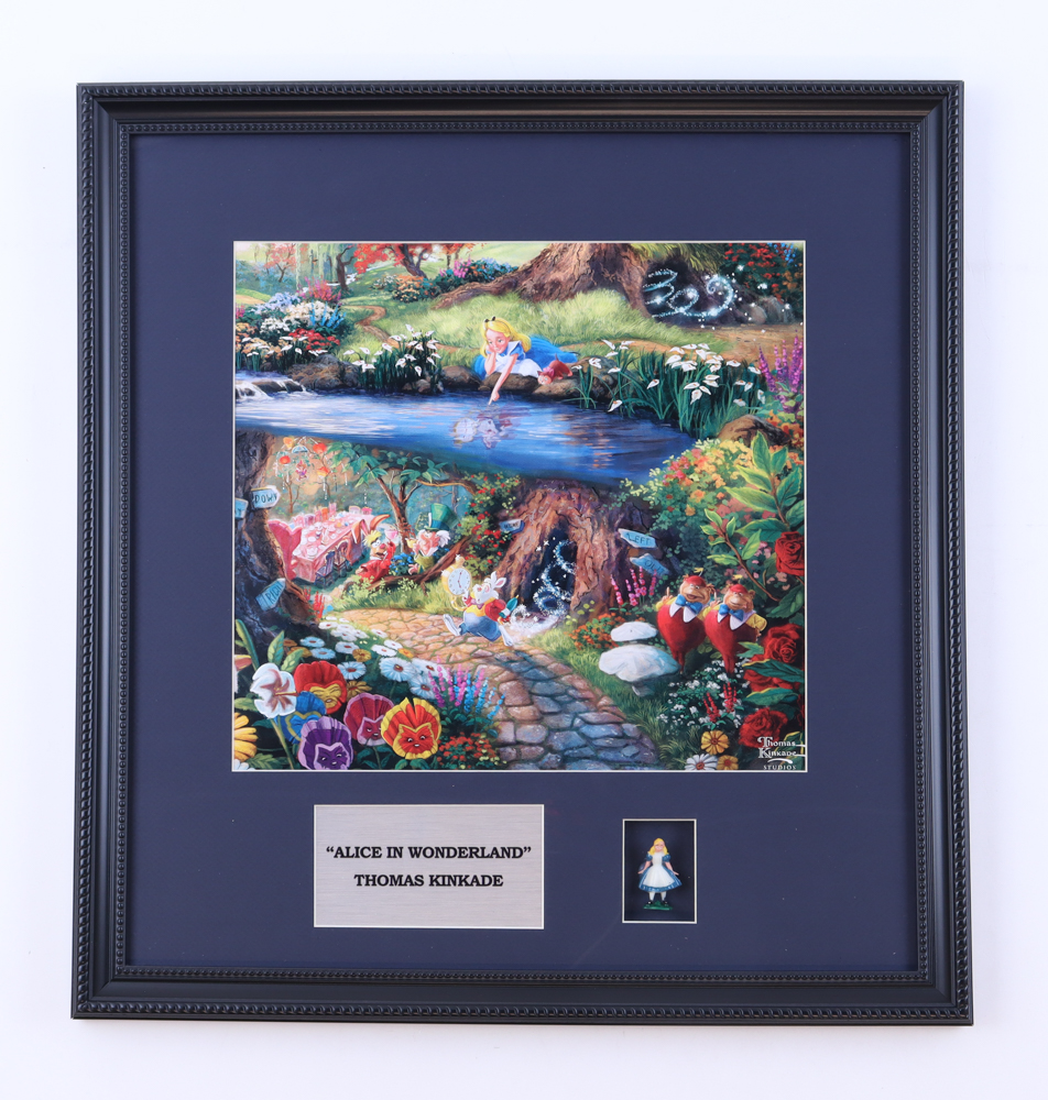 Custom frame measures approximately 18" x 19" in size. Features a Thomas Kinkade "Alice In Wonderland" print. Includes 1960 Disney Ceramic Hand Painted Alice Figure. Please note, the item is unsigned.
