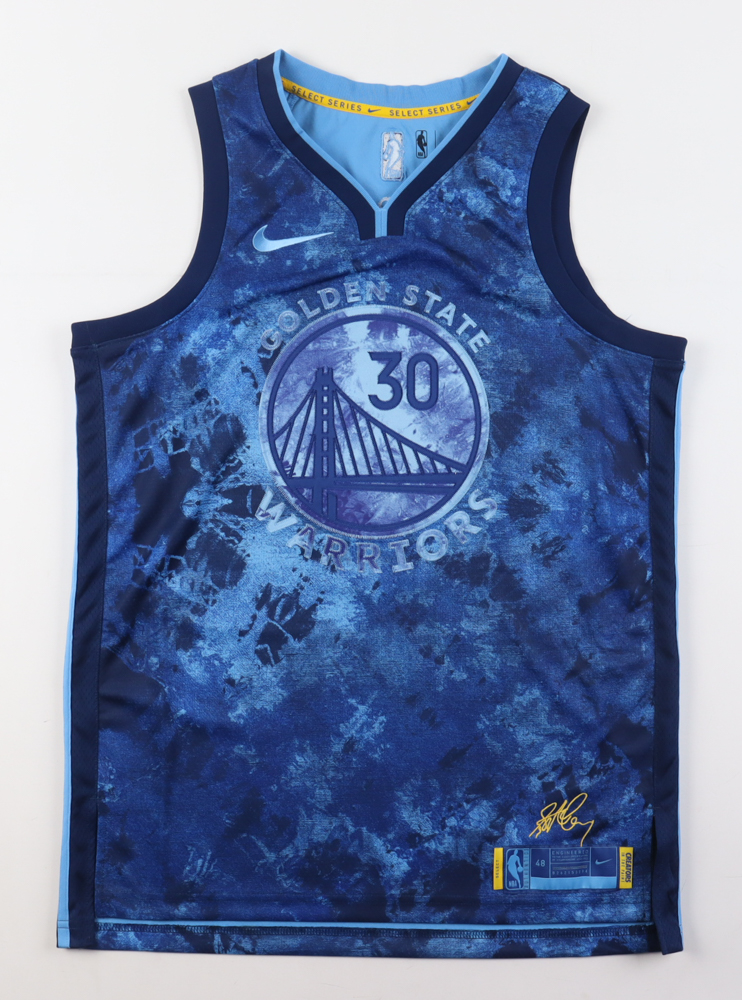 Custom with everything sewn on, size 48. Hand-signed by Stephen Curry.