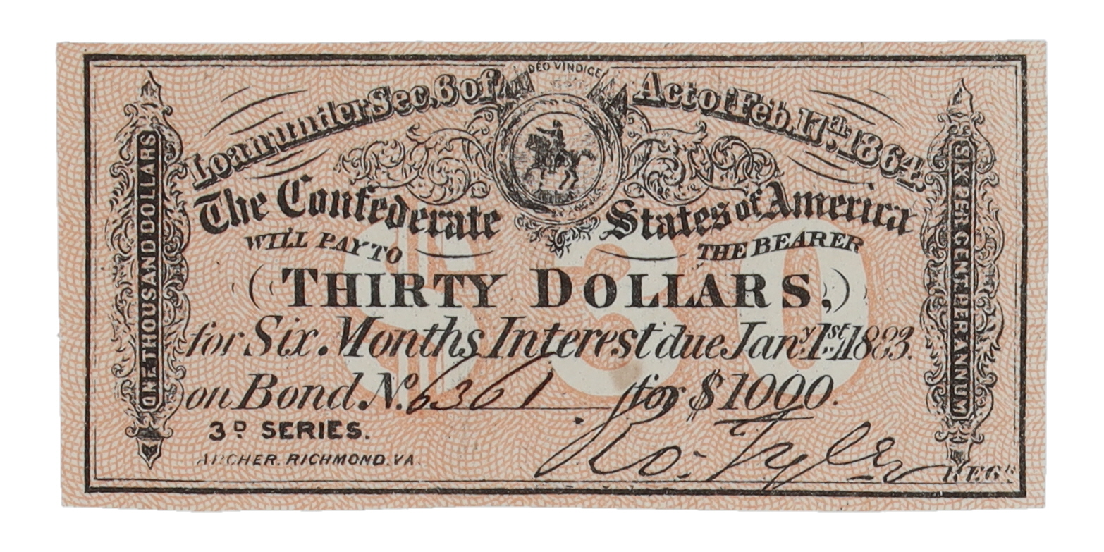 1864 $30 Thirty Dollars Confederate States of America Richmond CSA Bank Note Bond