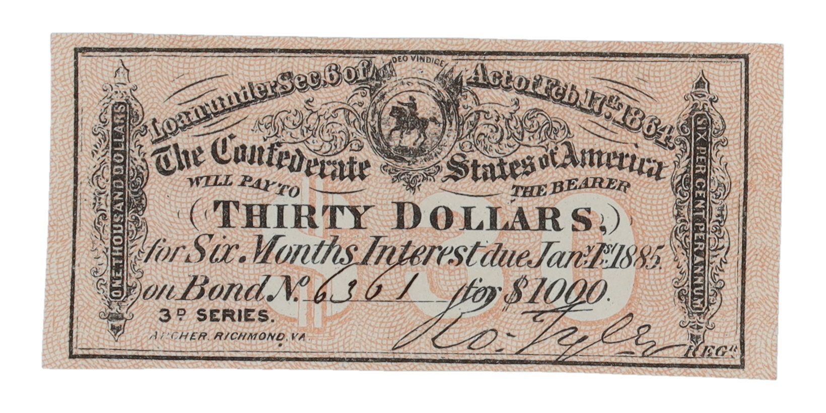 1864 $30 Thirty Dollars Confederate States of America Richmond CSA Bank Note Bond