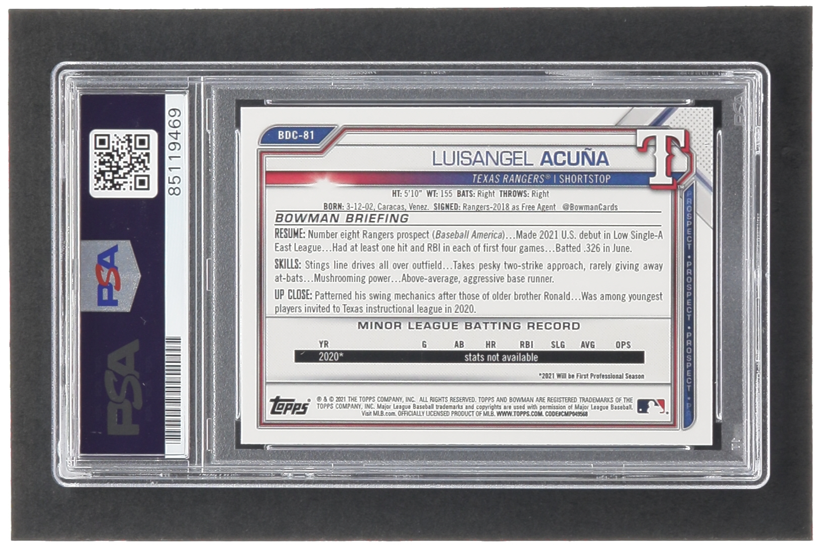 Luisangel Acuna Signed 2021 Bowman Chrome Draft #BDC81 RC (PSA)