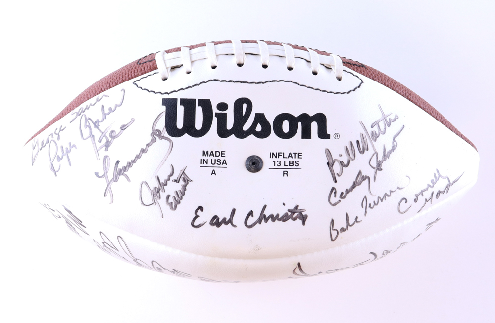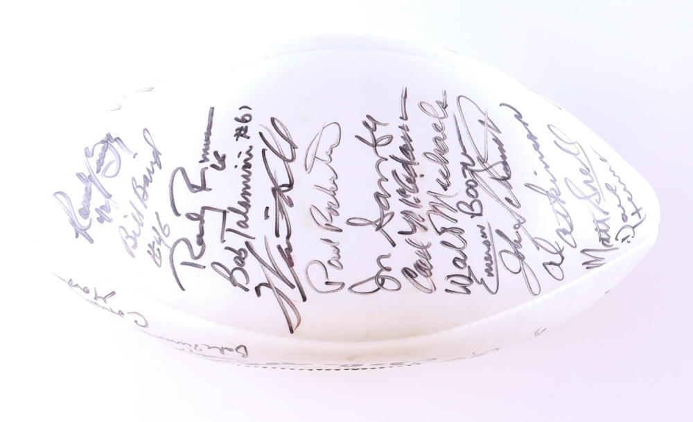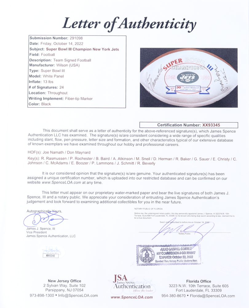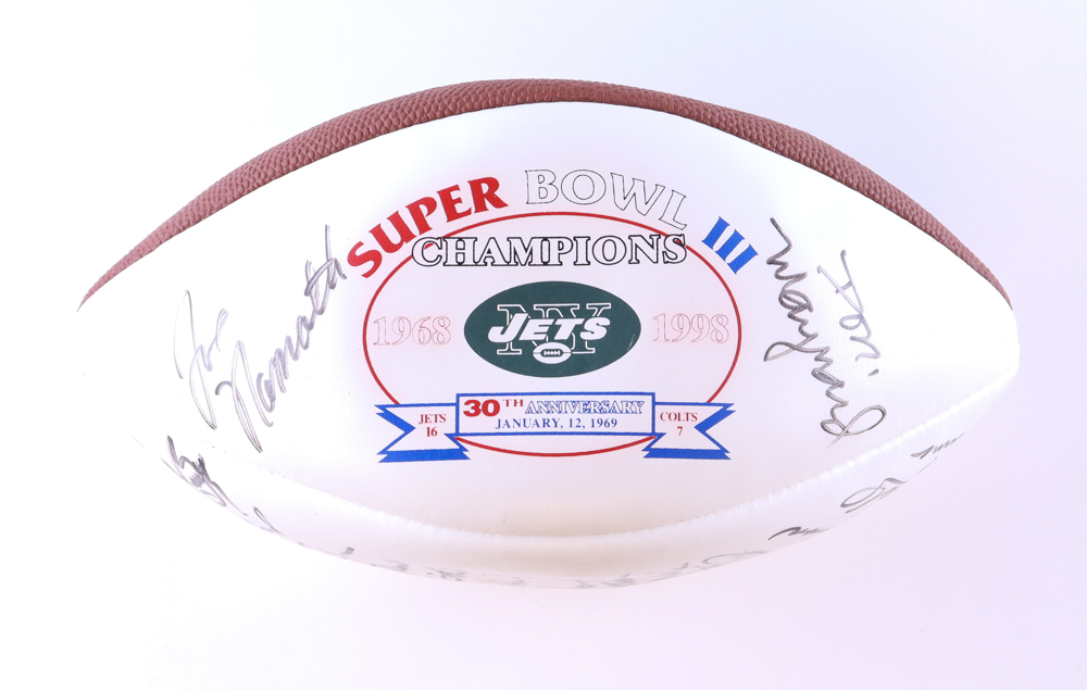 Wilson Official Super Bowl III Jets Logo football has been hand-signed by (24) members of the 1969 New York Jets Super Bowl Championship team including Joe Namath, Don Maynard, Randy Rasmussen, Paul Rochester, Bill Baird, Al Atkinson, Matt Snell, Dave Herman, Ralph Baker, George Sauer Jr., Earl Christy, Cornell Johnson, Carl McAdams, Emerson Boozer, Pete Lammons, John Schmitt, Richard Beverly and (6) others. Please note, the football does not hold air. See photos for more details.