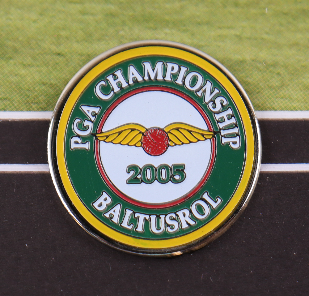 Custom frame measures approximately 13.25" x 16.25" in size and features a photo of Phil Mickelson (HOF). The display also includes a 2005 Baltusrol PGA Championship Pin. Please note, the display is unsigned.
