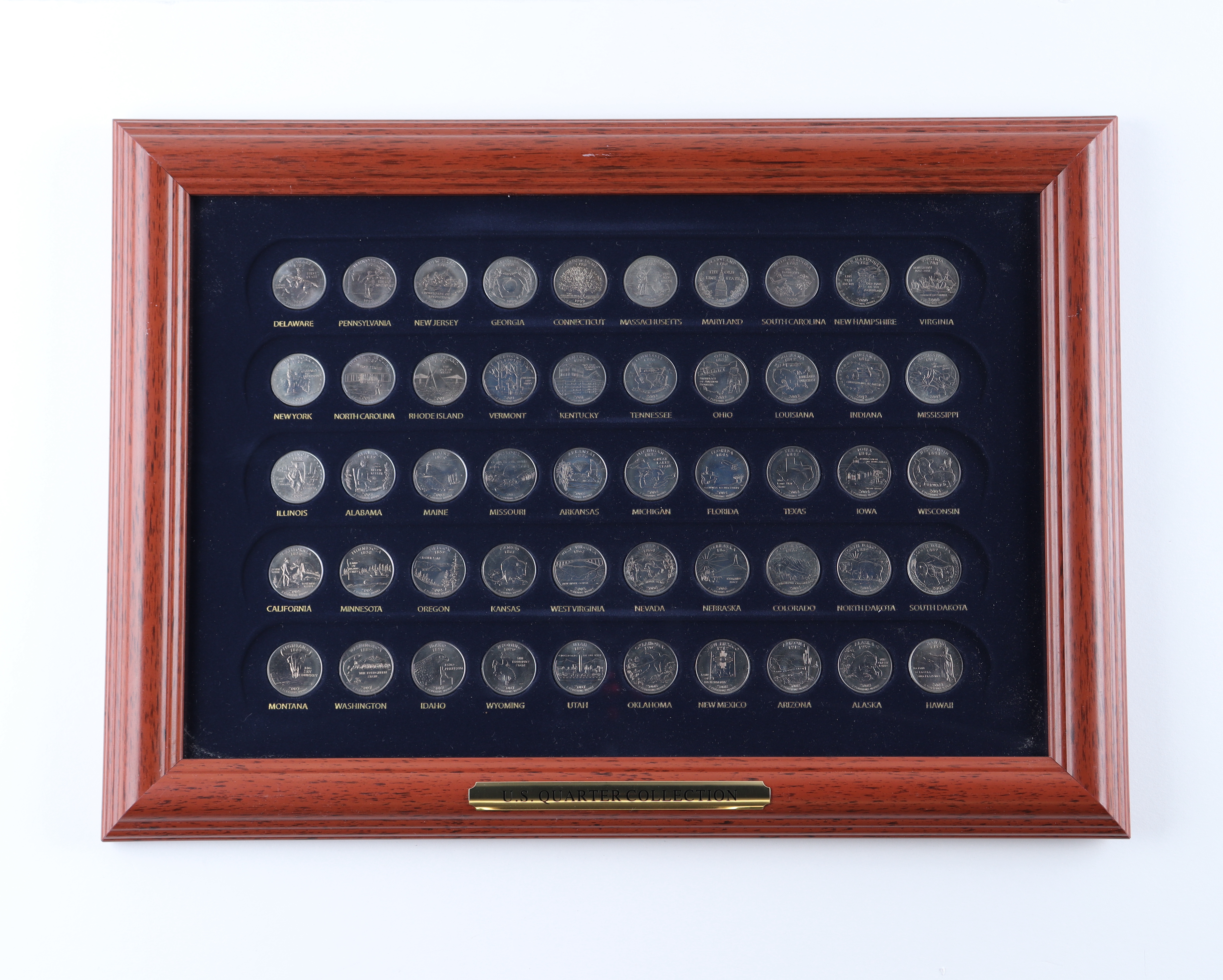 Custom frame measures 12" x 17" in size and features (50) U.S. quarters from each state. Please see photo for more details regarding the condition of the frame.