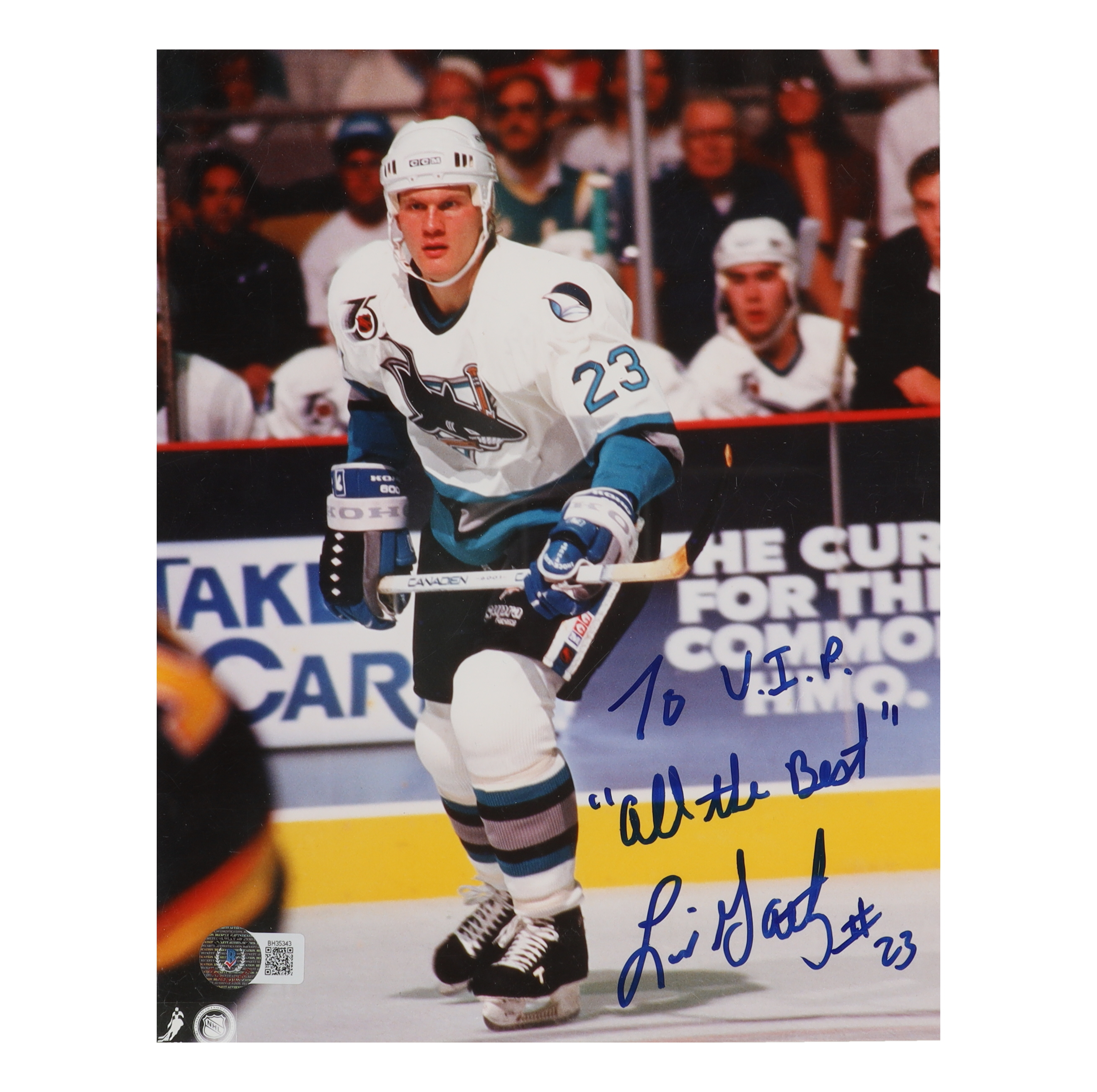 Photo measures 8" x 10" in size and has been hand-signed and inscribed by Link Gaetz (San Jose Sharks). Please note, the photo is personalized to "VIP".