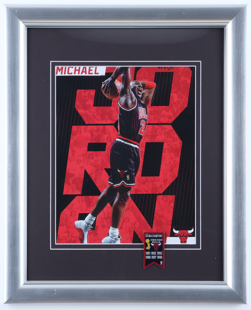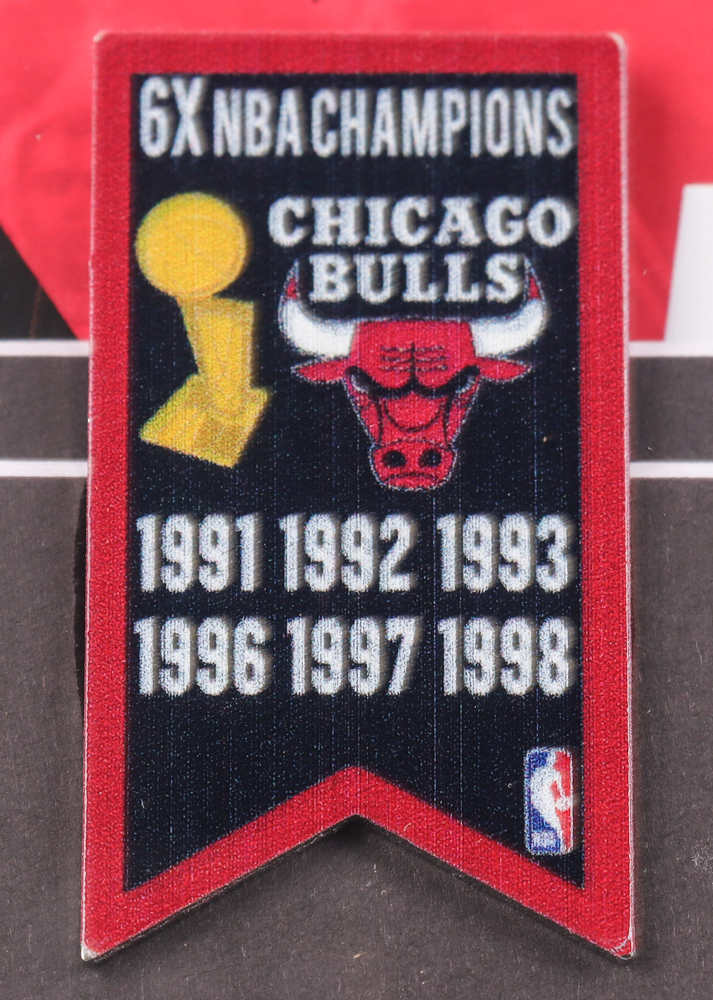 Custom frame measures approximately 13" x 16" in size. Features a photo of Michael Jordan (HOF). and also includes a 6x Championship Banner pin. Please note, the display is unsigned.